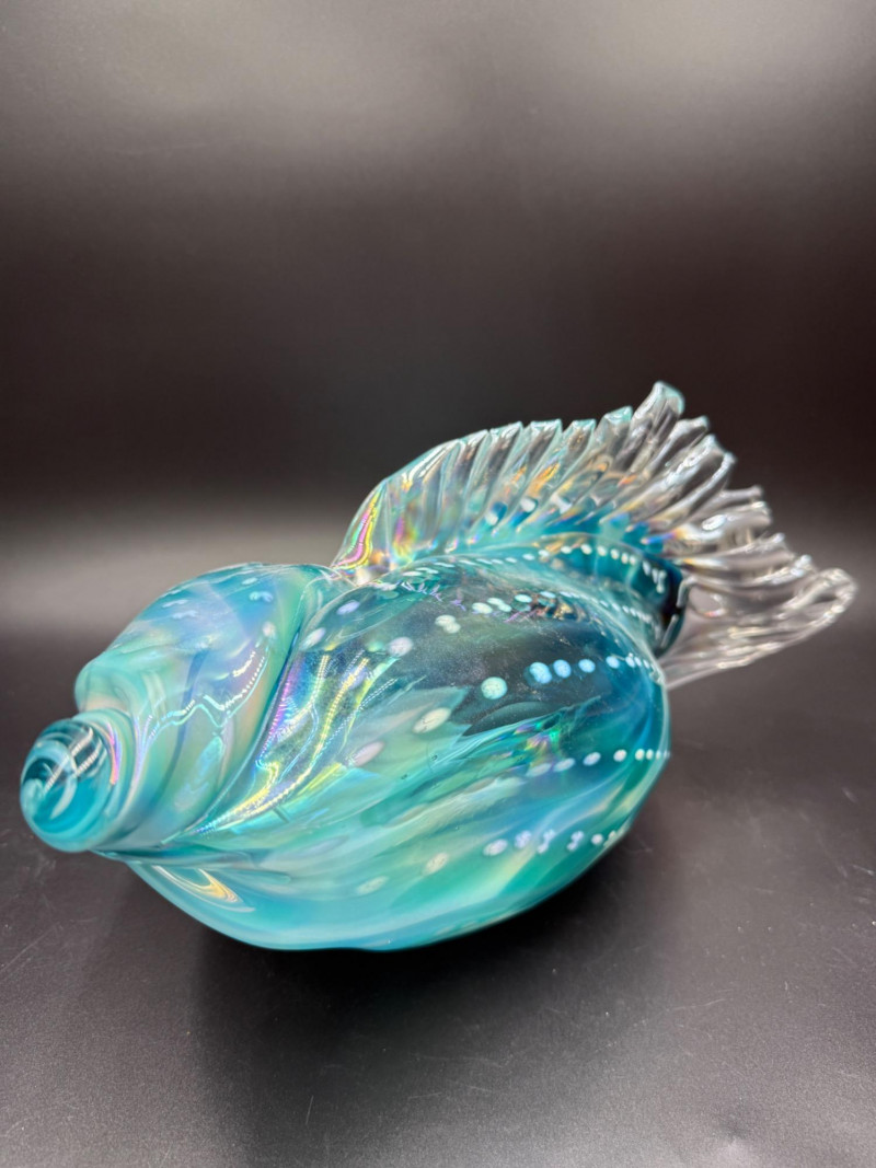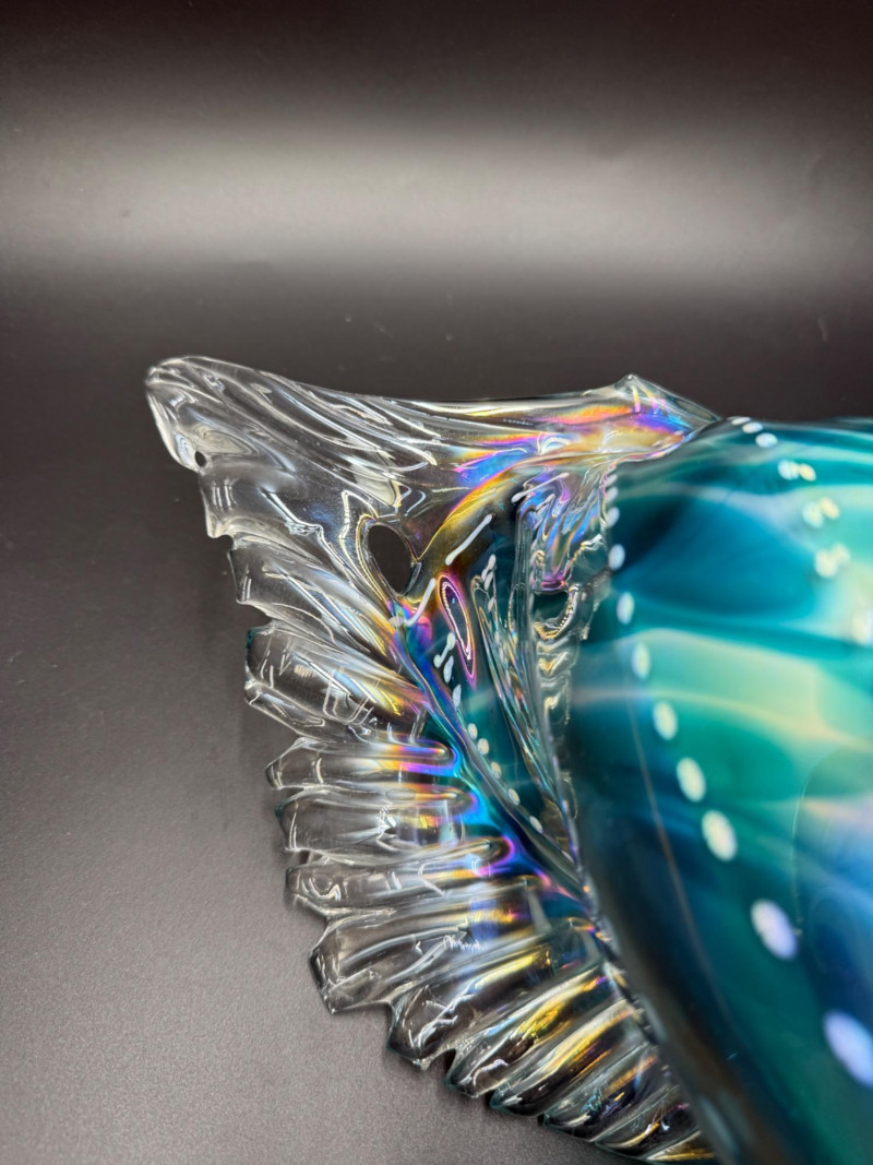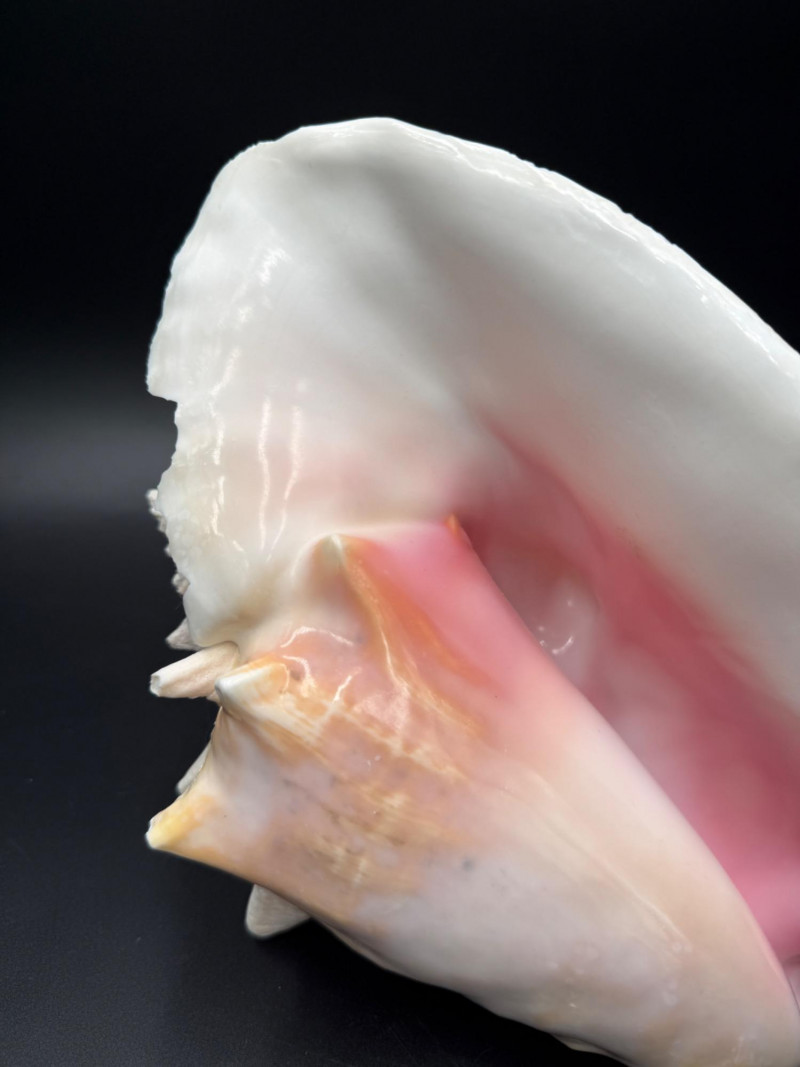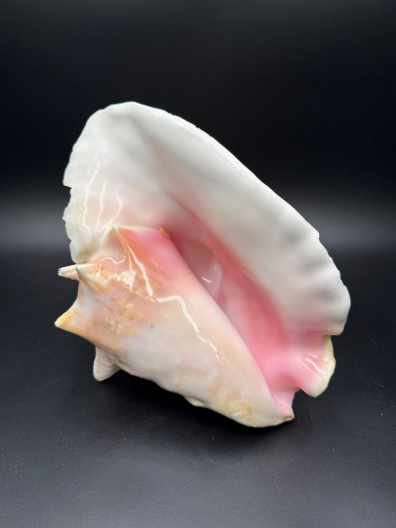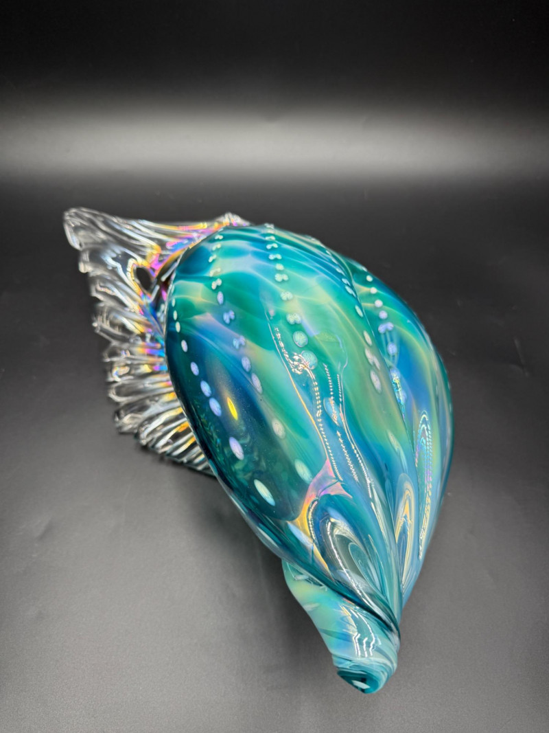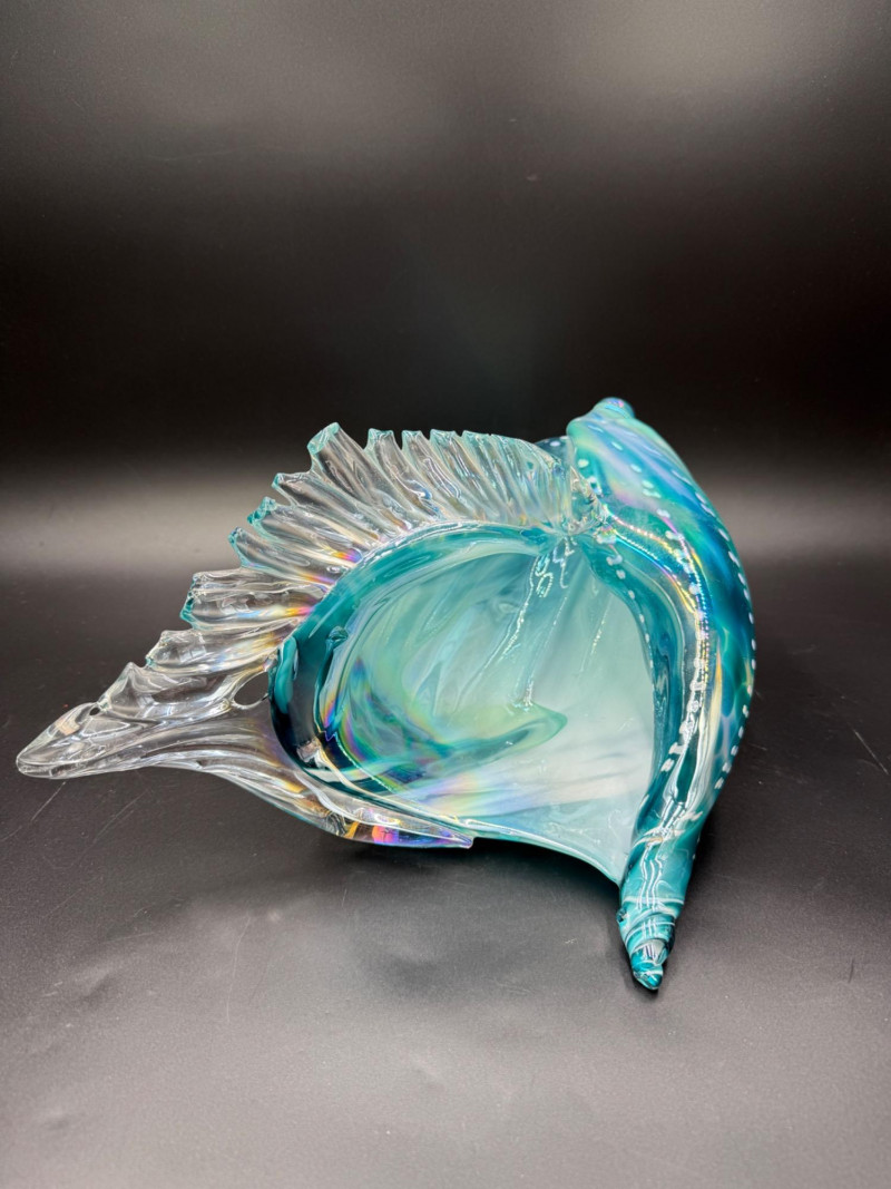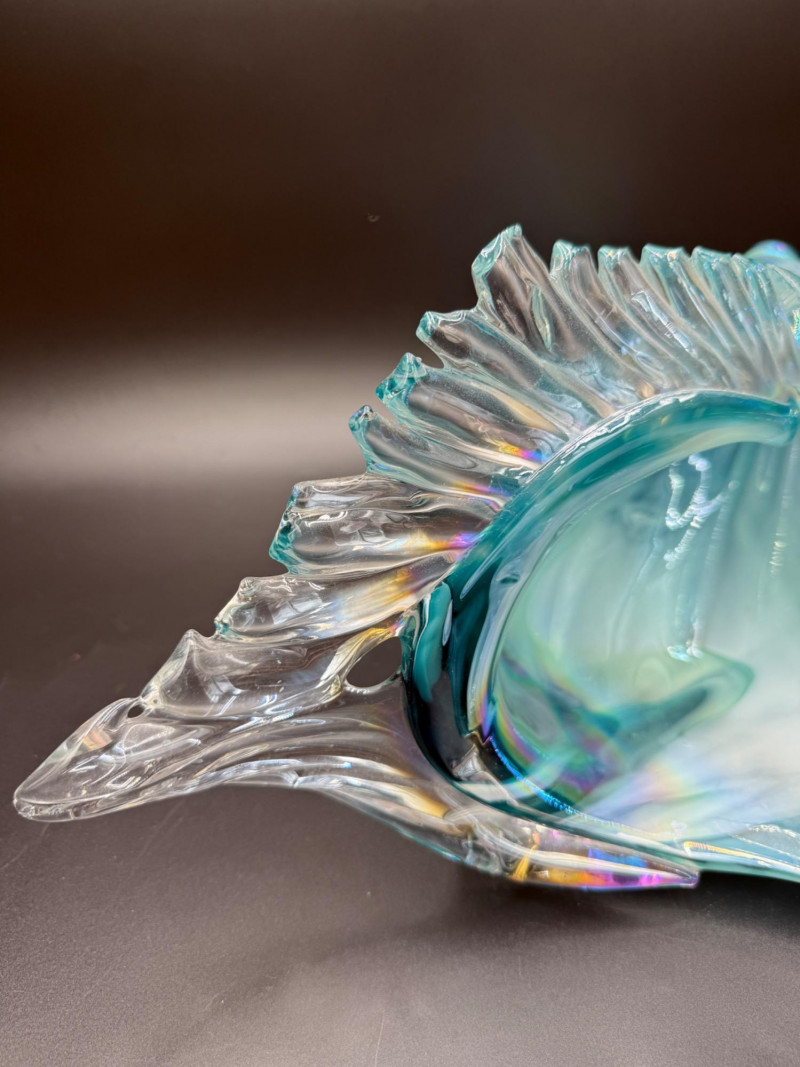 Large Art Glass Conch Sculpture & Natural Conch Shell – Decorative Coastal Décor Pair Beautiful 2-piece lot perfect for coastal or nautical décor enthusiasts. Large Art Glass Conch Sculpture – A stunning, hand-crafted glass shell in swirling aqua and teal tones with clear, ribbed accents and subtle iridescence. A striking statement piece with a refined, ocean-inspired design. Approx. 16" L x 8" W x 8" H Natural Conch Shell – A classic ocean treasure with soft pink and coral interior tones, showing organic form and natural beauty. Approx. 10" L x 7" W x 6" H The art glass sculpture is especially eye-catching under light, showing off vibrant color shifts and clear textured edges reminiscent of fine Murano-style glass. Highlights: Includes 2 decorative pieces: art glass conch and natural conch shell Art glass conch has rich color, clear accents, and iridescent sheen Natural shell with pink interior tones for authentic coastal charm Condition: