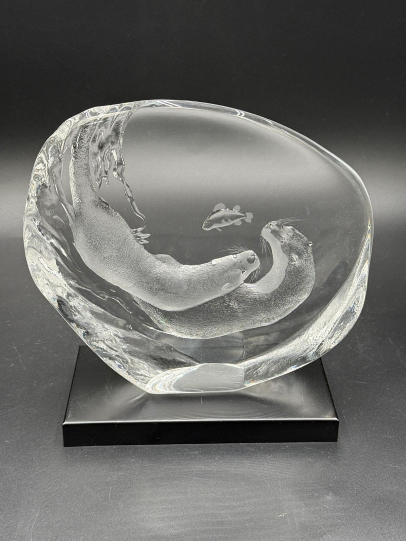 Signed Mats Jonasson Crystal Art Glass Sculpture – Sea Otters Sweden Beautiful signed crystal art sculpture by renowned Swedish designer Mats Jonasson, produced at Målerås Glasbruk. This striking piece features a pair of detailed sea otters in frosted relief, captured in clear heavy crystal for dramatic depth and light refraction. Classic of Jonasson’s style, the internal etching is masterfully detailed, bringing the animals to life in a serene underwater scene. A perfect collector’s item or elegant décor accent for lovers of wildlife art and Scandinavian design. Approximate Dimensions: 8" L x 8" H x 1.5" D Highlights: Signed on base “Mats Jonasson Sweden” (see photo) Heavy, high-quality Swedish crystal Detailed frosted etching of sea otters in motion Made at Målerås Glasbruk, Sweden Collectible Scandinavian wildlife art glass Condition: Notes: