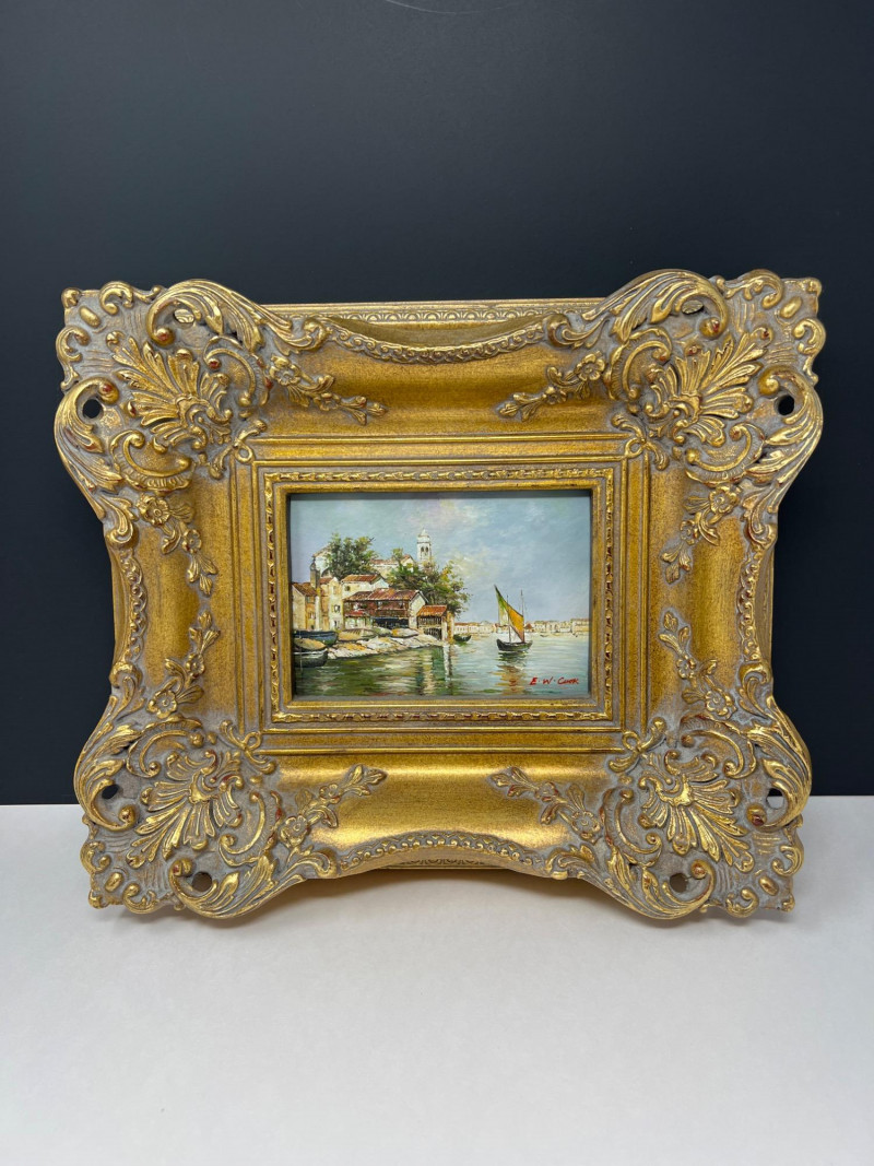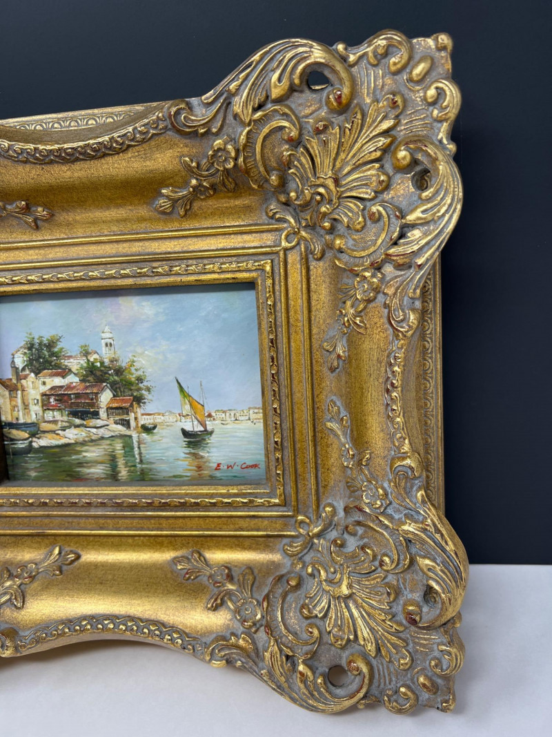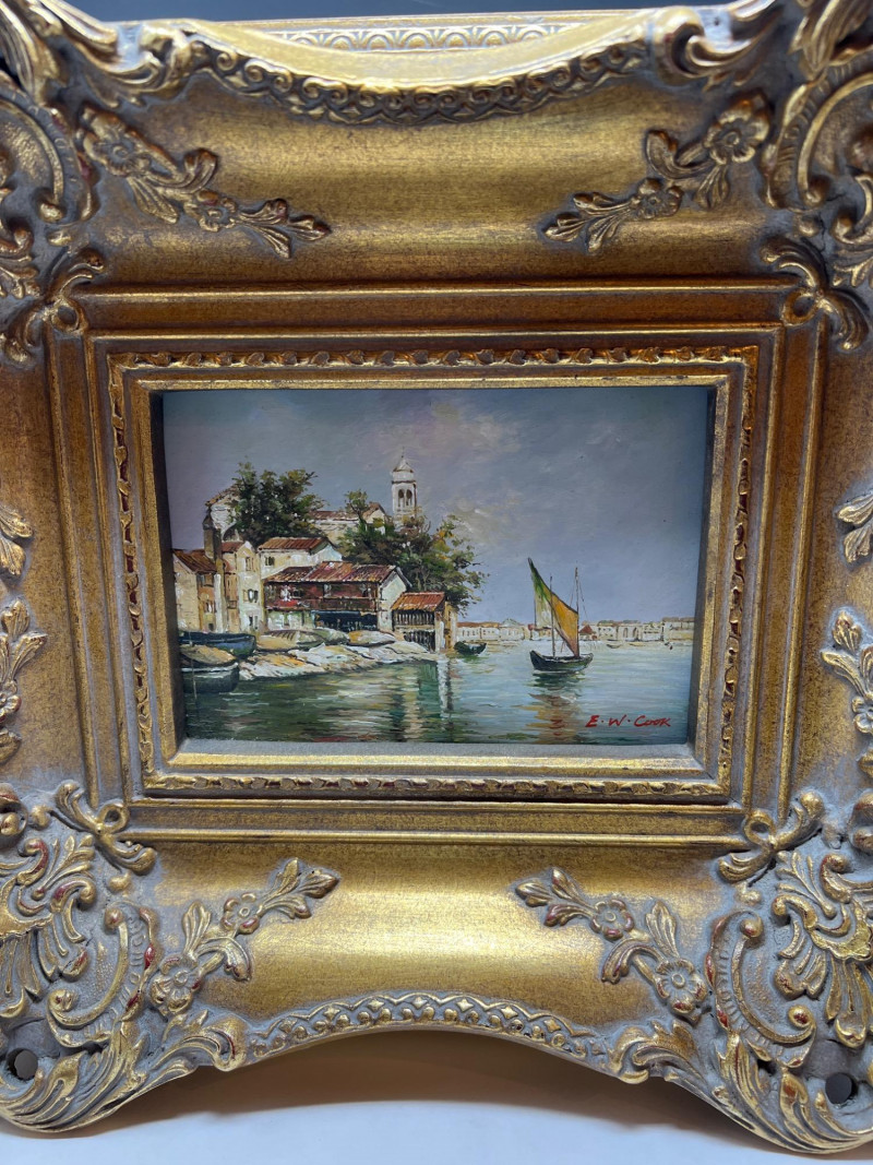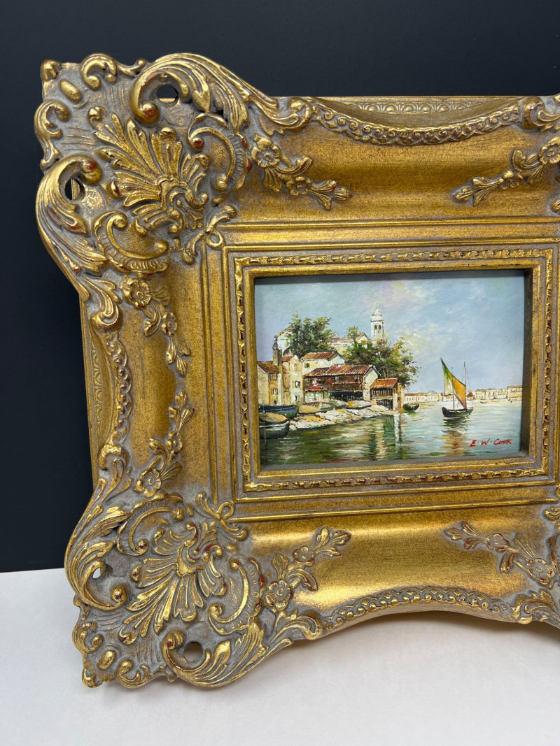 Elegant fine art by E.W. Cook presented in an ornate gold gilt frame. Rich color palette and detailed composition bring sophistication to any room. Medium: Acrylic or oil (see photo) Size: 7 inches x 5 inches Frame: Ornate gold gilt with scrolling corners Collectible value: Signature visible, frame intact Friendly Reminder: This auction will start closing at 6:30pm on Tuesday, August 12th