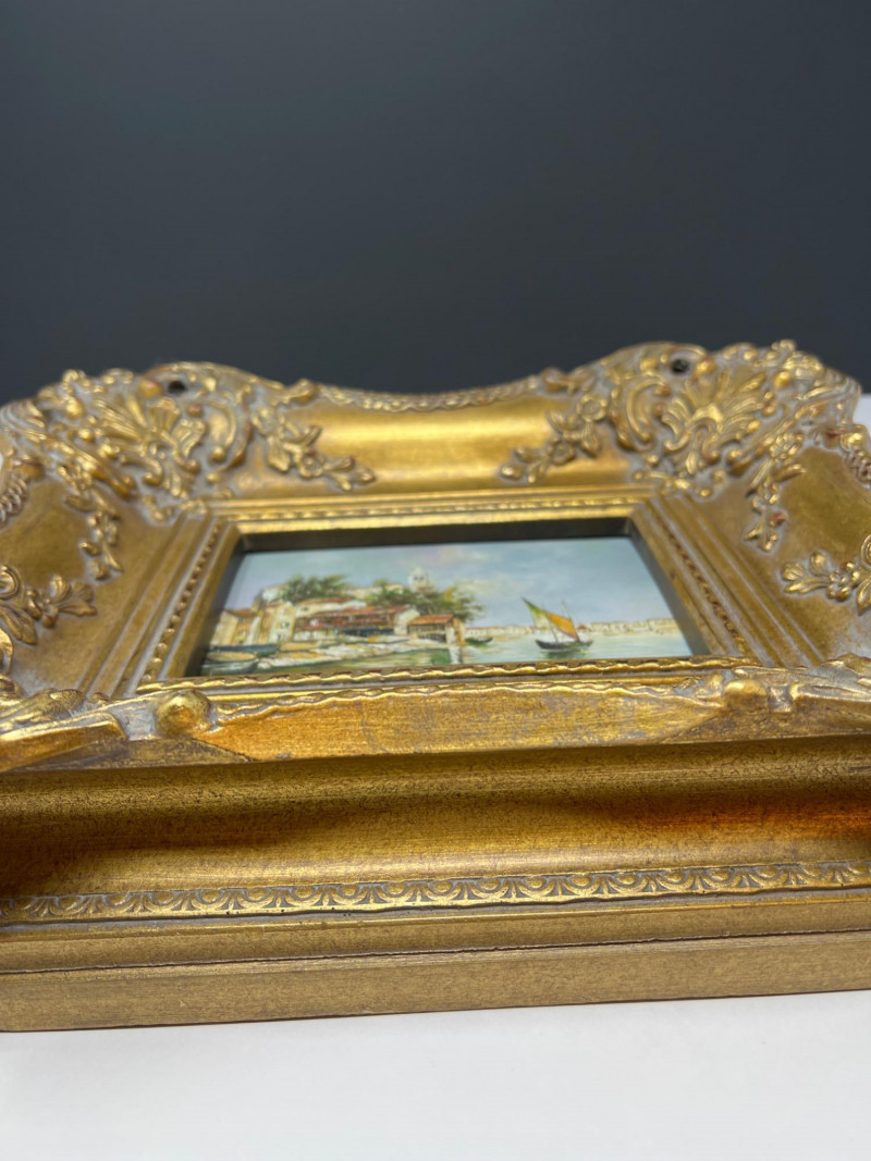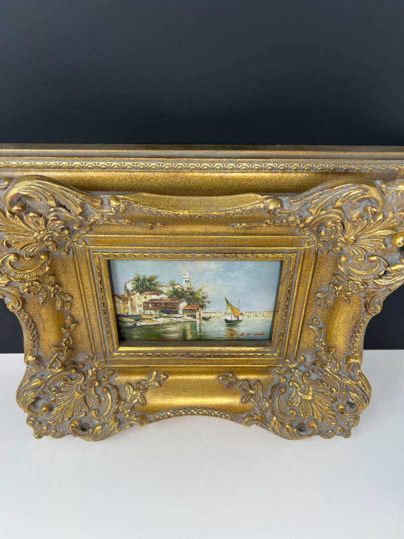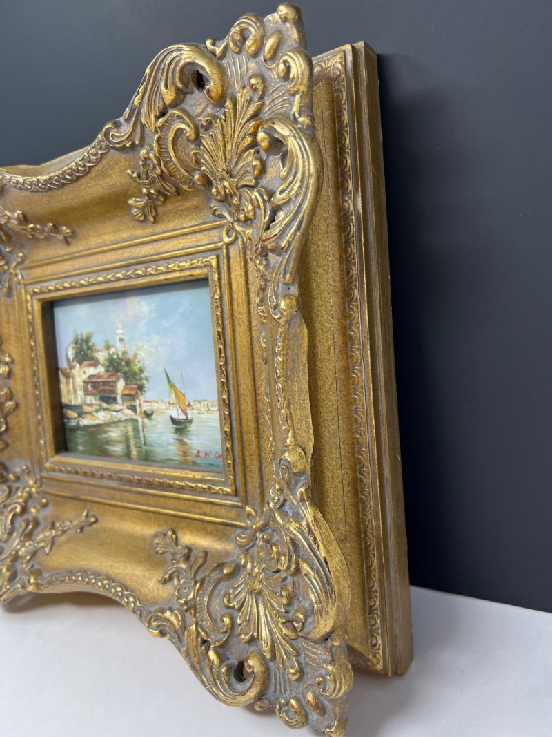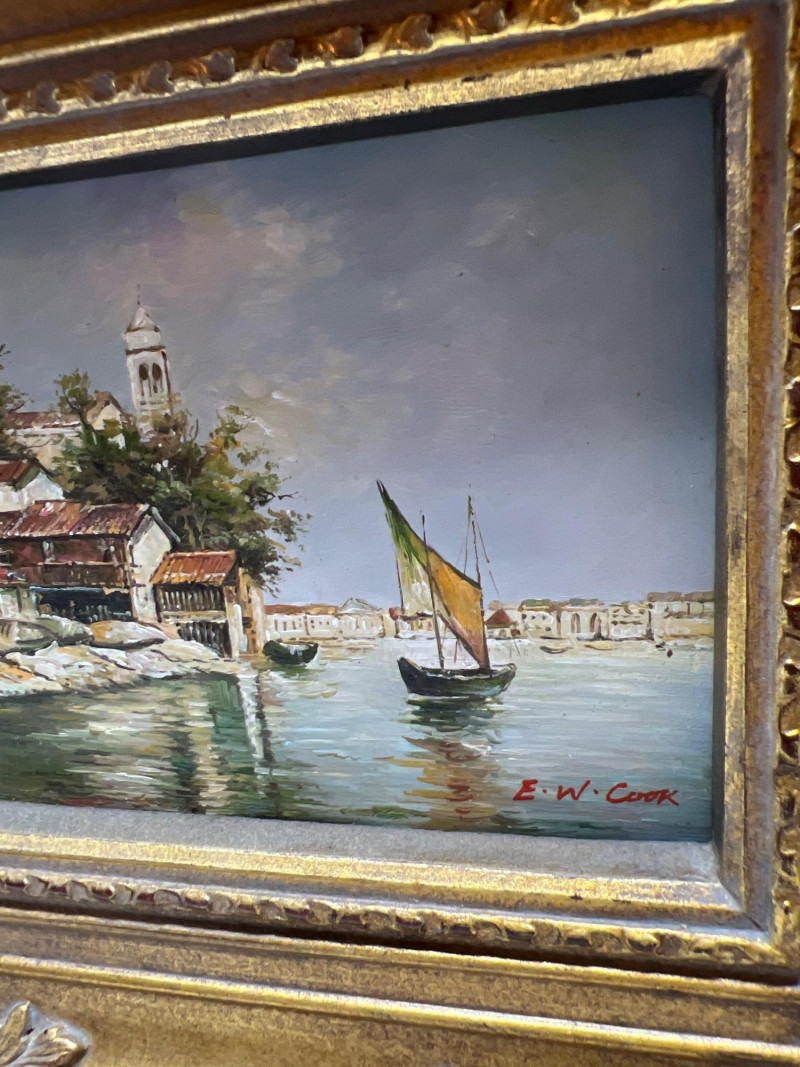 Elegant fine art by E.W. Cook presented in an ornate gold gilt frame. Rich color palette and detailed composition bring sophistication to any room. Medium: Acrylic or oil (see photo) Size: 7 inches x 5 inches Frame: Ornate gold gilt with scrolling corners Collectible value: Signature visible, frame intact Friendly Reminder: This auction will start closing at 6:30pm on Tuesday, August 12th