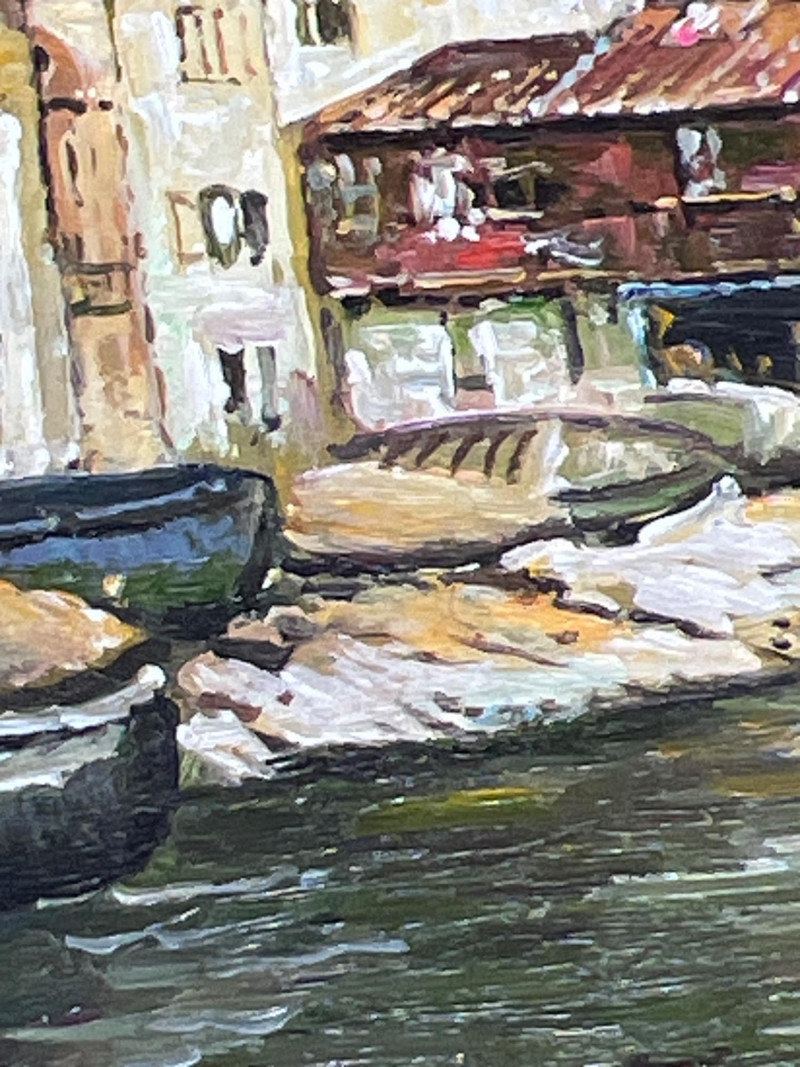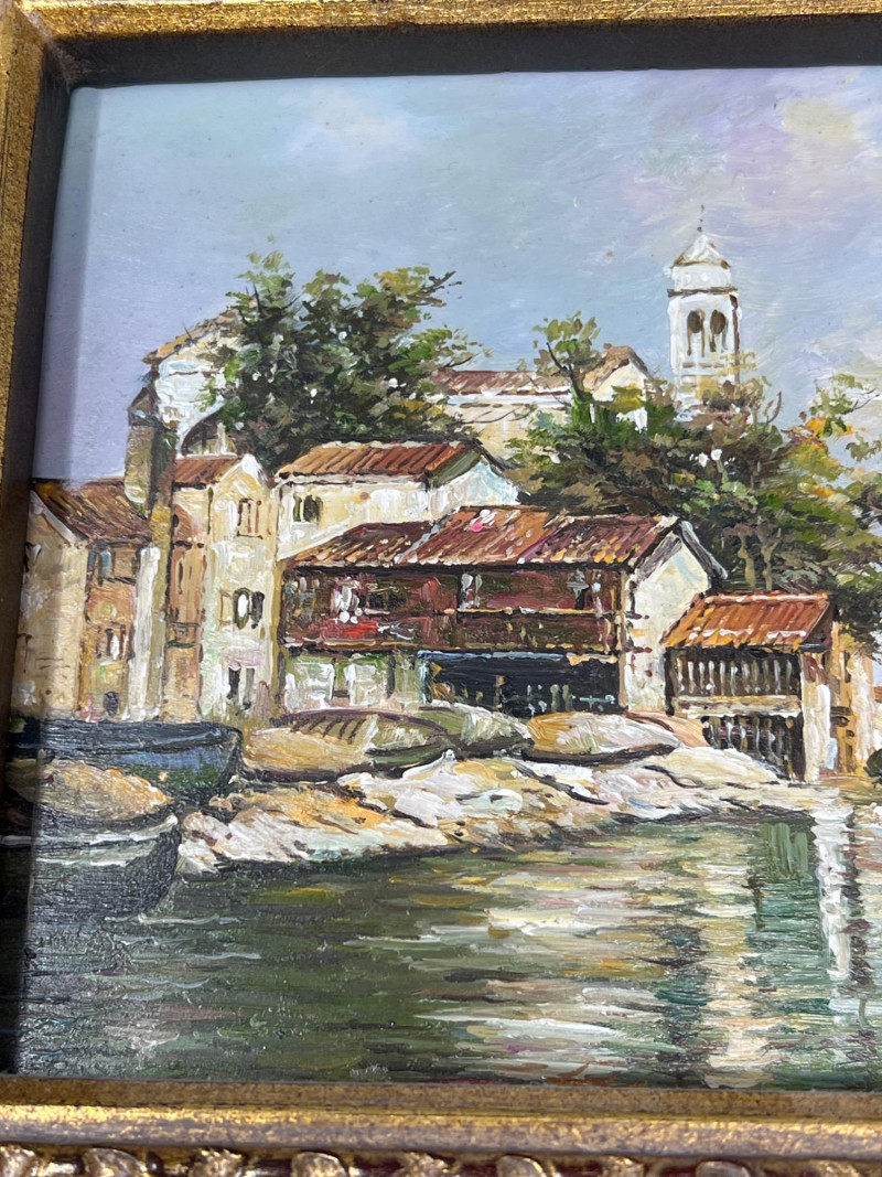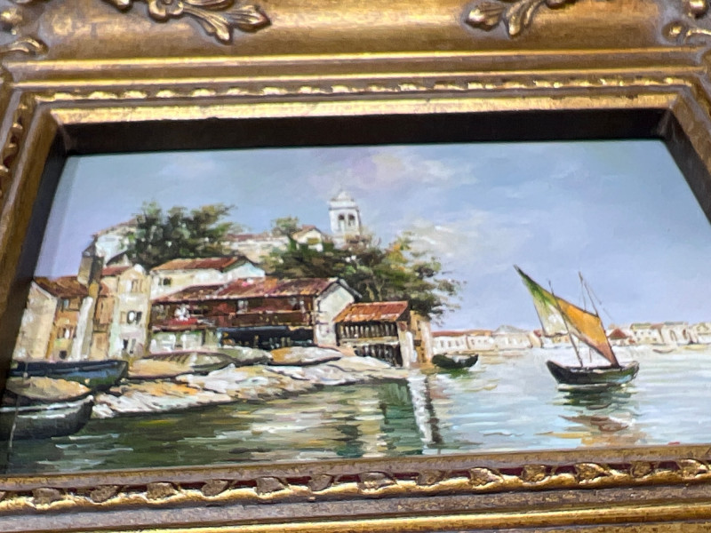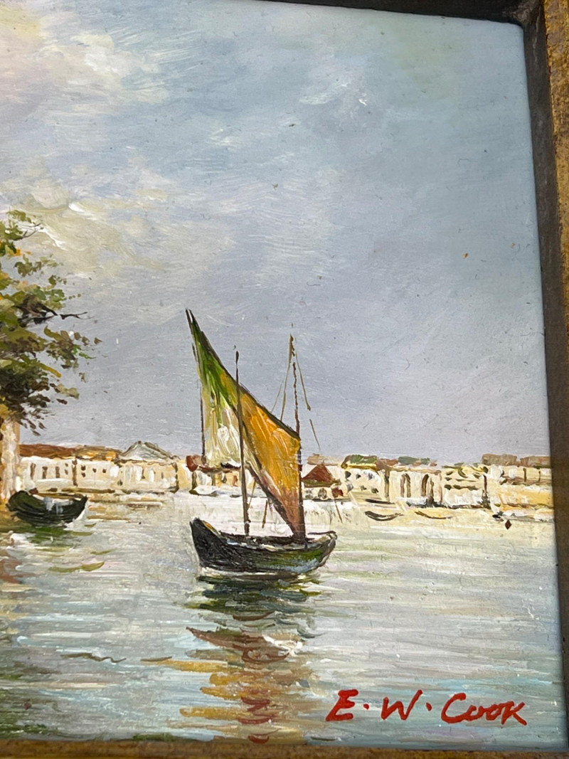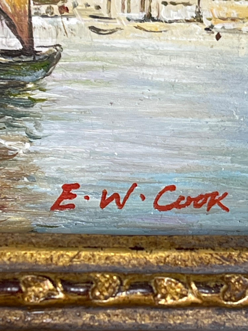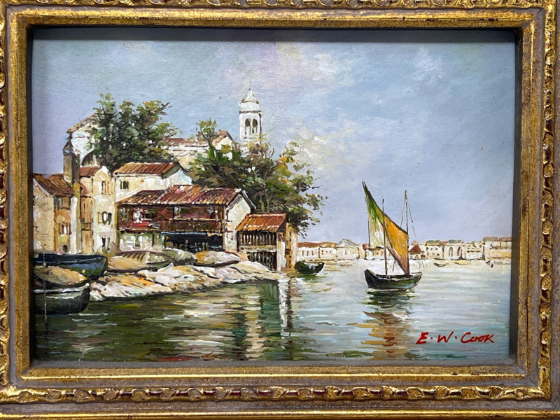 Lot # 30 - E.W. Cook Framed Fine Art–Seaside Village & Sailboat Ornate Gold Frame