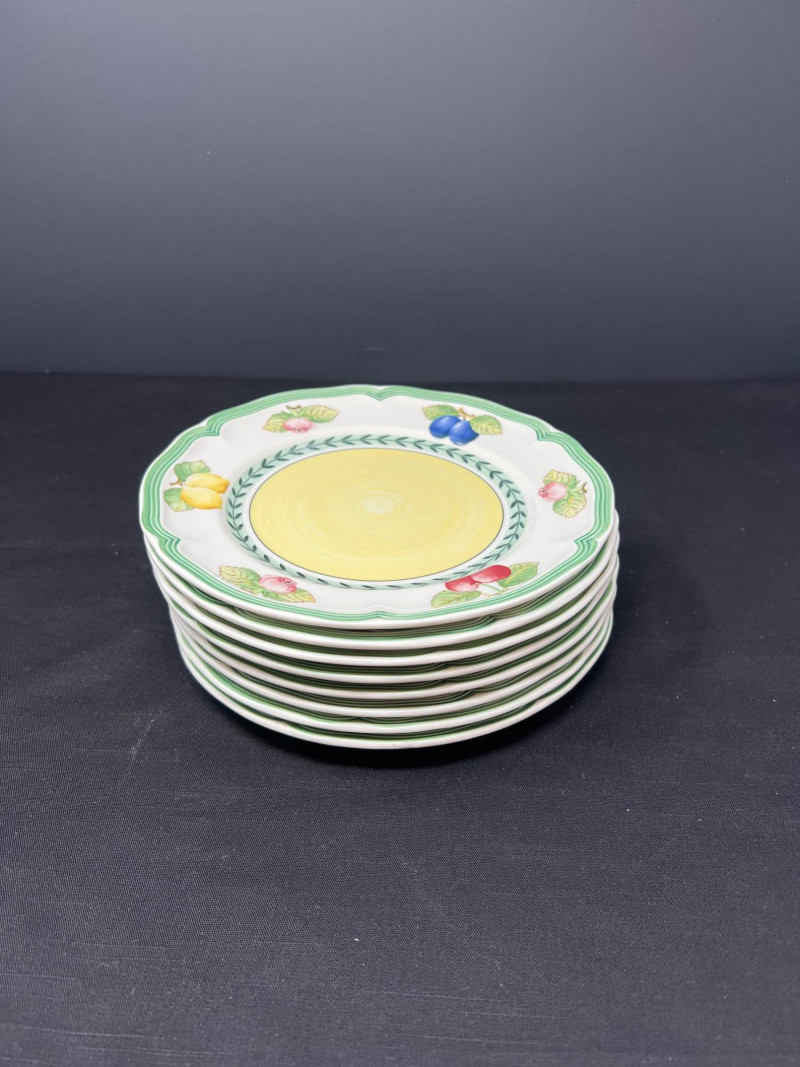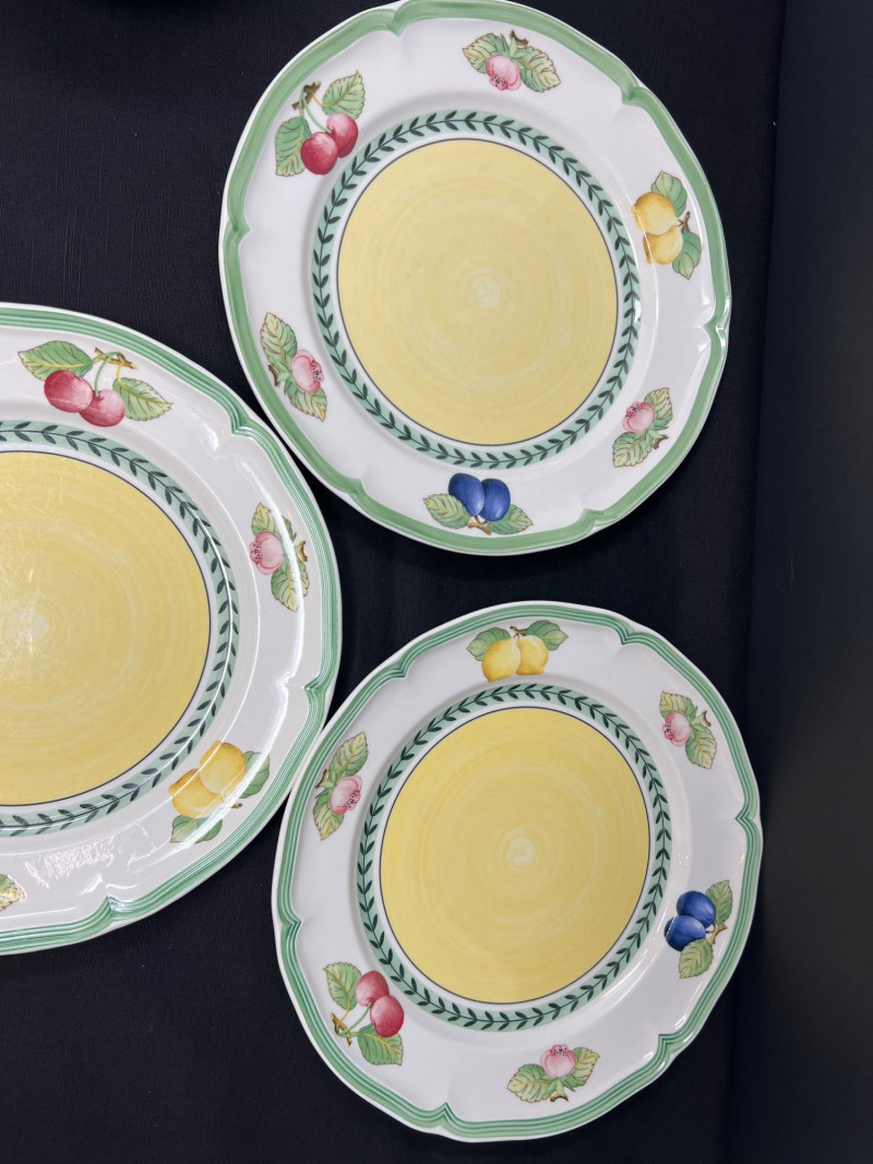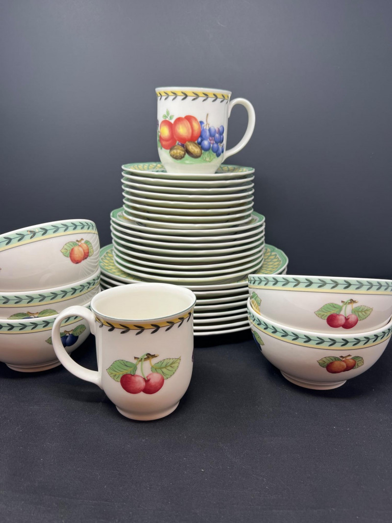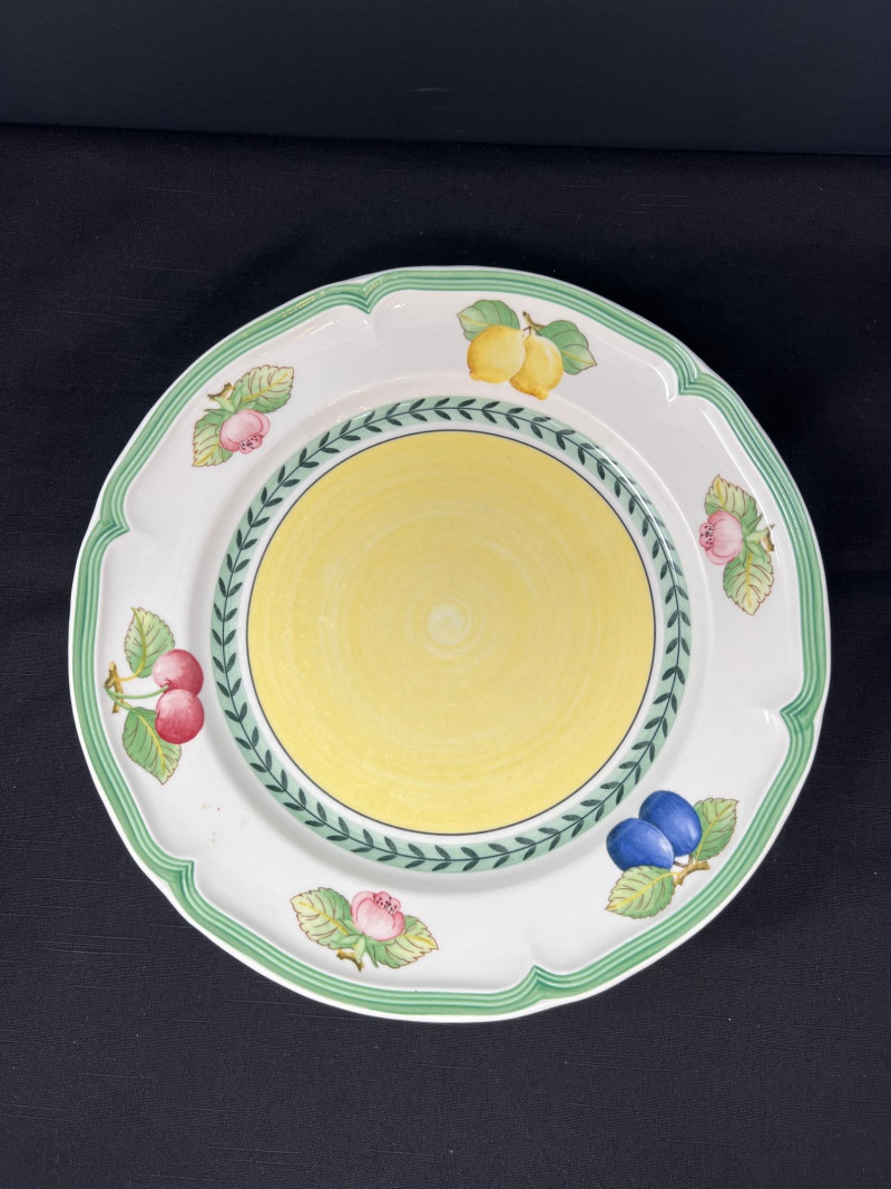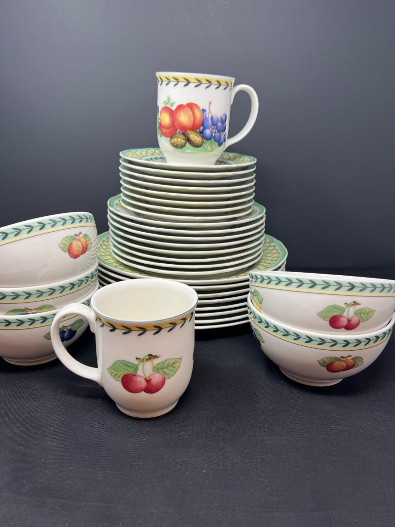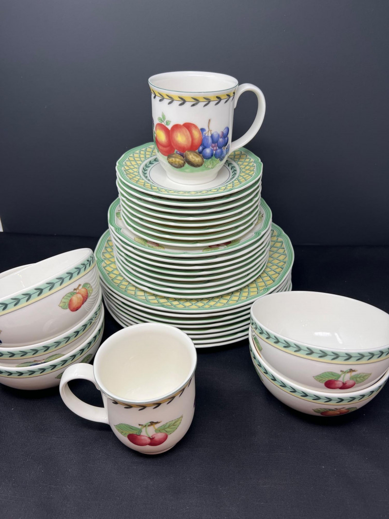 Villeroy & Boch porcelain dishware from the French Garden series in assorted coordinating patterns. Includes fruit and floral motifs across plates, bowls, and serveware with cheerful pastel tones. 10 - 10 1/2 inch dinner plates 8 - 8 inch salad plates 8 - 6 3/4 inch bread plates 5 - 3 inch tall x 5 1/2 inch diameter Soup Bowls 2 - 4“ tall x 3 1/2“ diameter mugs. Friendly Reminder: This auction will start closing at 6:30pm on Tuesday, August 12th