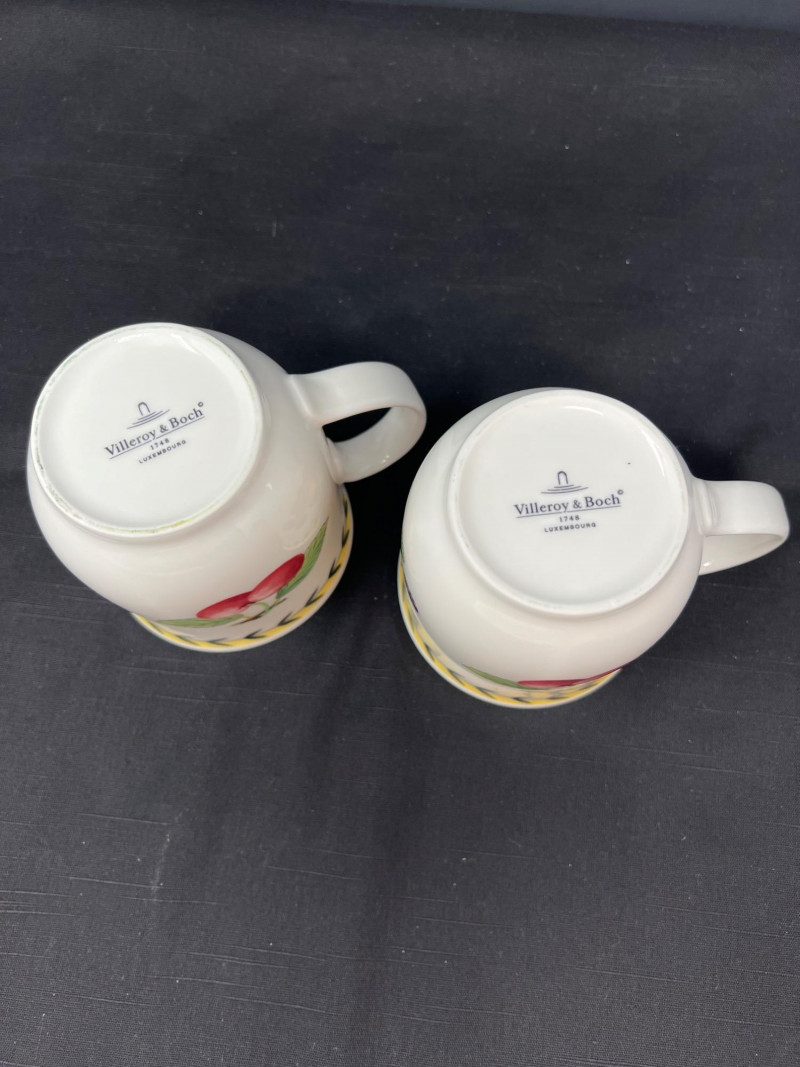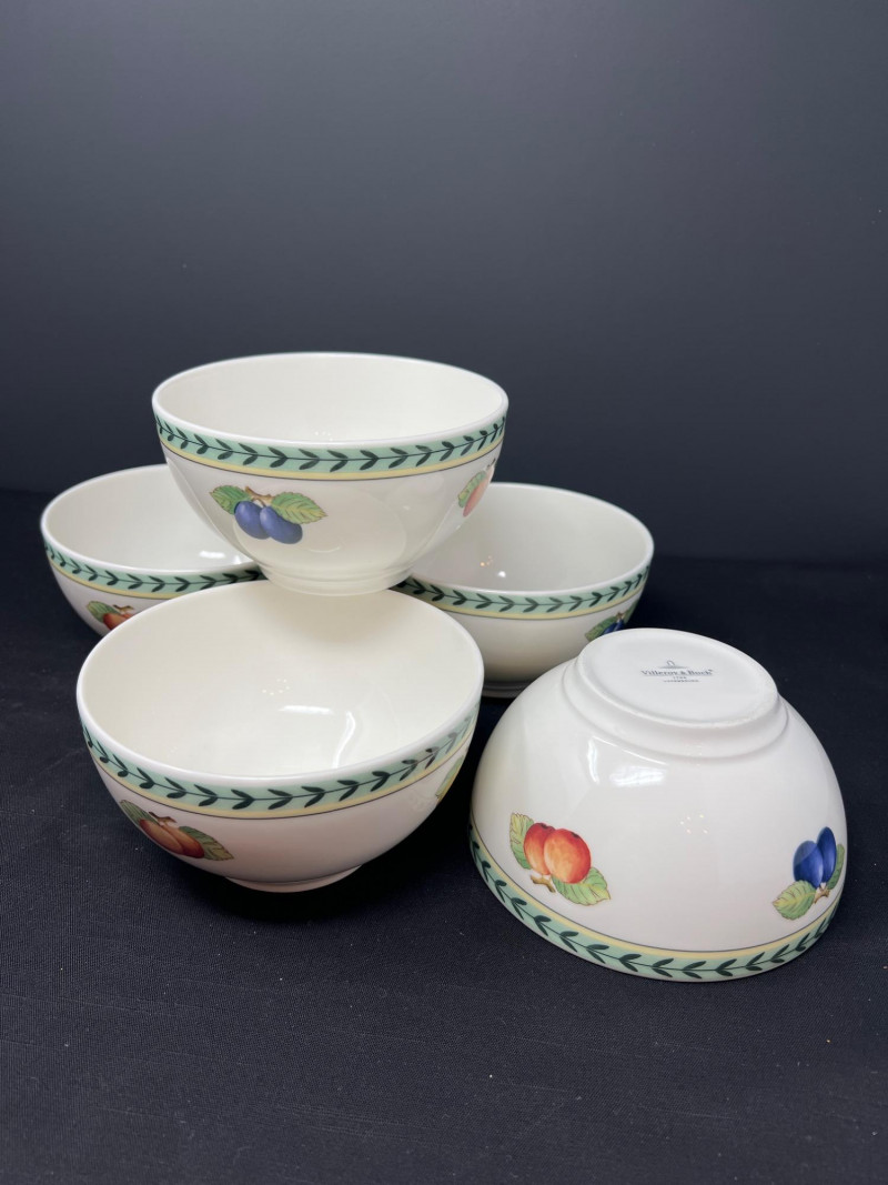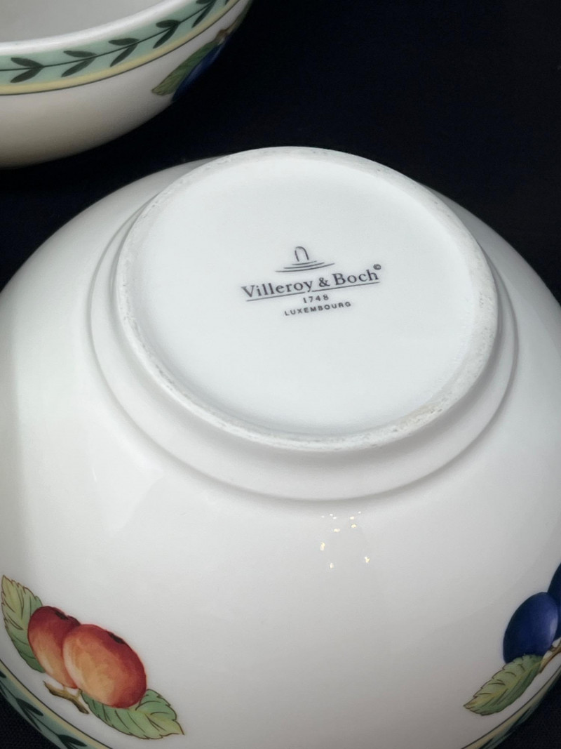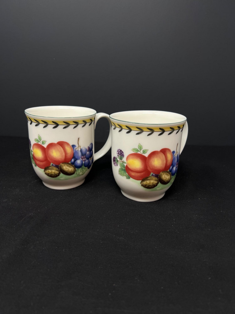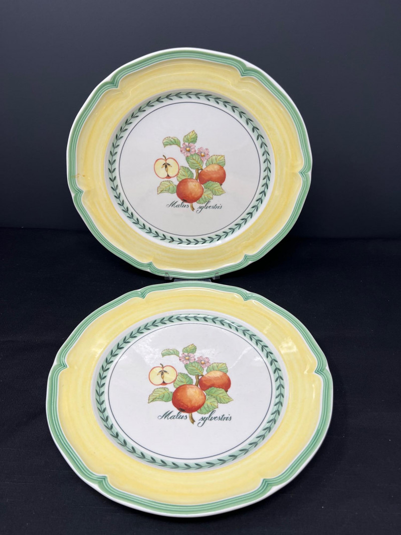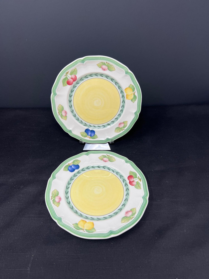 Villeroy & Boch porcelain dishware from the French Garden series in assorted coordinating patterns. Includes fruit and floral motifs across plates, bowls, and serveware with cheerful pastel tones. 10 - 10 1/2 inch dinner plates 8 - 8 inch salad plates 8 - 6 3/4 inch bread plates 5 - 3 inch tall x 5 1/2 inch diameter Soup Bowls 2 - 4“ tall x 3 1/2“ diameter mugs. Friendly Reminder: This auction will start closing at 6:30pm on Tuesday, August 12th