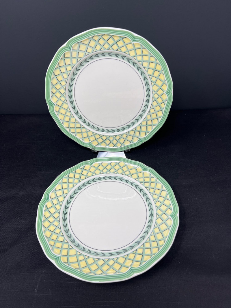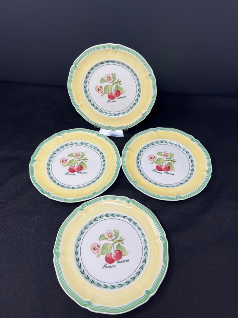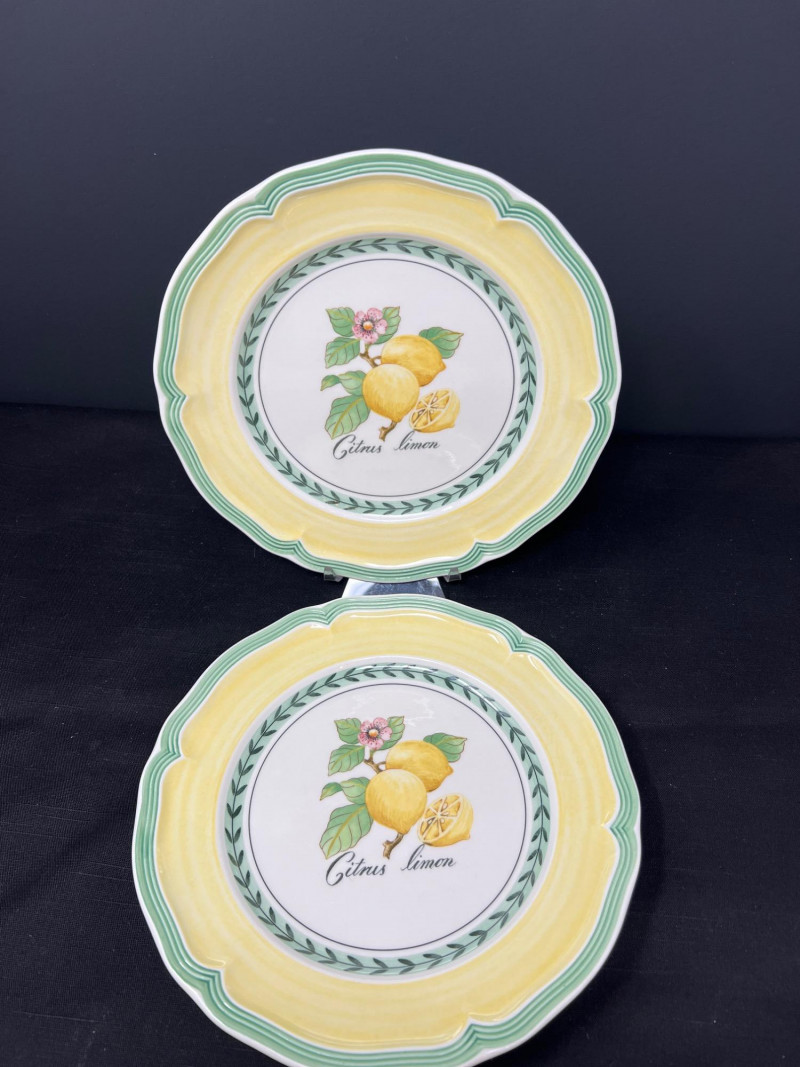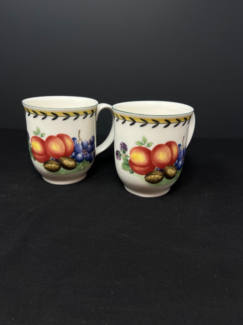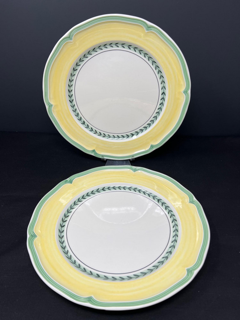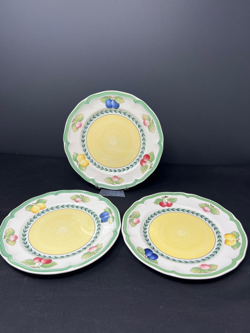 Villeroy & Boch porcelain dishware from the French Garden series in assorted coordinating patterns. Includes fruit and floral motifs across plates, bowls, and serveware with cheerful pastel tones. 10 - 10 1/2 inch dinner plates 8 - 8 inch salad plates 8 - 6 3/4 inch bread plates 5 - 3 inch tall x 5 1/2 inch diameter Soup Bowls 2 - 4“ tall x 3 1/2“ diameter mugs. Friendly Reminder: This auction will start closing at 6:30pm on Tuesday, August 12th