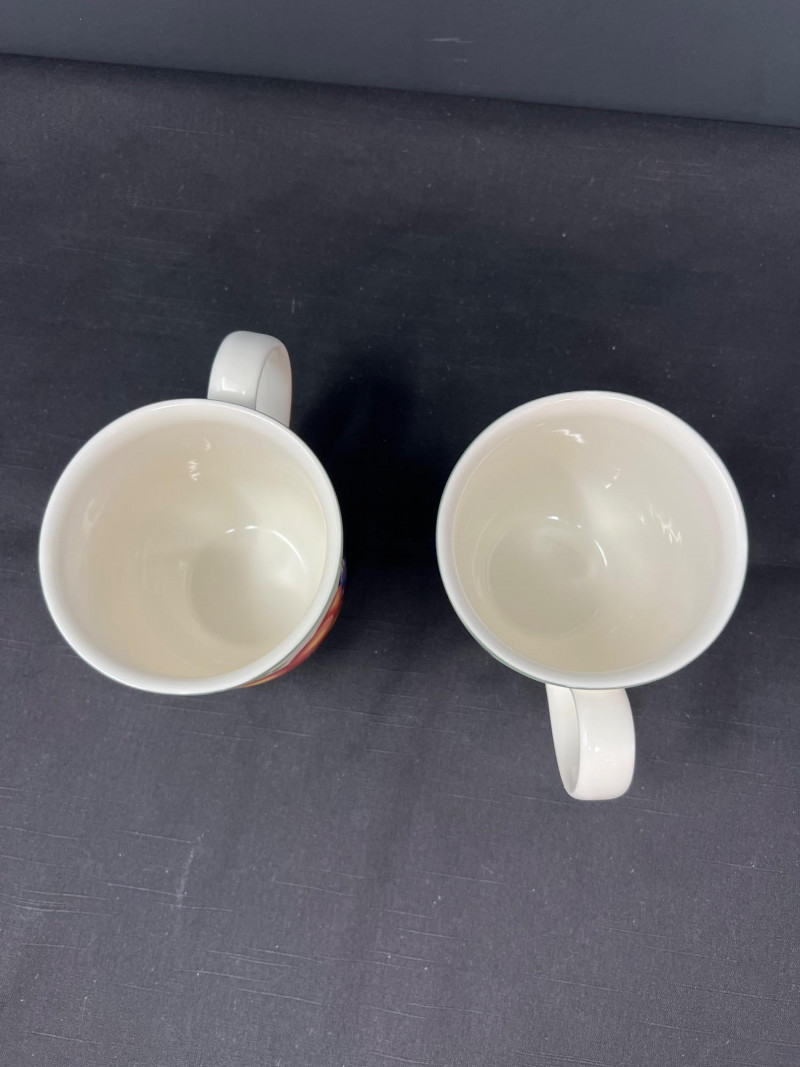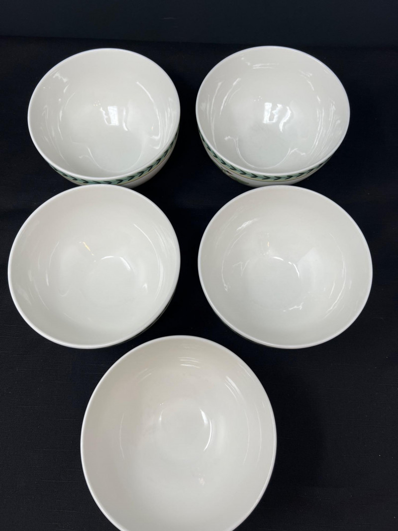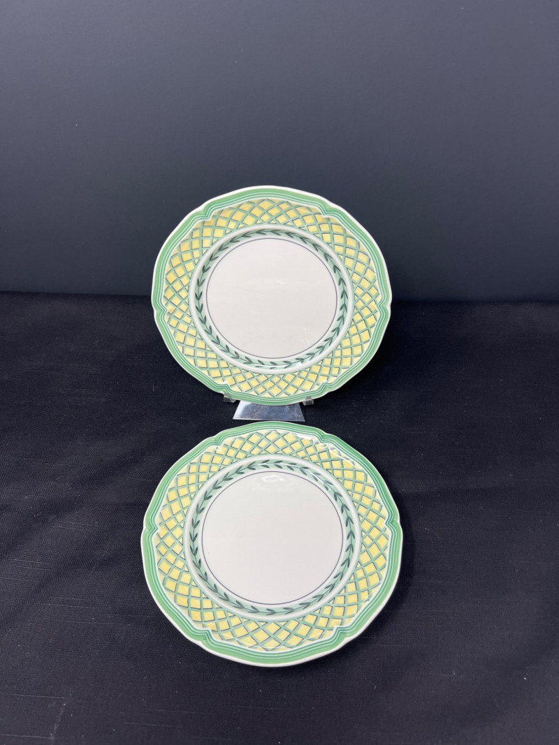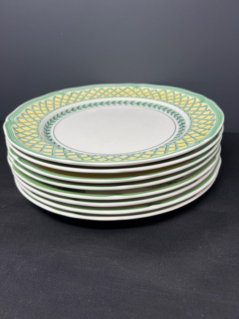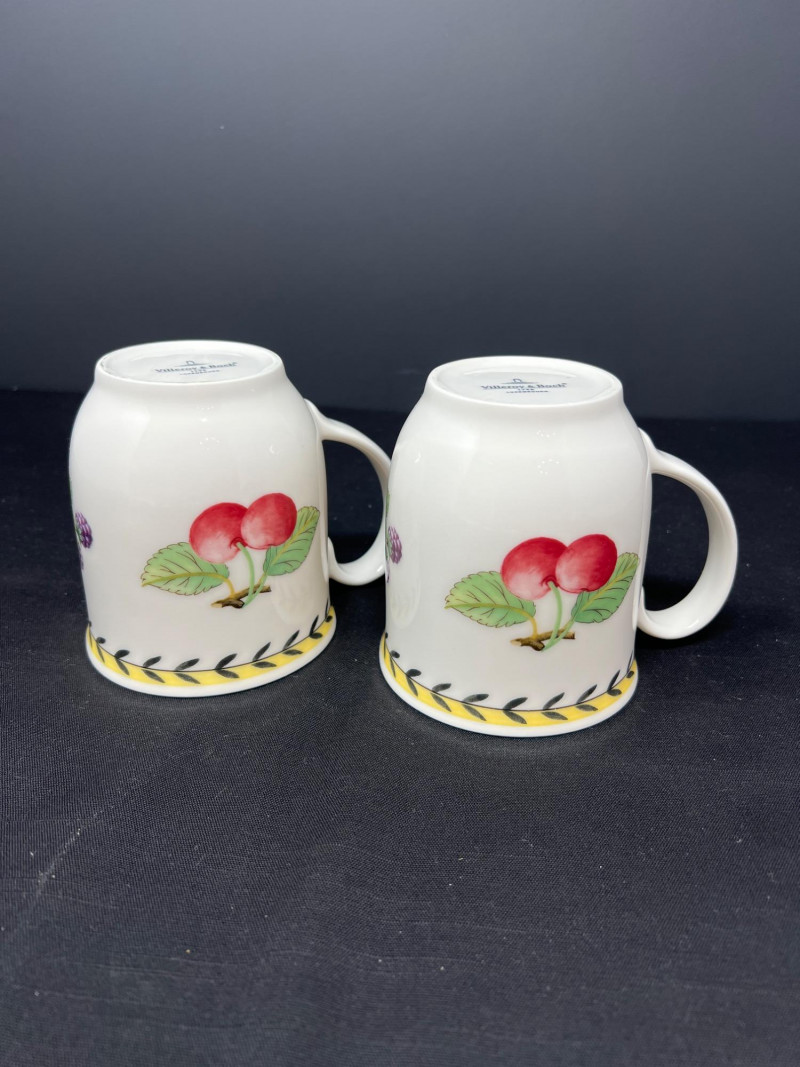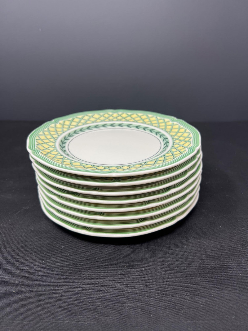 Villeroy & Boch porcelain dishware from the French Garden series in assorted coordinating patterns. Includes fruit and floral motifs across plates, bowls, and serveware with cheerful pastel tones. 10 - 10 1/2 inch dinner plates 8 - 8 inch salad plates 8 - 6 3/4 inch bread plates 5 - 3 inch tall x 5 1/2 inch diameter Soup Bowls 2 - 4“ tall x 3 1/2“ diameter mugs. Friendly Reminder: This auction will start closing at 6:30pm on Tuesday, August 12th