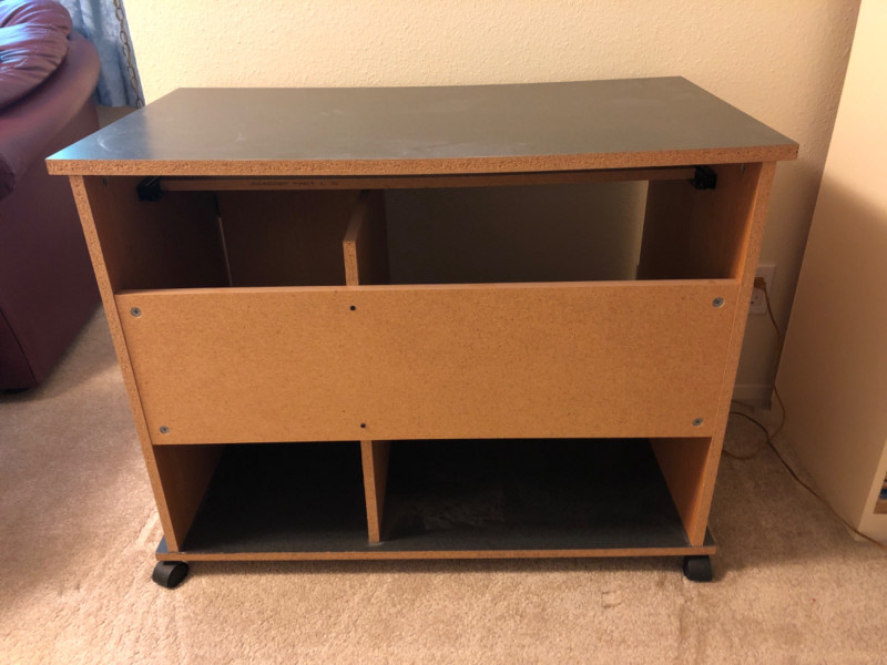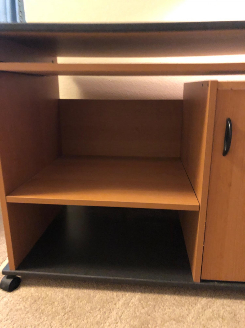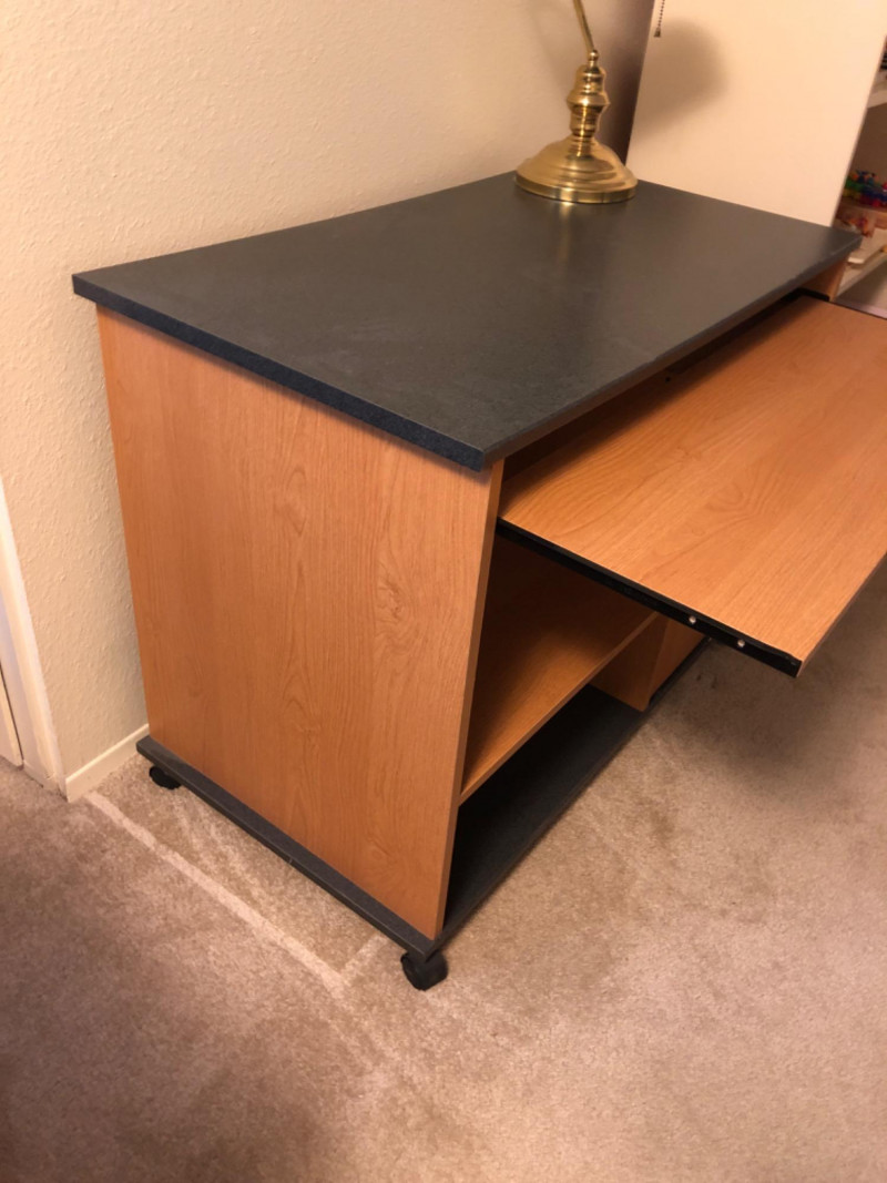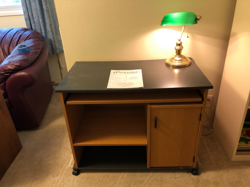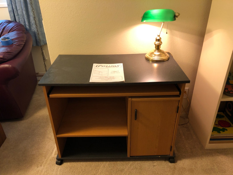 Functional computer desk by O’Sullivan featuring a woodgrain laminate finish, rolling casters, lower storage shelf, and integrated keyboard tray. Paired with a banker's task lamp for a complete home office solution. Space-saving and ideal for tight workspaces or student setups. Computer Cart Dimensions: 27.5" height x 35.5" width x 20" depth Lamp Dimensions: 14" height x 10" width Located on second floor near staircase (15 steps) to ground level exit. Bidding on this lot is an agreement that: (1.) You will have 2 capable, able-bodied persons to lift and load at a minimum. (2.) You