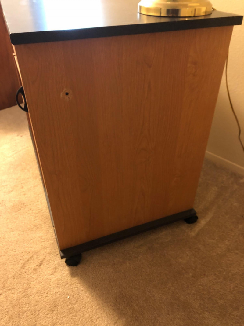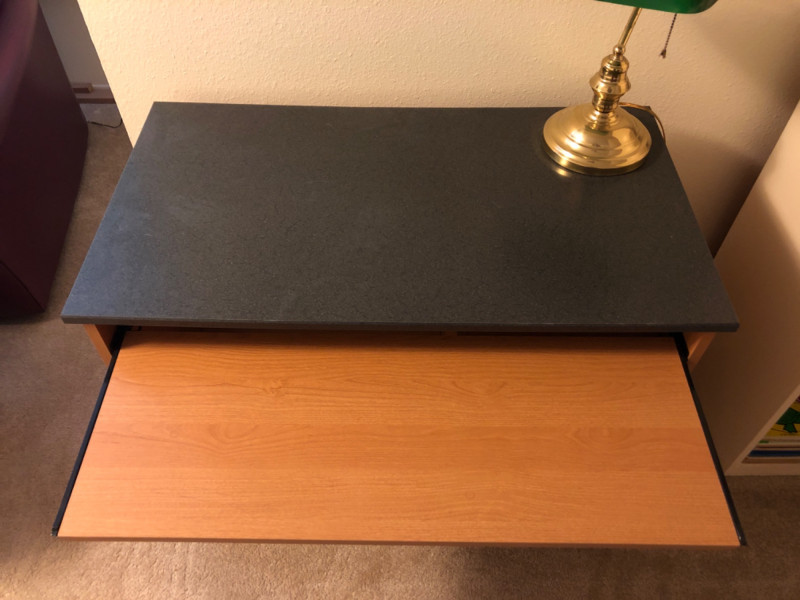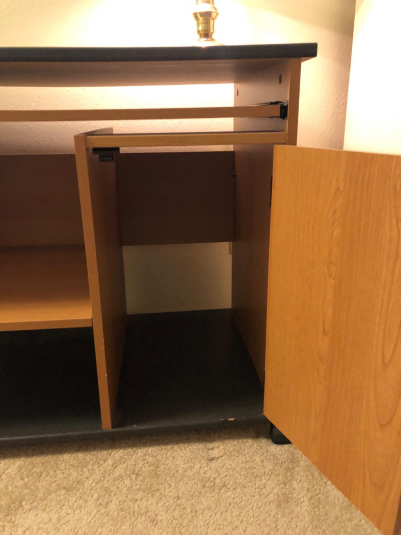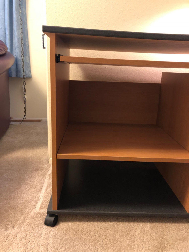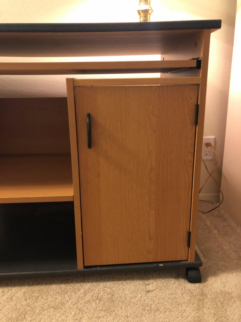 Functional computer desk by O’Sullivan featuring a woodgrain laminate finish, rolling casters, lower storage shelf, and integrated keyboard tray. Paired with a banker's task lamp for a complete home office solution. Space-saving and ideal for tight workspaces or student setups. Computer Cart Dimensions: 27.5" height x 35.5" width x 20" depth Lamp Dimensions: 14" height x 10" width Located on second floor near staircase (15 steps) to ground level exit. Bidding on this lot is an agreement that: (1.) You will have 2 capable, able-bodied persons to lift and load at a minimum. (2.) You