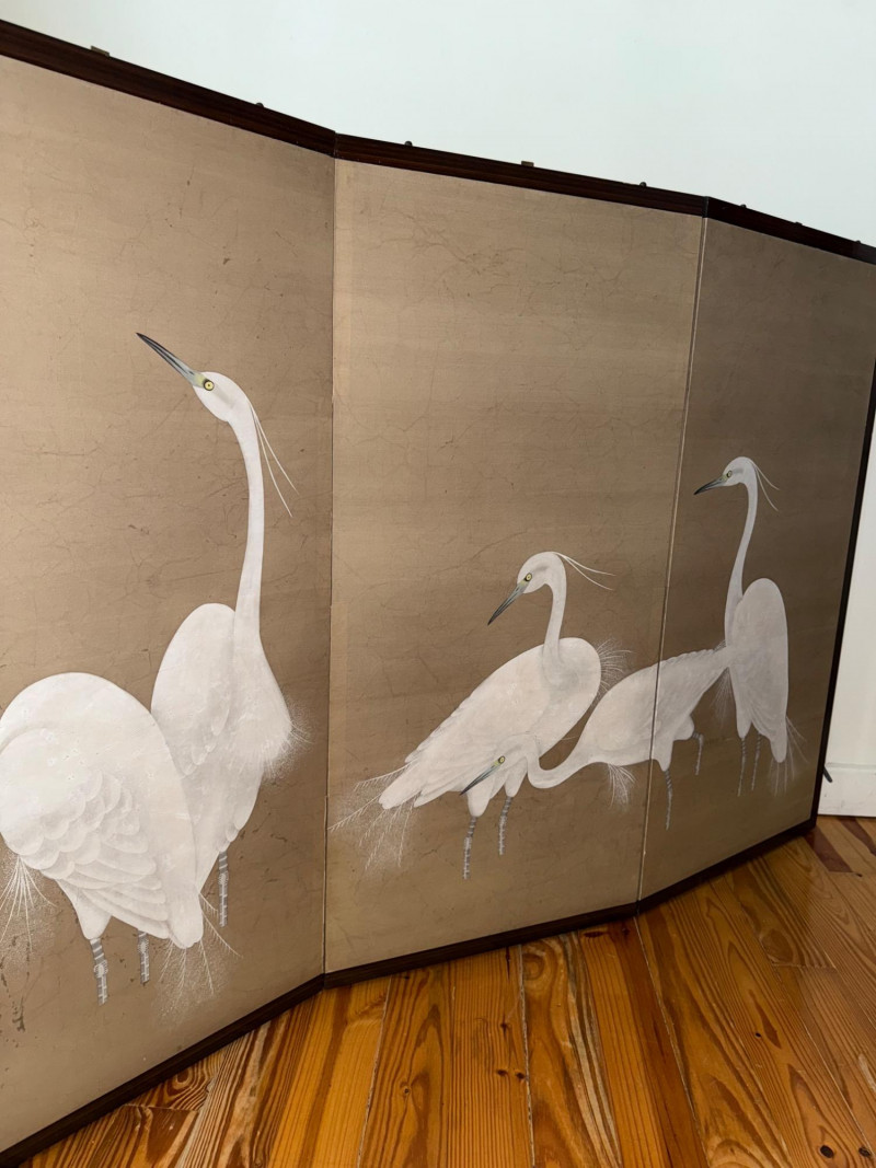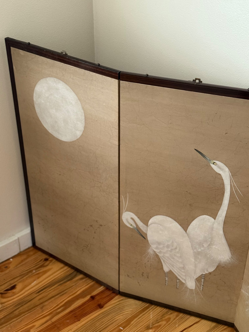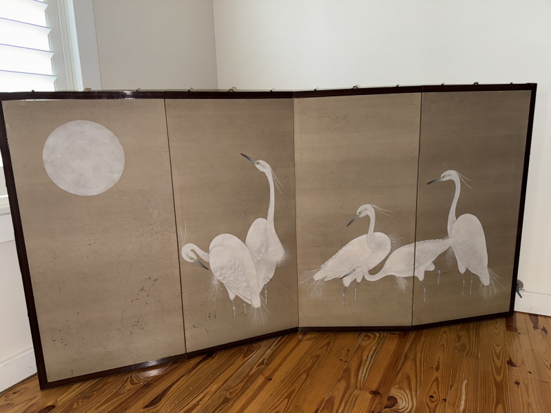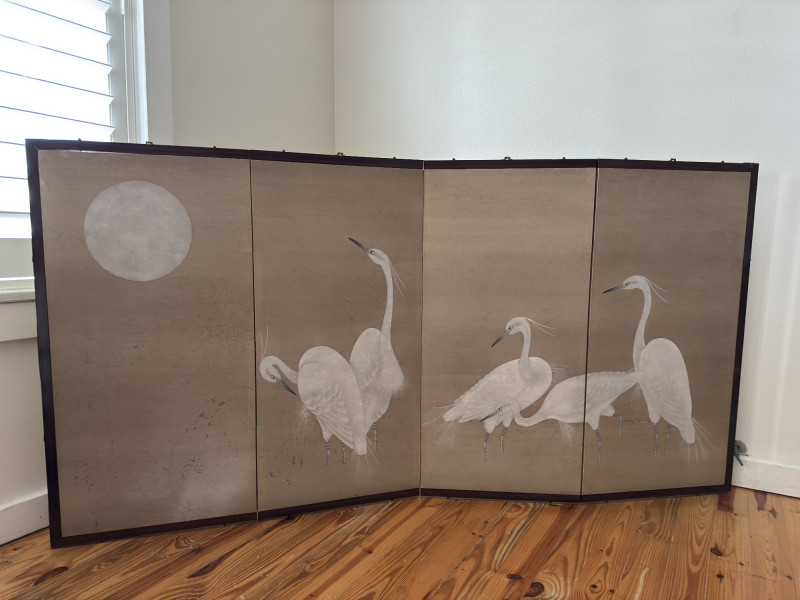 Lot # 171 - White Cranes and Moon Four-Panel Makura-Byōbu – 74”W x 36”H