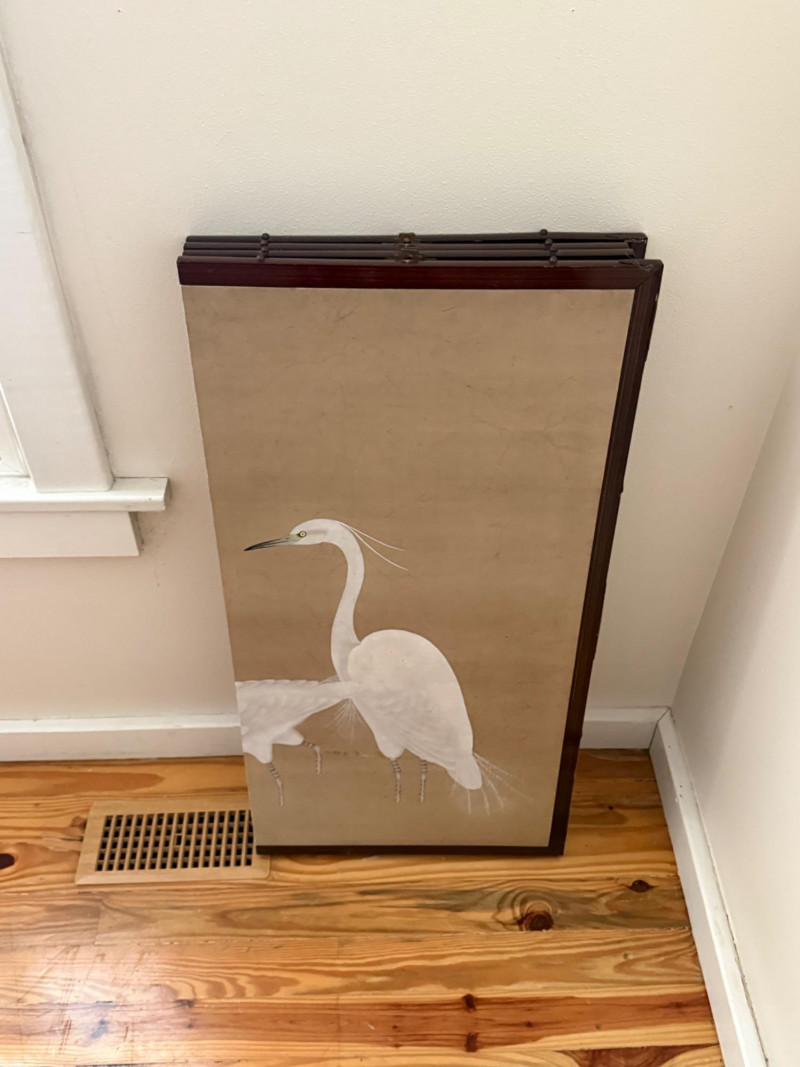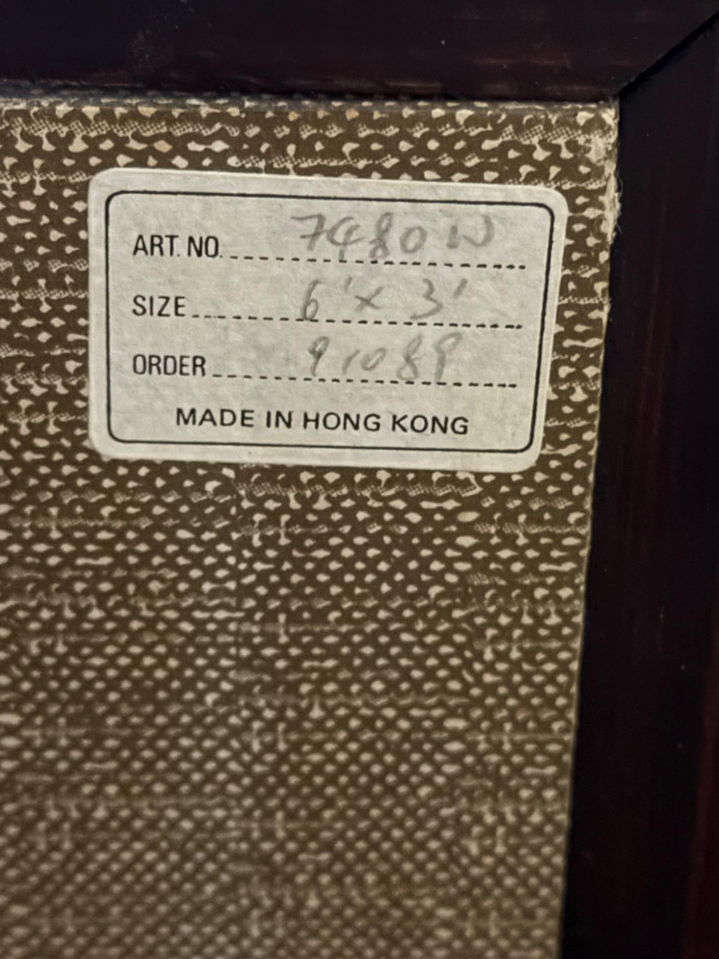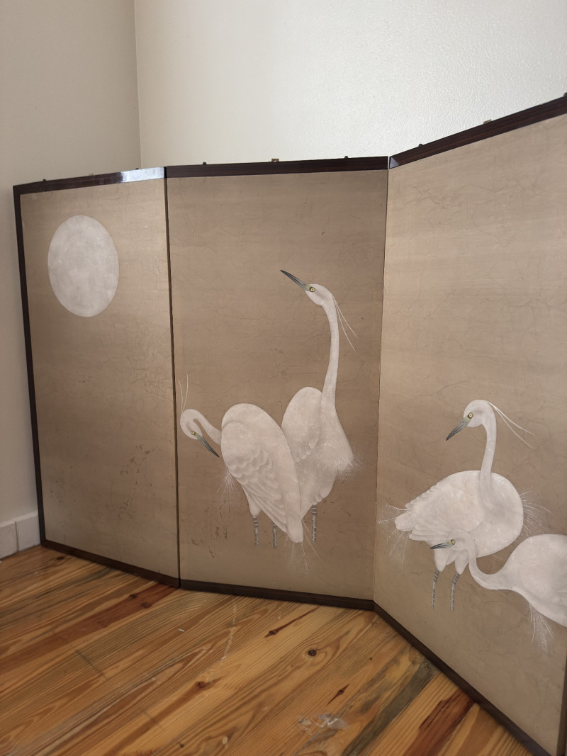 White Cranes and Moon Four-Panel Makura-Byōbu – 74”W x 36”H Four-panel folding screen featuring five white cranes standing under a full moon against a neutral beige background. The cranes are arranged in pairs and groups, depicted in various postures, with detailed featherwork and delicate expressions. The scene is painted on paper or silk with a dark wood frame. This screen is labeled “Made in Hong Kong” with art number 78013, sized 6' x 3', and was likely produced for export in the mid to late 20th century. Measurements: