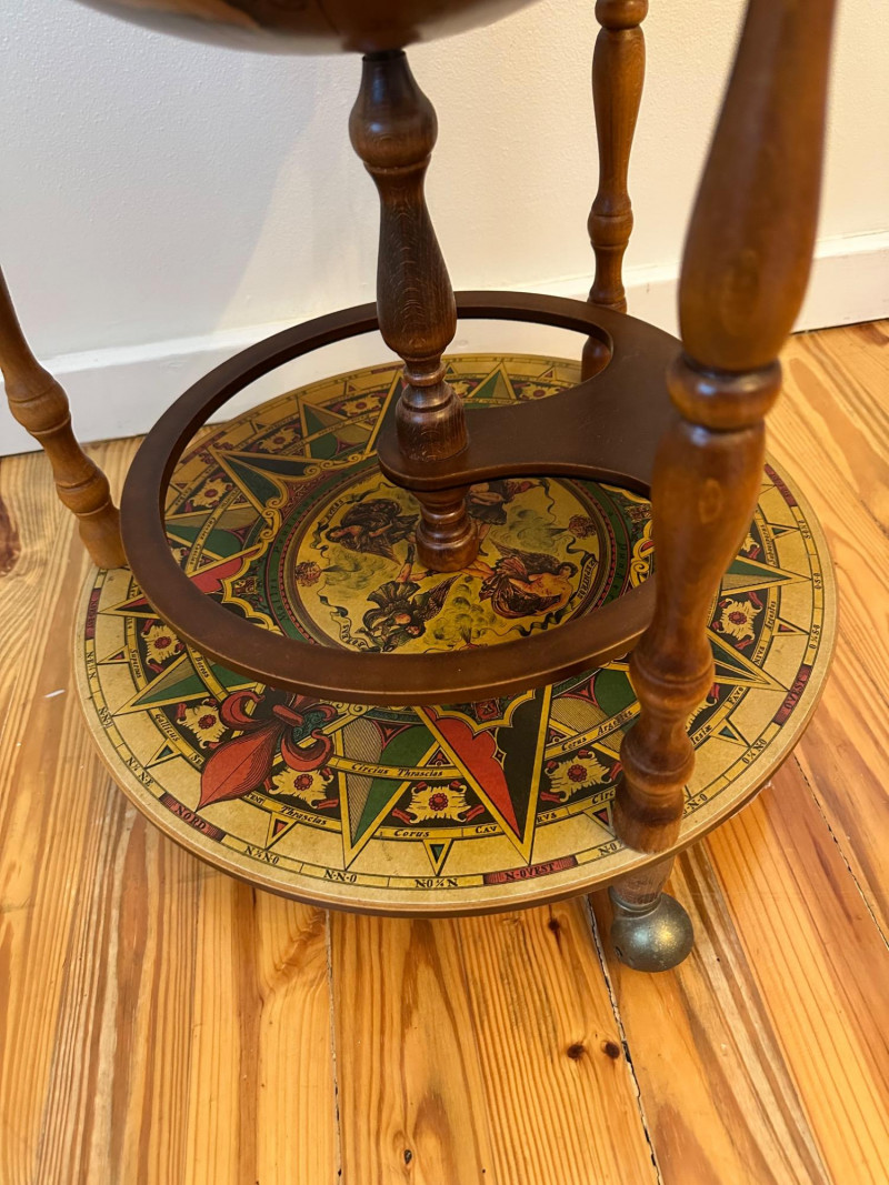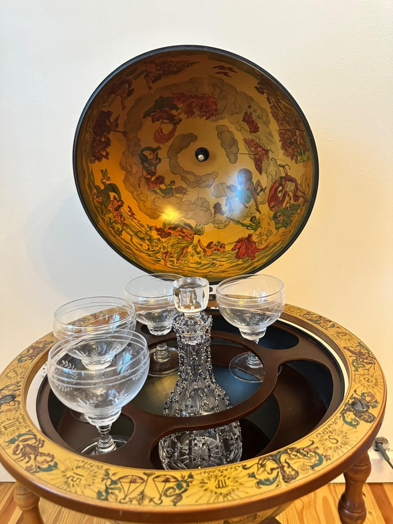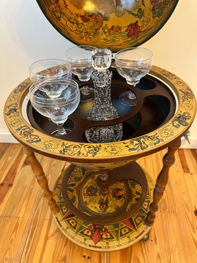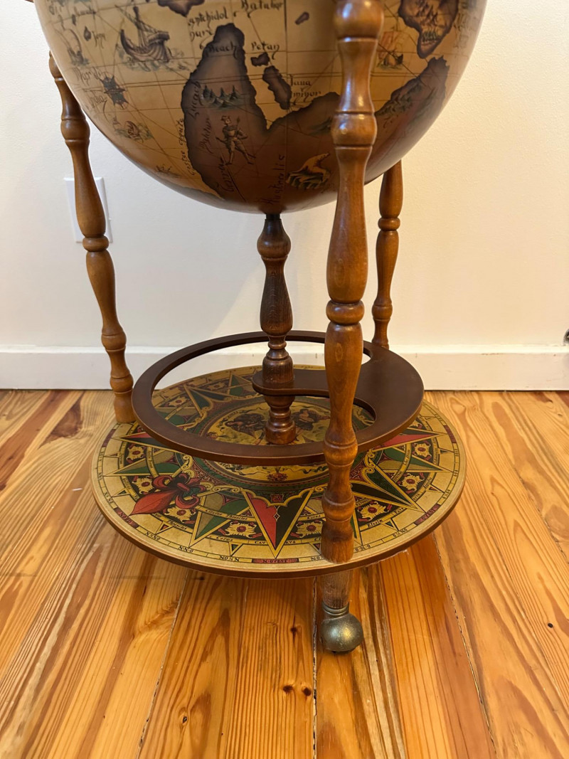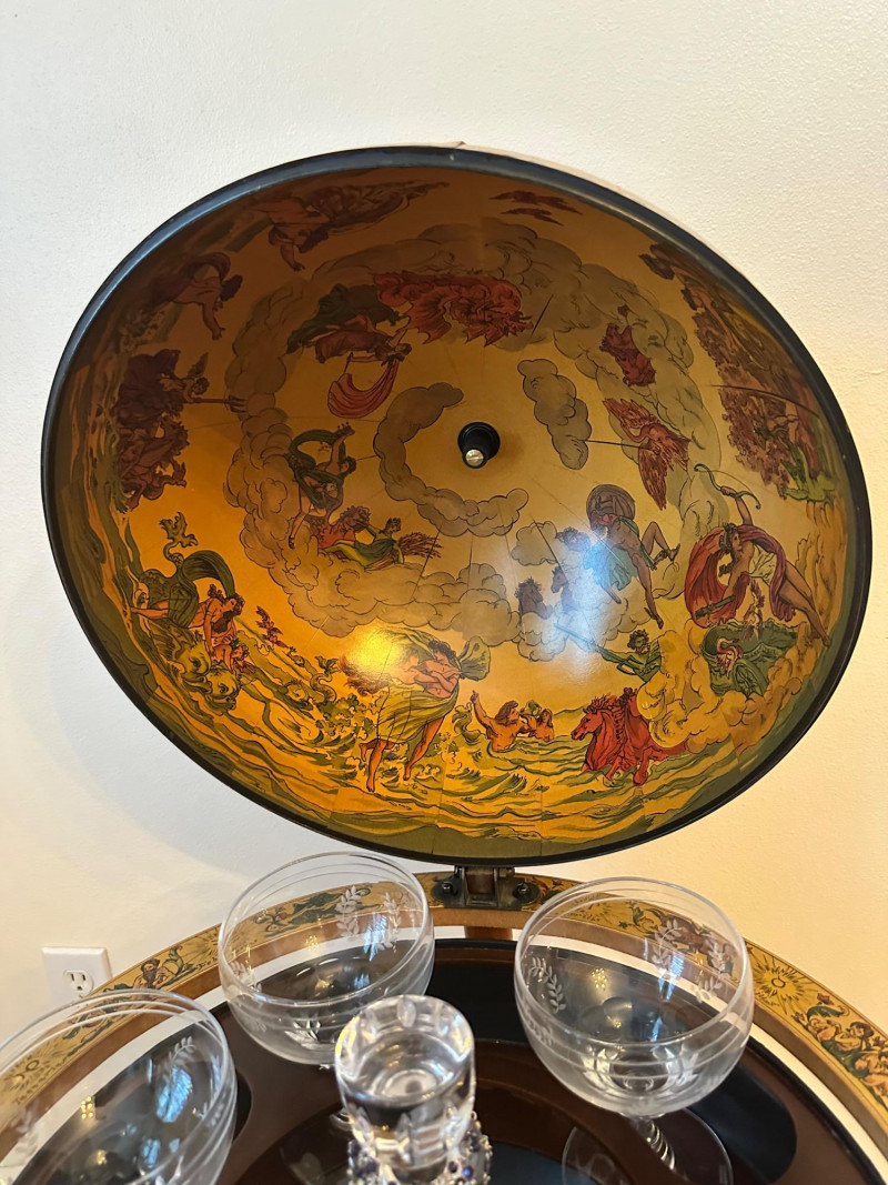Globe Caddy Bar Cart with Bottle and Glass Storage Standing globe bar cart with an antique-style map exterior and decorative interior. The hinged top opens to reveal a fitted compartment that holds a decanter and four glasses. Features zodiac and mythological motifs around the rim and base. Supported by three turned wood legs and a circular stretcher shelf with matching illustrations. Set on caster wheels for mobility. Measurements: