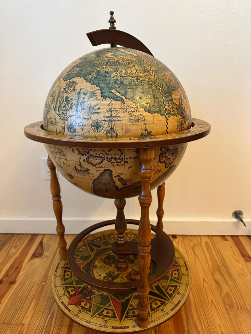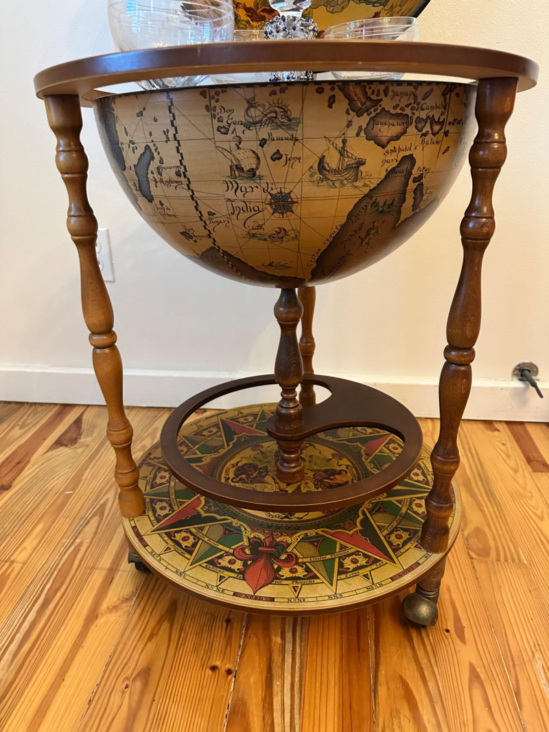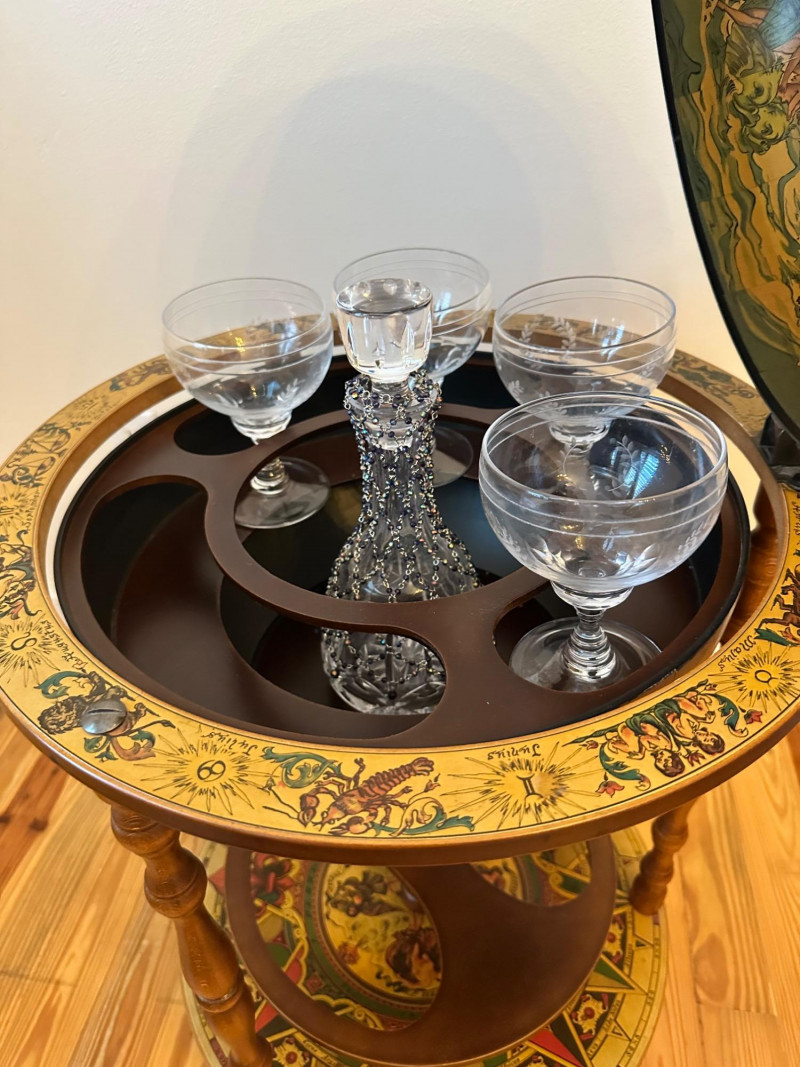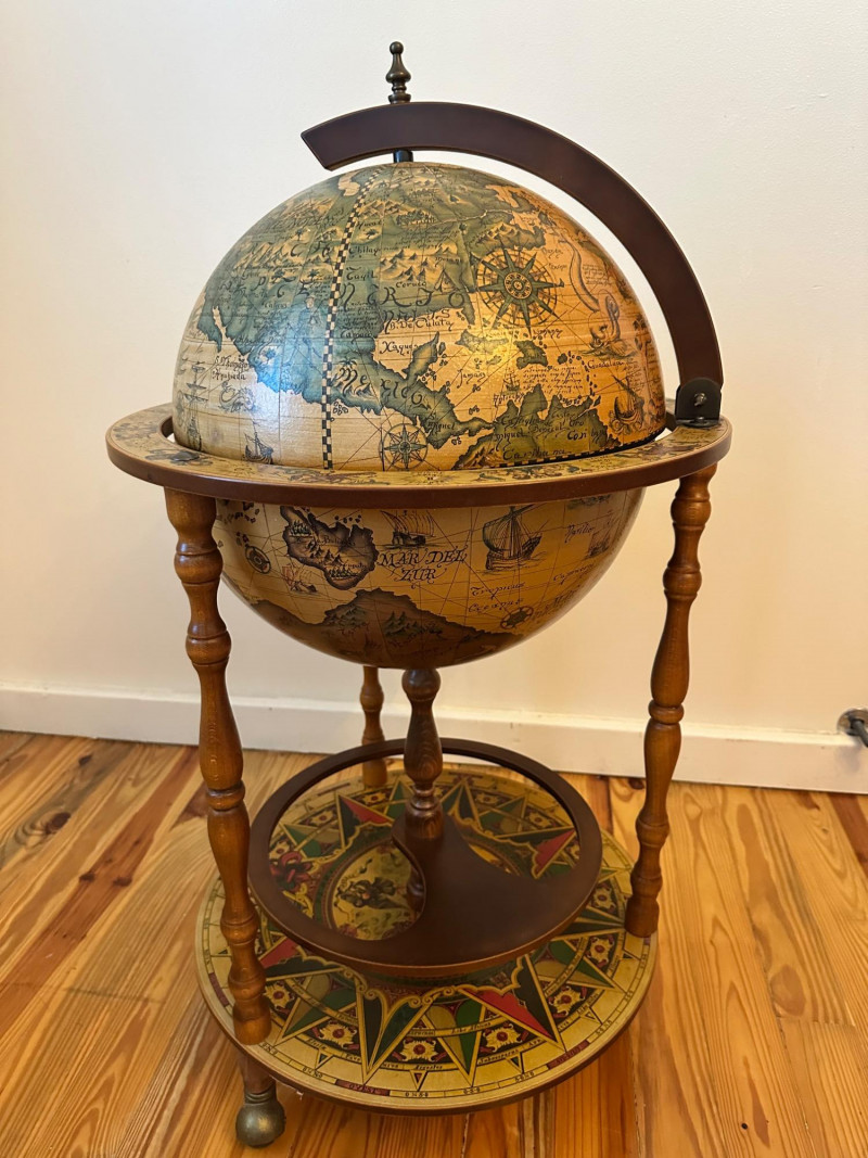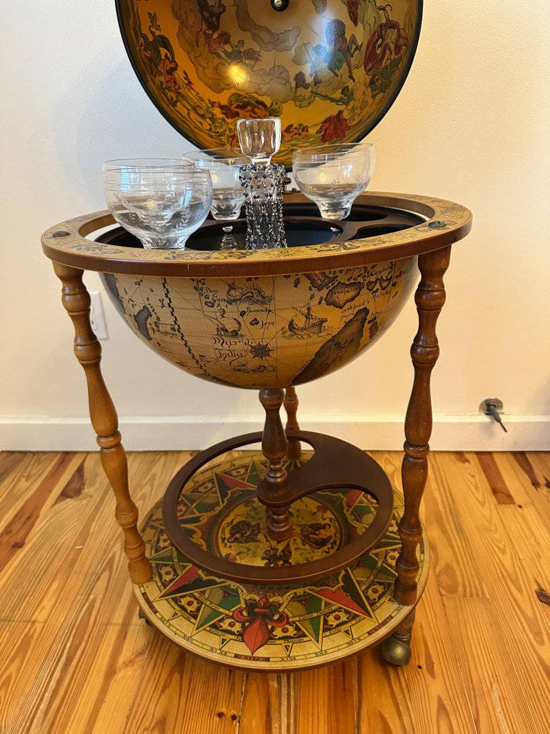 Globe Caddy Bar Cart with Bottle and Glass Storage Standing globe bar cart with an antique-style map exterior and decorative interior. The hinged top opens to reveal a fitted compartment that holds a decanter and four glasses. Features zodiac and mythological motifs around the rim and base. Supported by three turned wood legs and a circular stretcher shelf with matching illustrations. Set on caster wheels for mobility. Measurements: