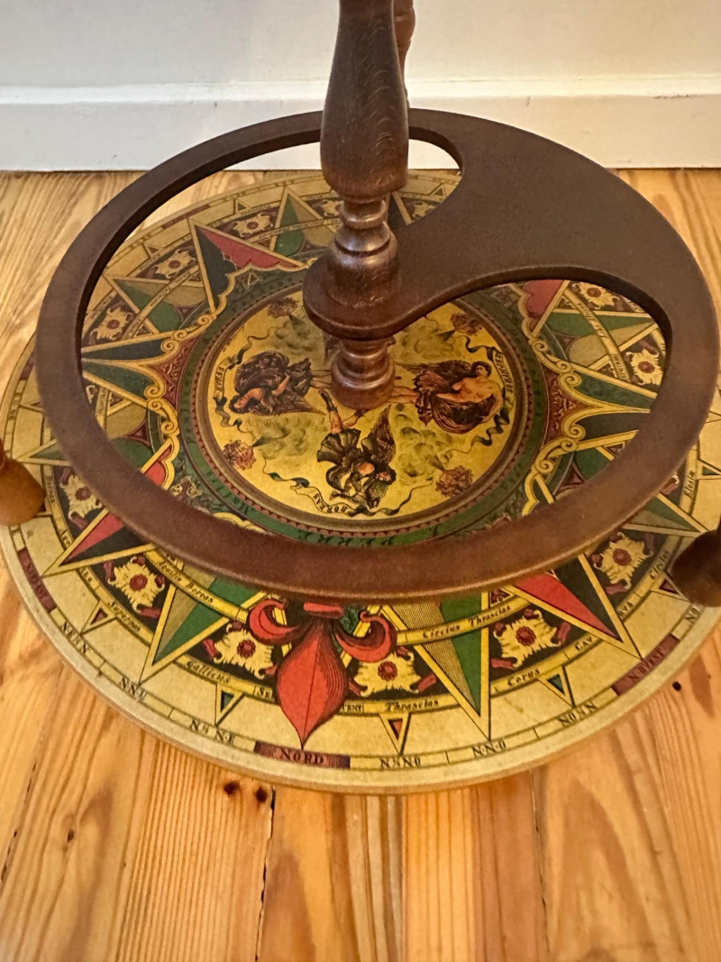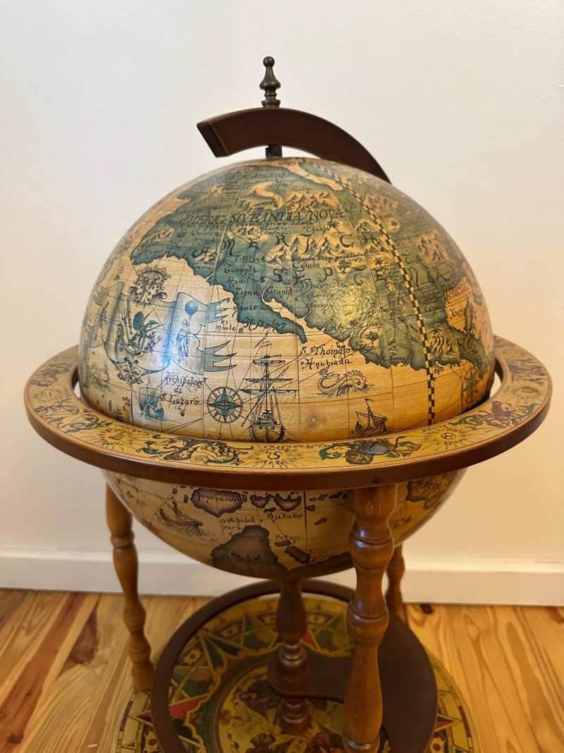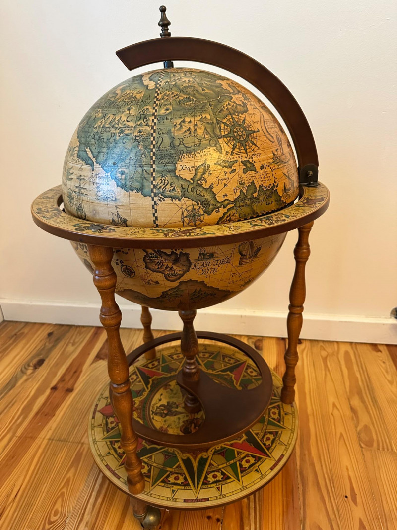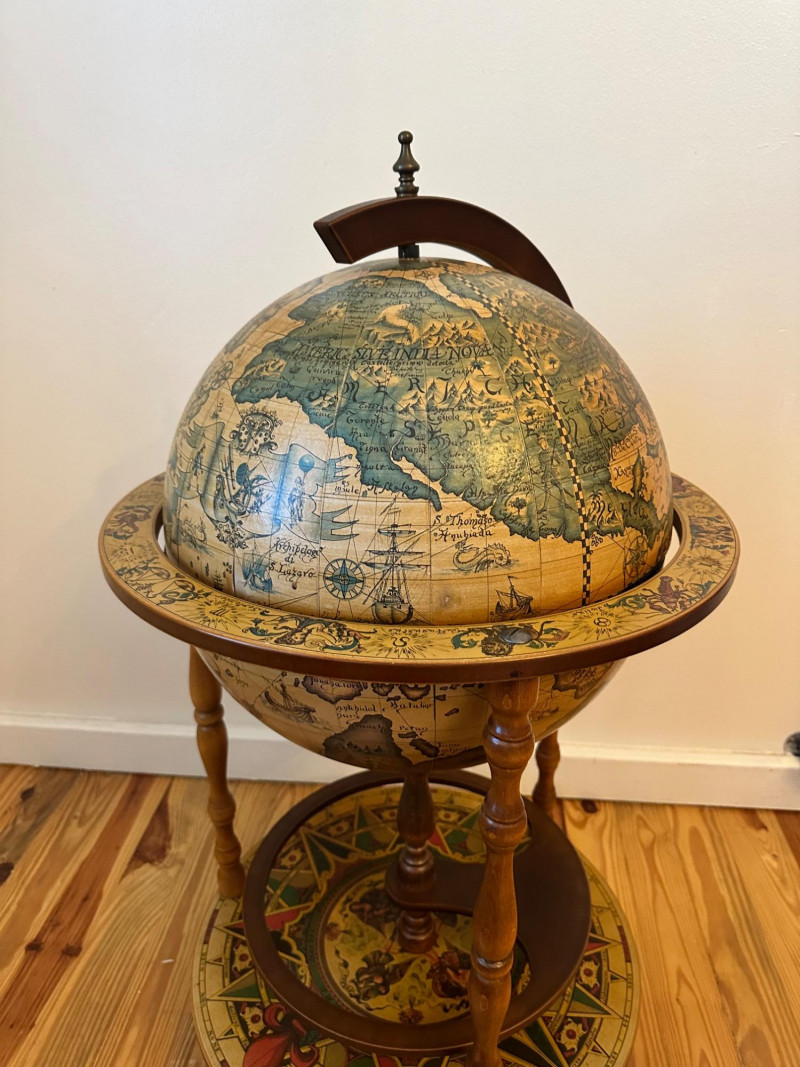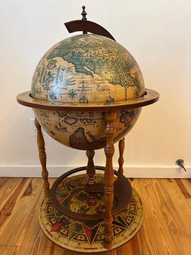 Globe Caddy Bar Cart with Bottle and Glass Storage Standing globe bar cart with an antique-style map exterior and decorative interior. The hinged top opens to reveal a fitted compartment that holds a decanter and four glasses. Features zodiac and mythological motifs around the rim and base. Supported by three turned wood legs and a circular stretcher shelf with matching illustrations. Set on caster wheels for mobility. Measurements:
