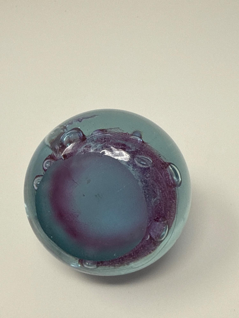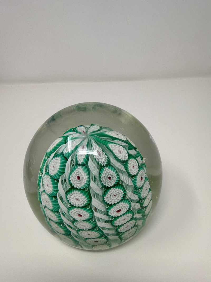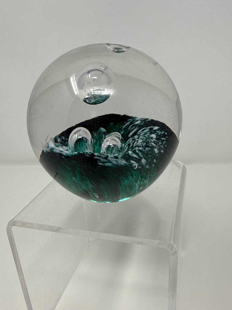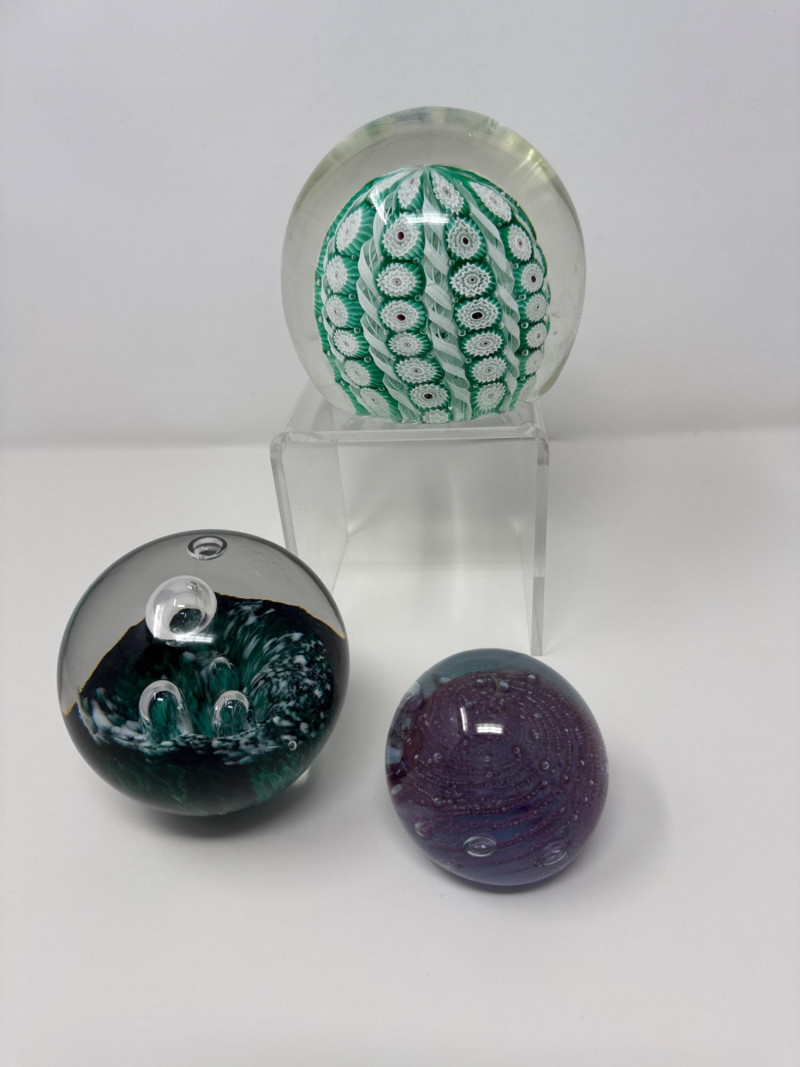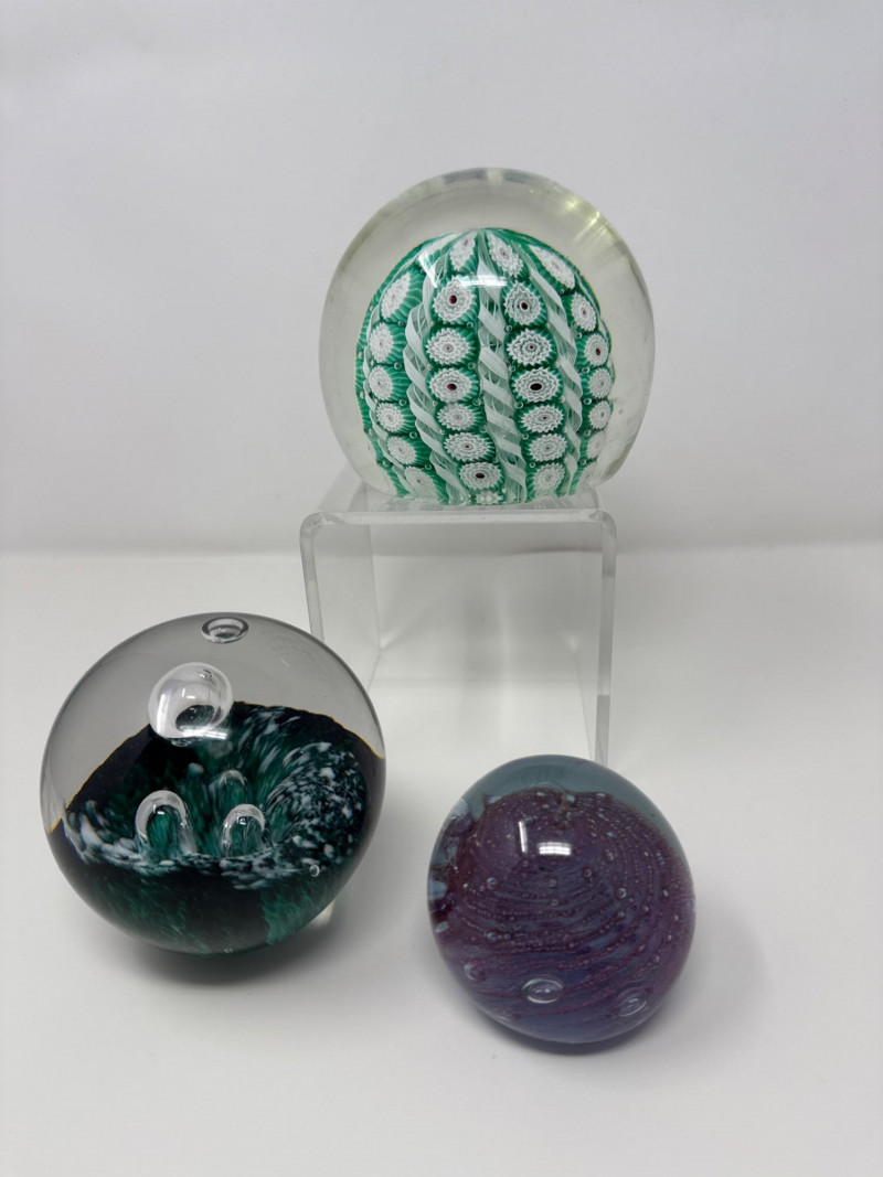 Collection of Art Glass Paperweights Assorted collection of decorative art glass paperweights in various colors and patterns, including millefiori-style canes, controlled bubbles, and swirled inclusions. The group features both clear and colored bases with intricate internal designs. Sizes range from approximately 2 1/2" to 4" in diameter. Measurements: Largest: approx. 4” x 4” Smallest: approx. 2.5” x 2.5”