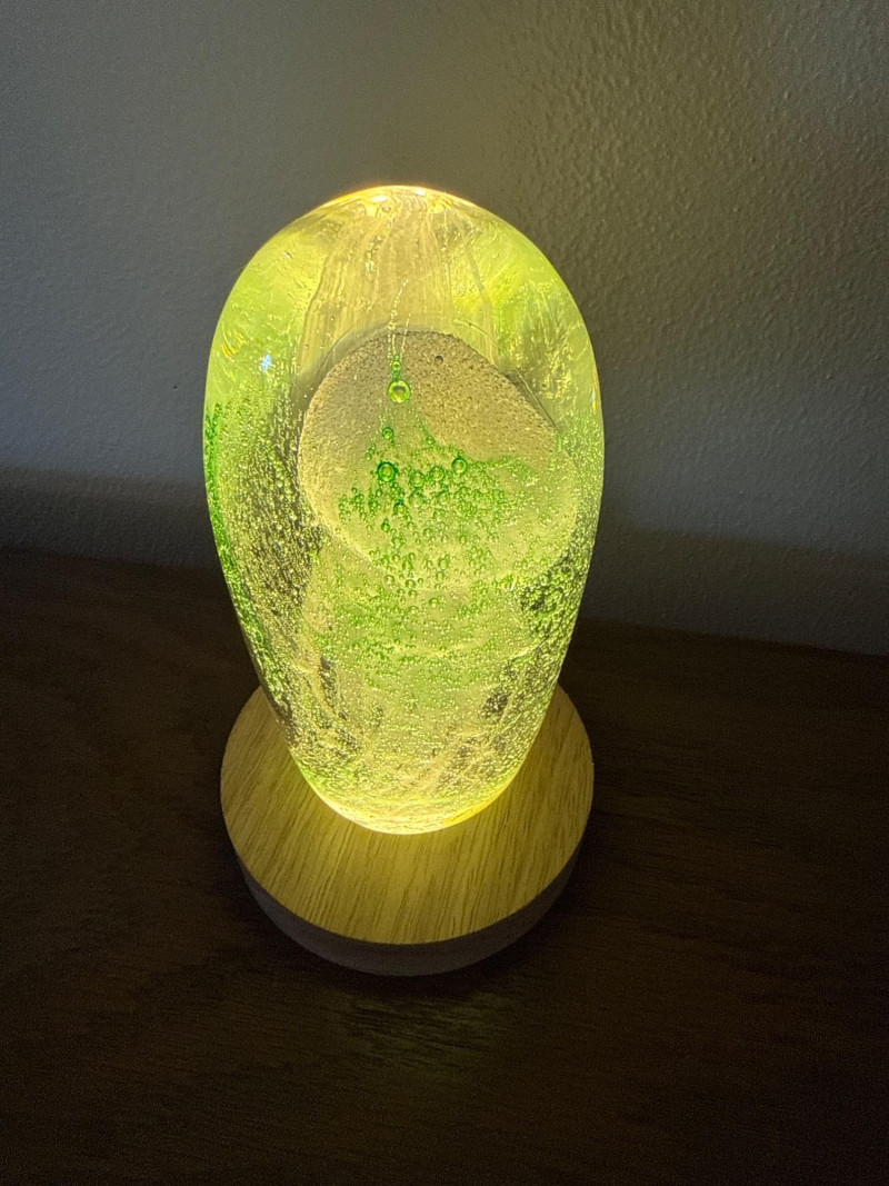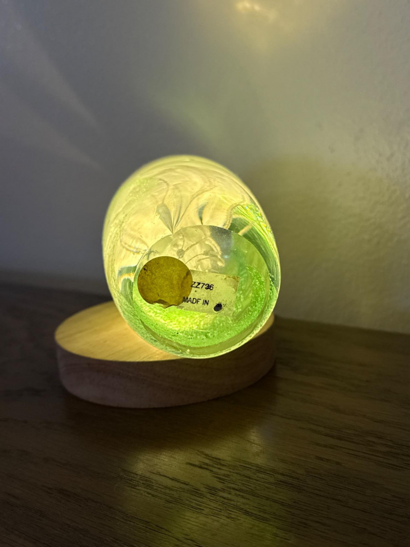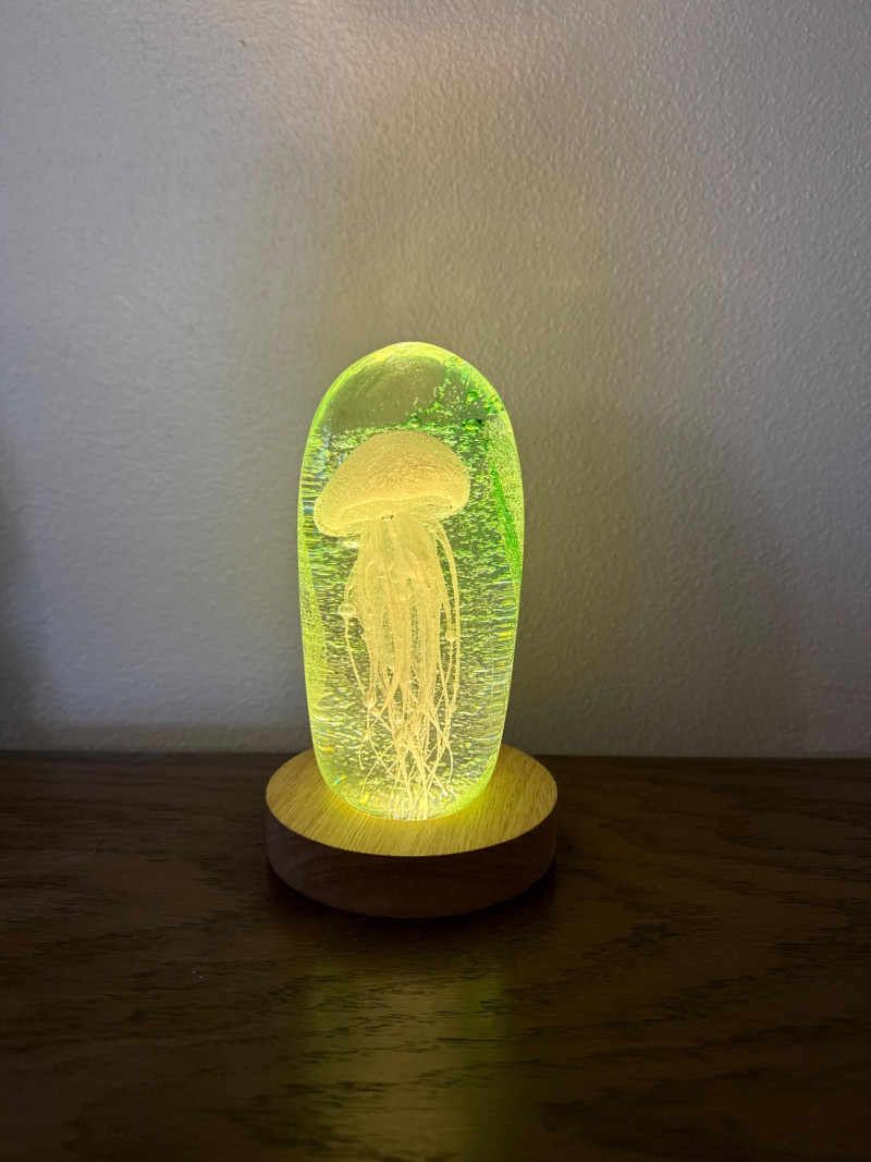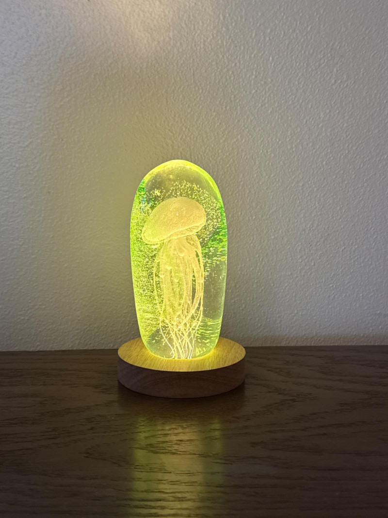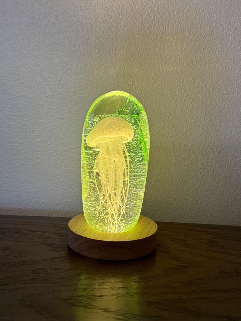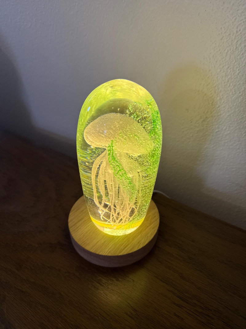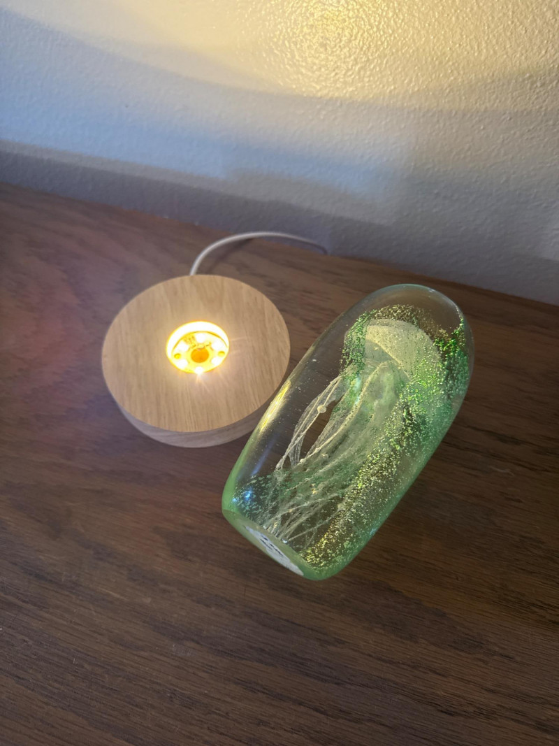 Glass Jellyfish Paperweight with Lighted Base Encased glass paperweight featuring a clear jellyfish design suspended in green-tinted bubbles. The piece sits on a circular wooden light base that illuminates the paperweight from below. Paperweight: 6 inches tall, 3 inches wide Light stand: 1 inch tall, 4 inches wide