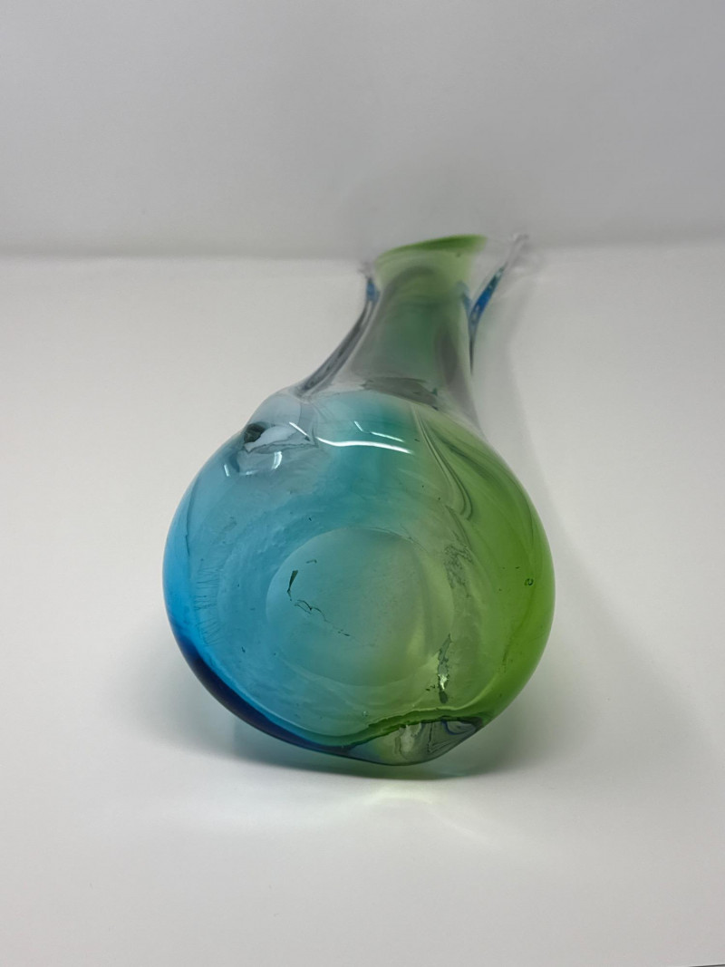Vintage Stretched Glass Vase in Blue, Green, and Clear – 19" Tall Tall freeform art glass vase featuring blended blue, green, and clear glass with a stretched silhouette. The piece has a rounded base and a twisted flared opening, showcasing a sculptural form throughout. Measurements: