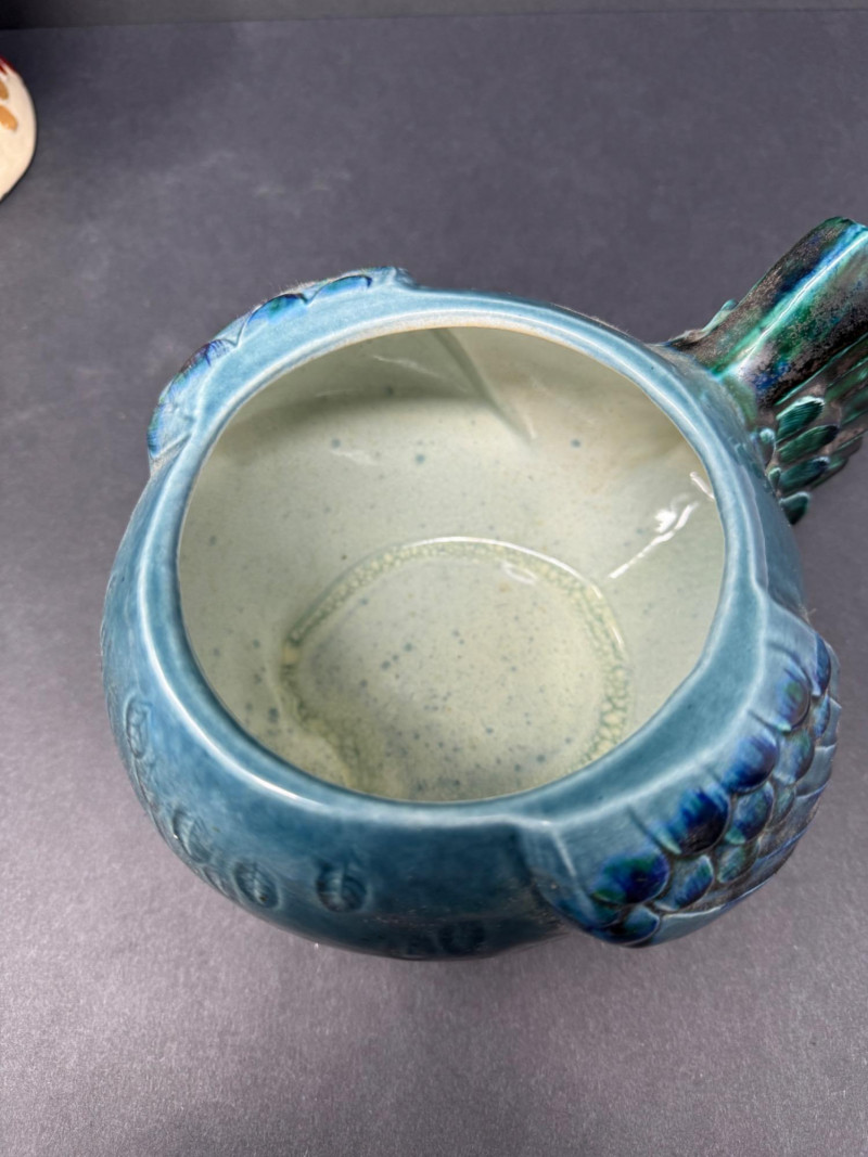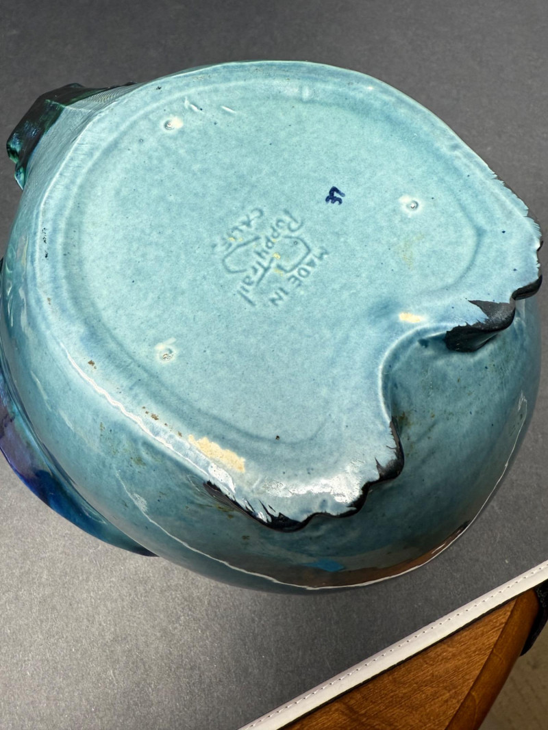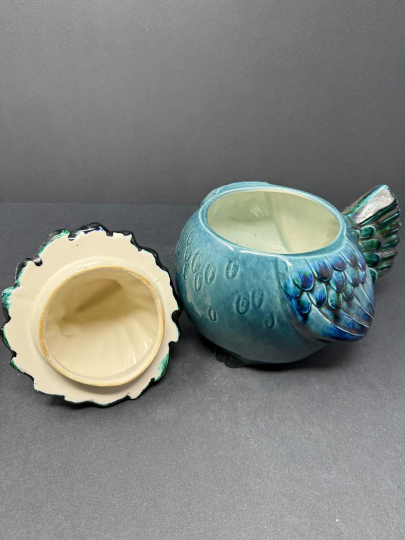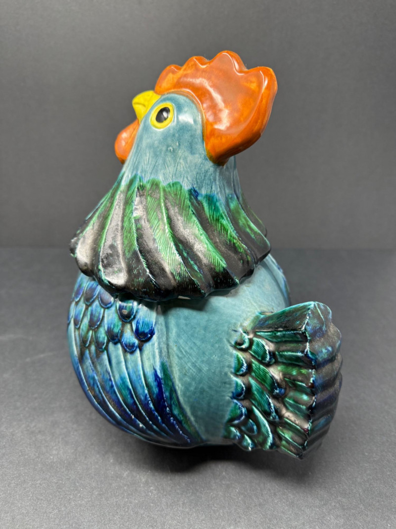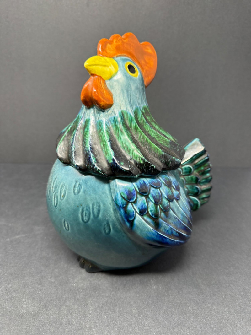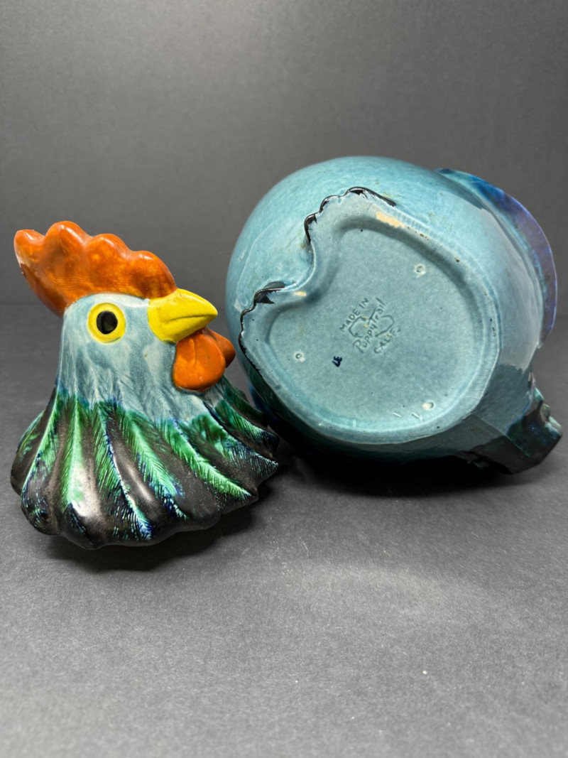 Metlox Poppytrail Blue Rooster Cookie Jar Ceramic cookie jar in the shape of a rooster, featuring a multicolor glaze with blue, green, and orange accents. Made by Metlox Pottery under the Poppytrail line in California, marked on the base: “Made in Calif / Poppytrail / USA.” The piece includes a fitted lid in the shape of the rooster’s head. The interior is glazed, and the base has visible maker’s marks.