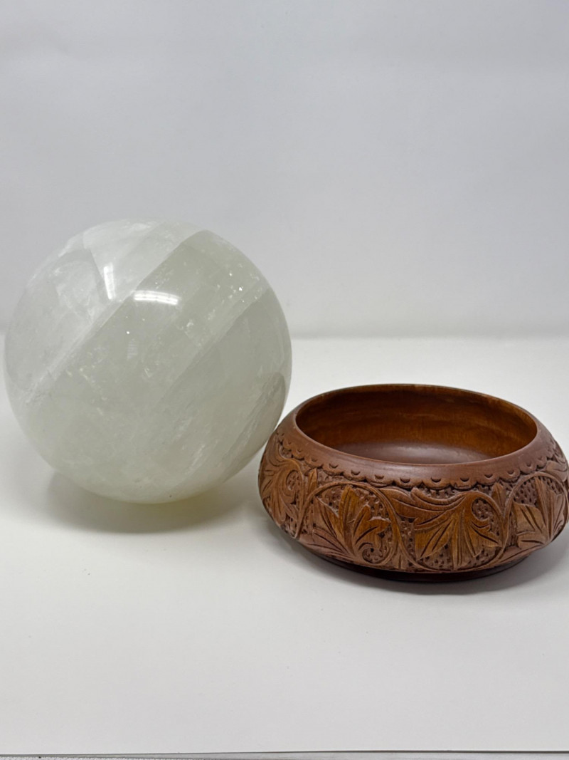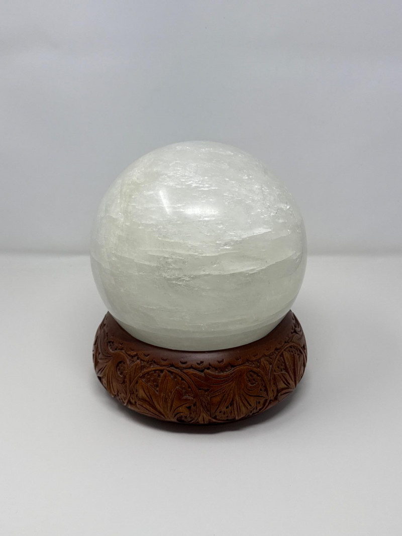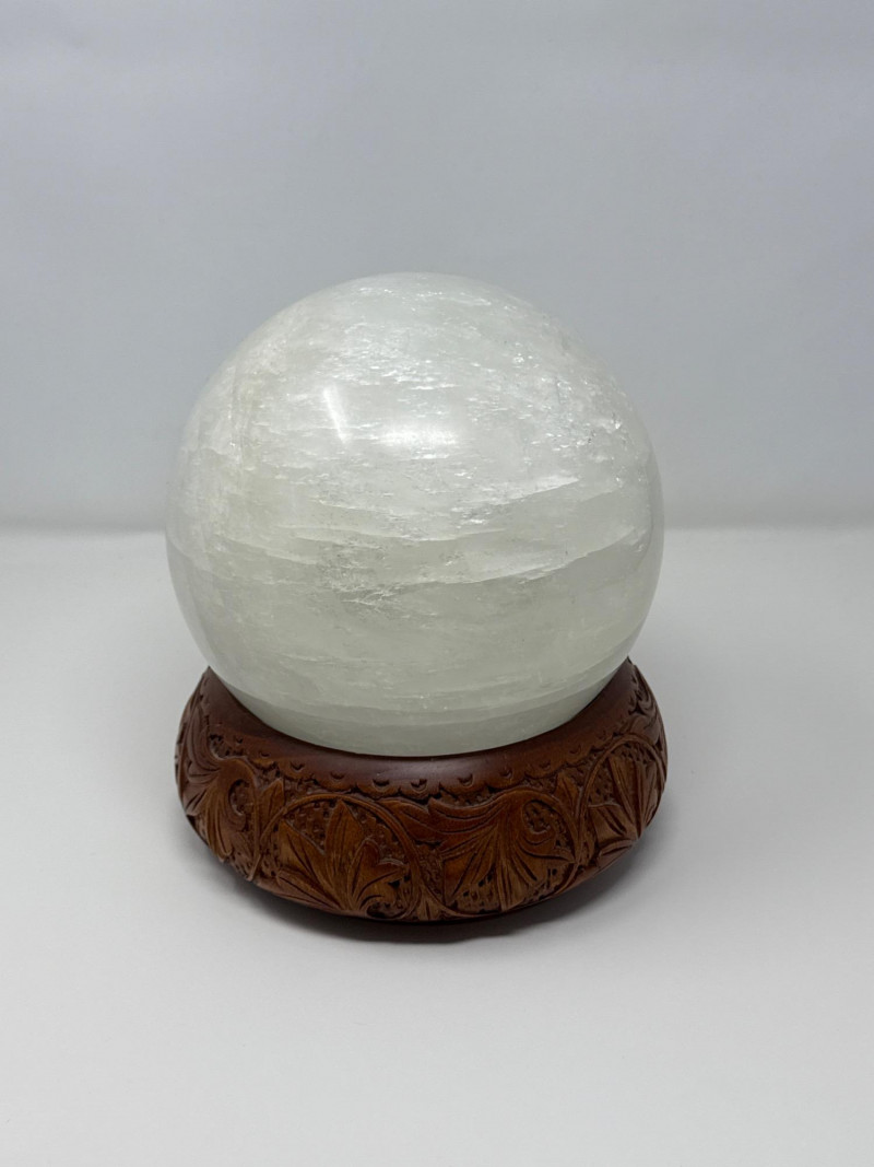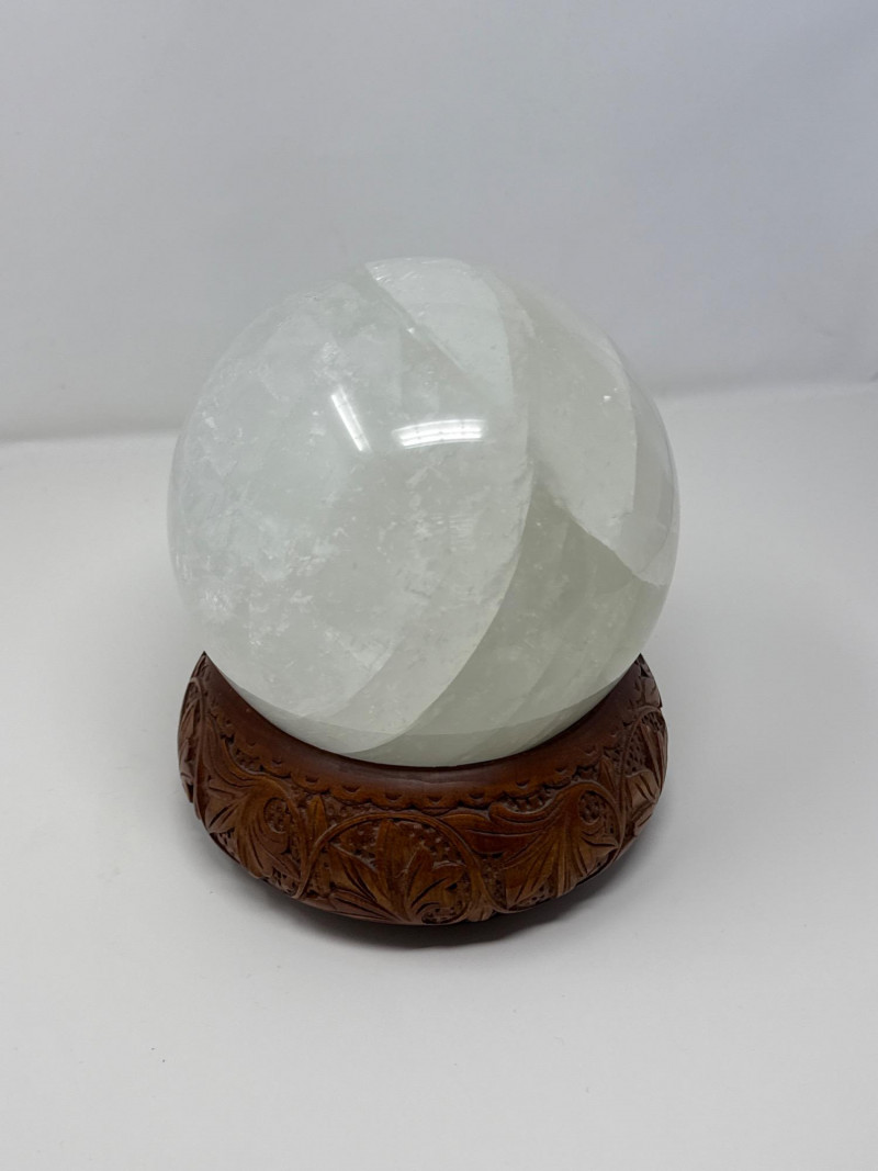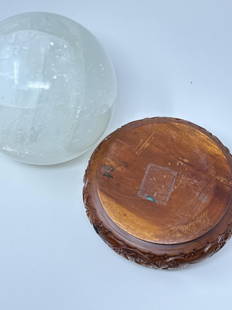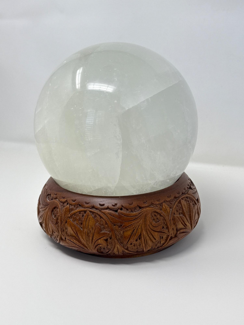 Large Quartz Crystal Sphere from Brazil on Carved Wood Base This large quartz crystal sphere from Brazil features a translucent surface with natural internal striations and subtle variations in texture. It rests securely on a separate carved wooden base with a recessed top and an ornate relief pattern of stylized foliage. The sphere and base are both in good condition, with no visible damage. Details: Material: Quartz crystal (sphere), carved wood (base) Origin: Brazil (crystal) Measurements (overall with base): Height: 9 inches Width: 7 inches
