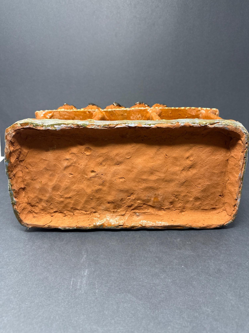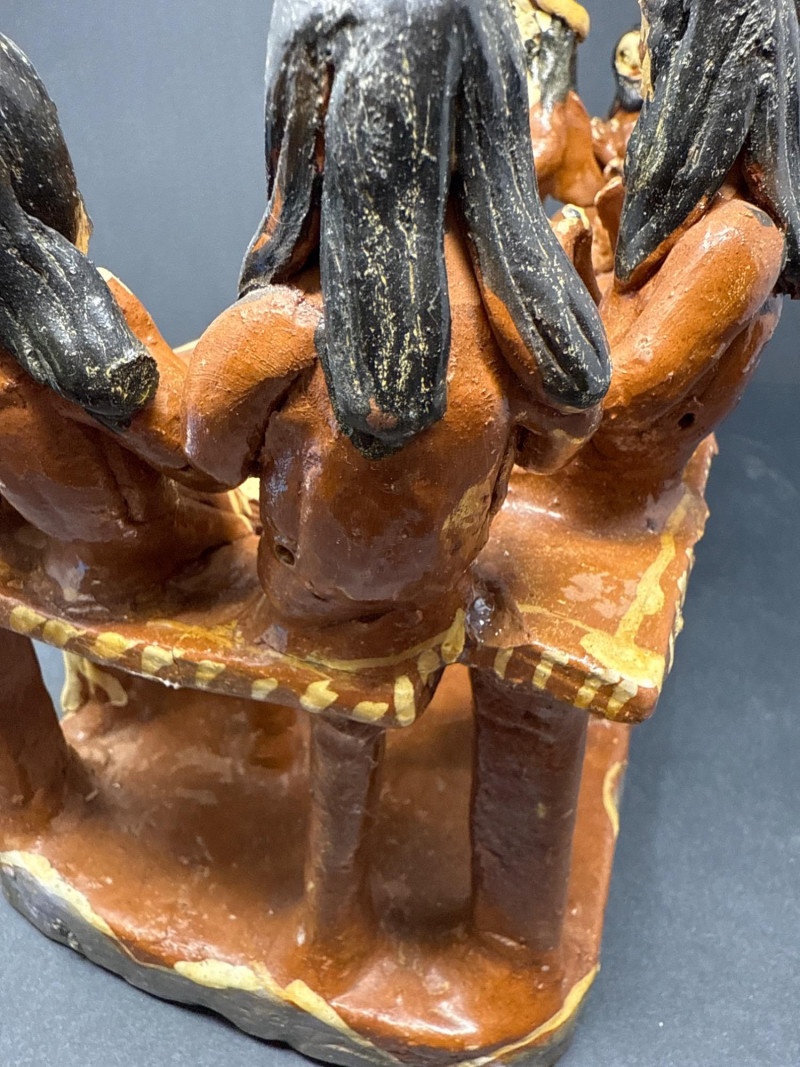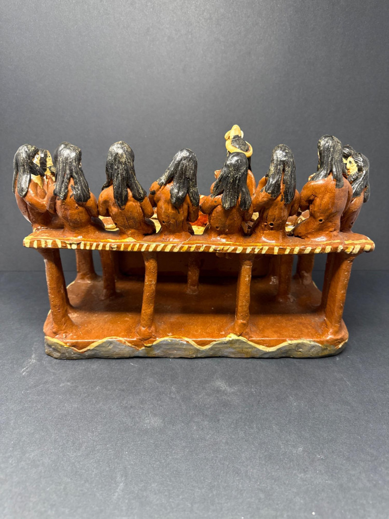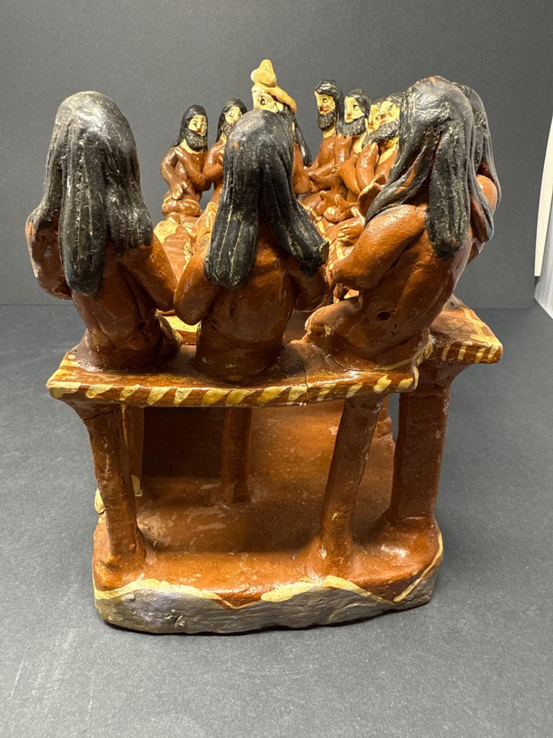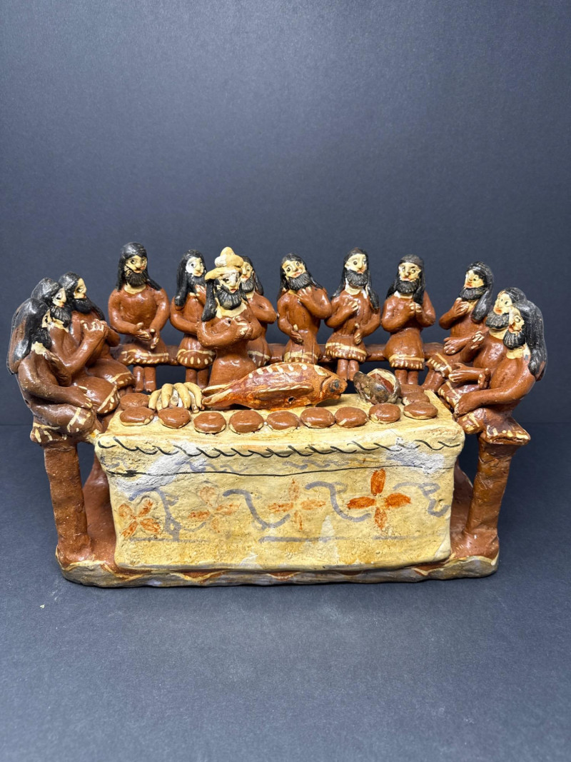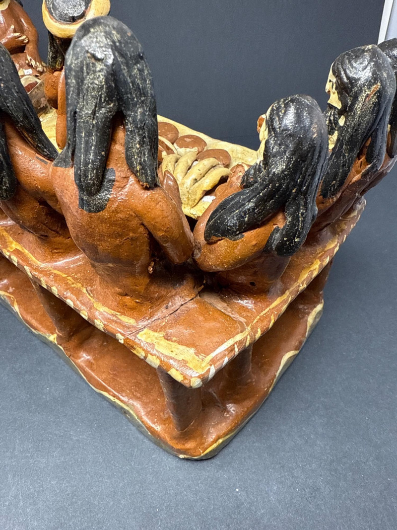 Vintage Mexican Ceramic Folk Art “The Last Supper” Handcrafted ceramic sculpture depicting “The Last Supper” in traditional Mexican folk art style. The piece features thirteen seated figures gathered around a central table with food, modeled in vivid earthy tones. The figures and table are integrated into a single unified form with decorative floral and wave motifs on the table’s front panel. Note: Some visible repaired cracks, particularly on the back and top edges, but no missing elements. See photos.