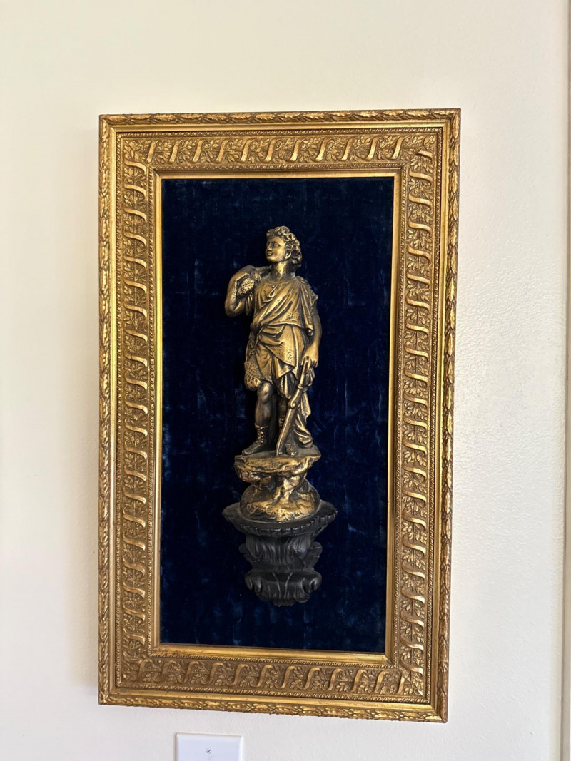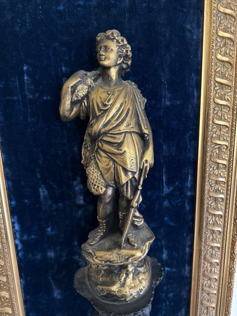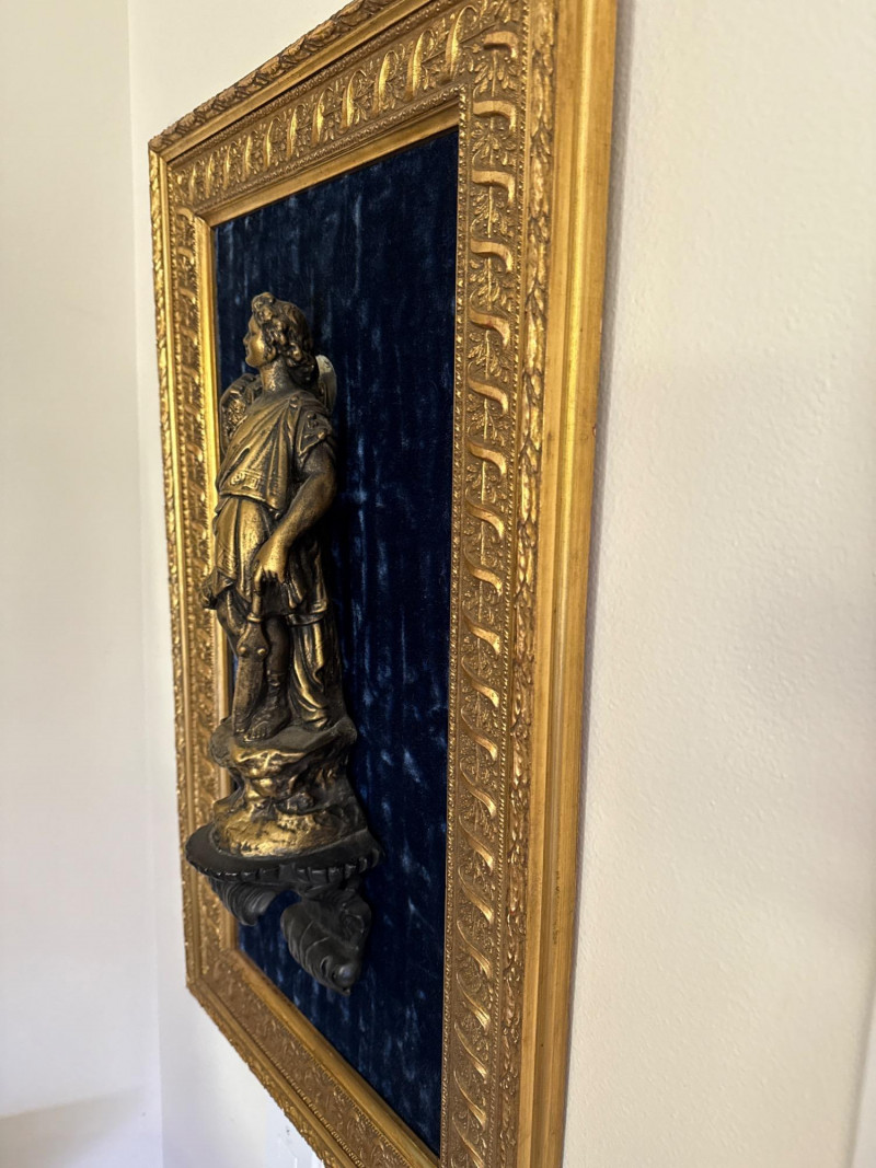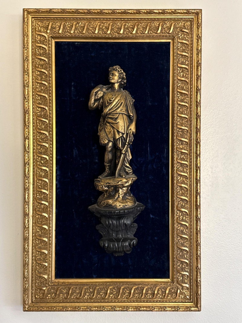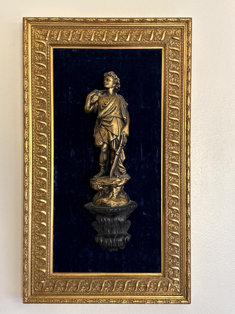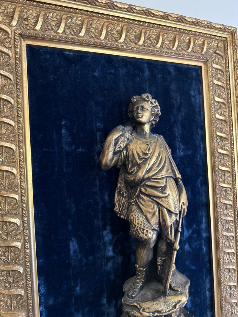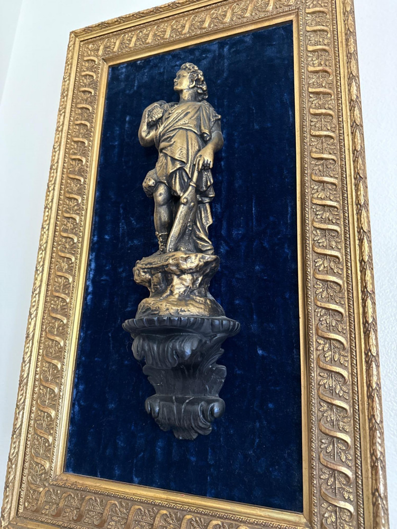 Metallic and Velvet Three-Dimensional Sculpture Art #1 Wall-mounted three-dimensional metal sculpture of a classical male figure, set against a dark blue velvet backing. The figure stands on a sculpted pedestal and is framed in a wide, ornate gold frame featuring repeating foliate and wave patterns. The composition creates a strong visual contrast between the metallic figure and the soft velvet background. Dimensions: