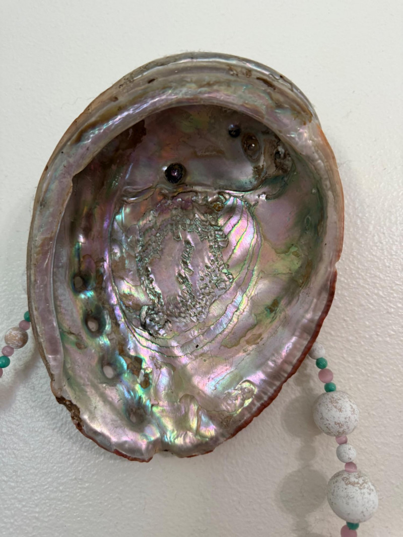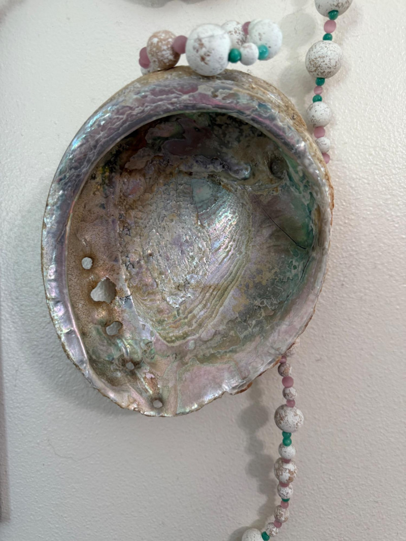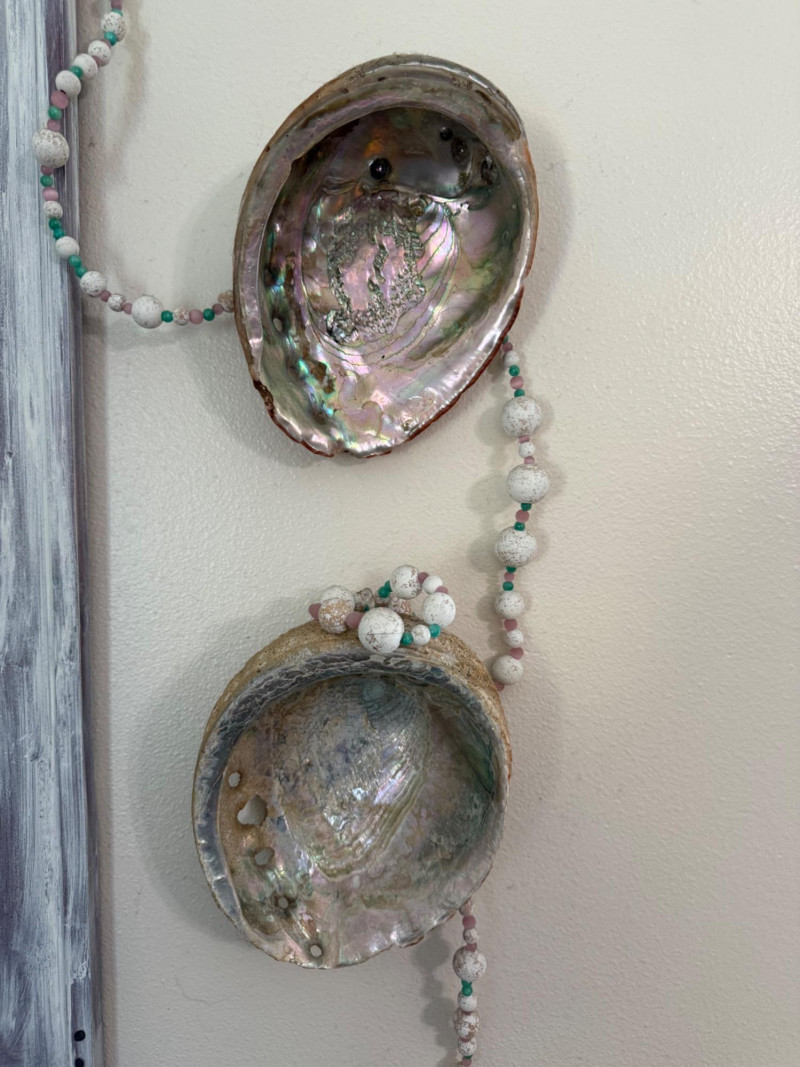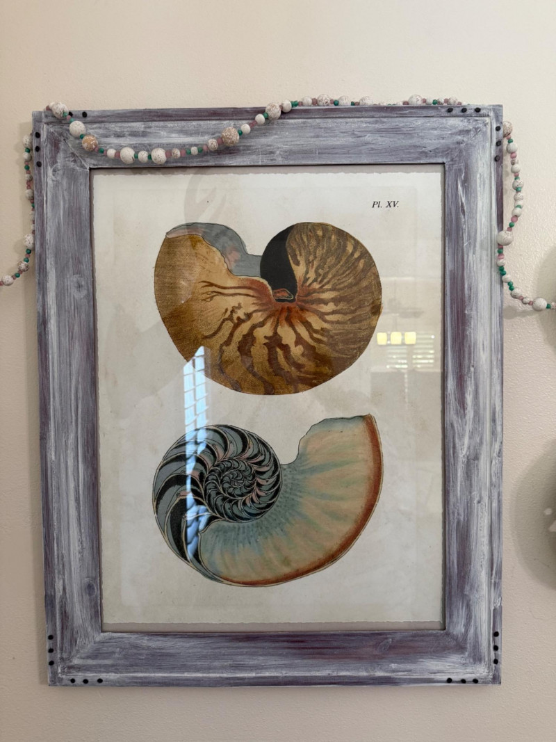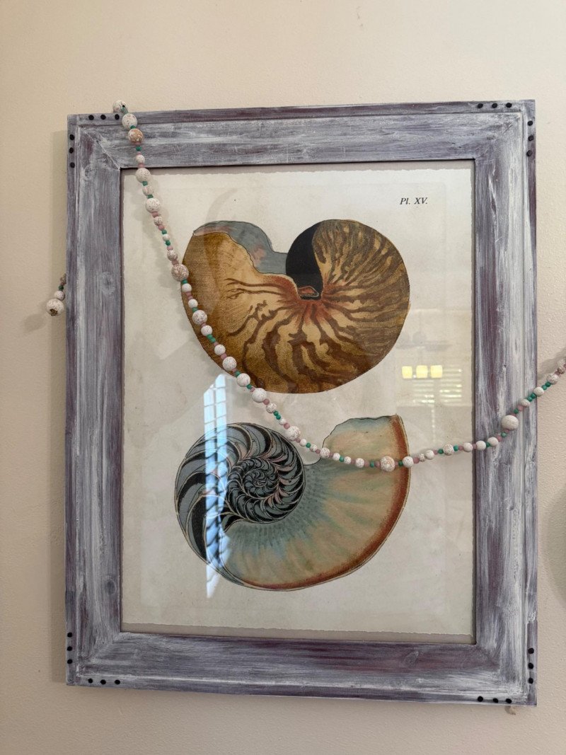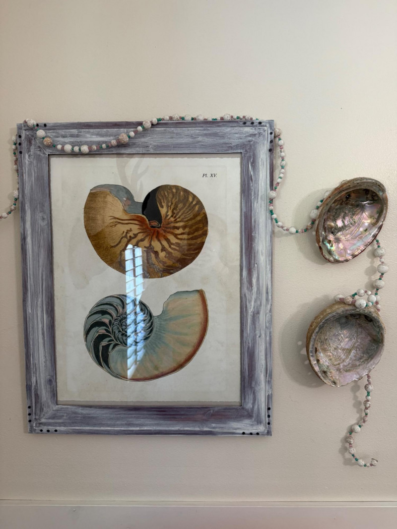 Vintage Shell Study Art and Shell Wall Lot Framed vintage shell illustration paired with a matching wall display of three iridescent abalone shells. The main artwork features a detailed nautilus cross-section print (Pl. XV) in a whitewashed wood frame, adorned with a pastel-toned bead garland. The abalone shells are mounted on the wall beside the frame, continuing the garland decor.