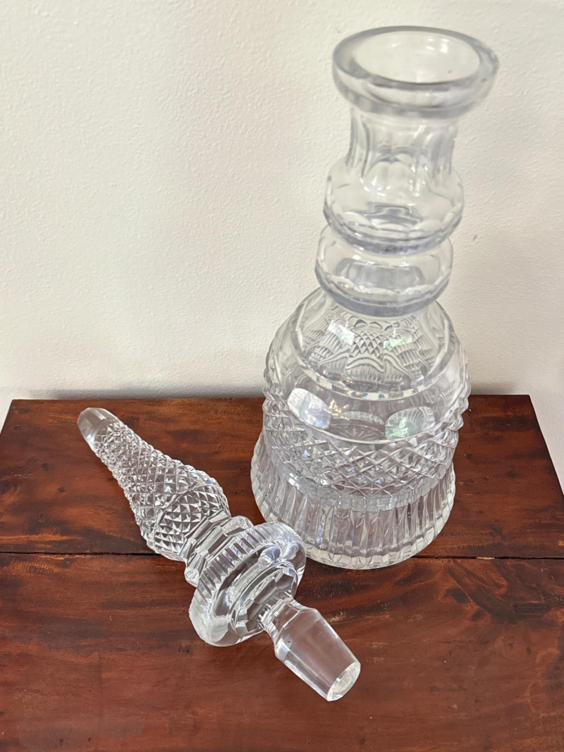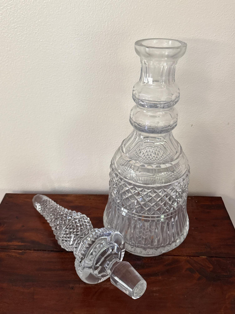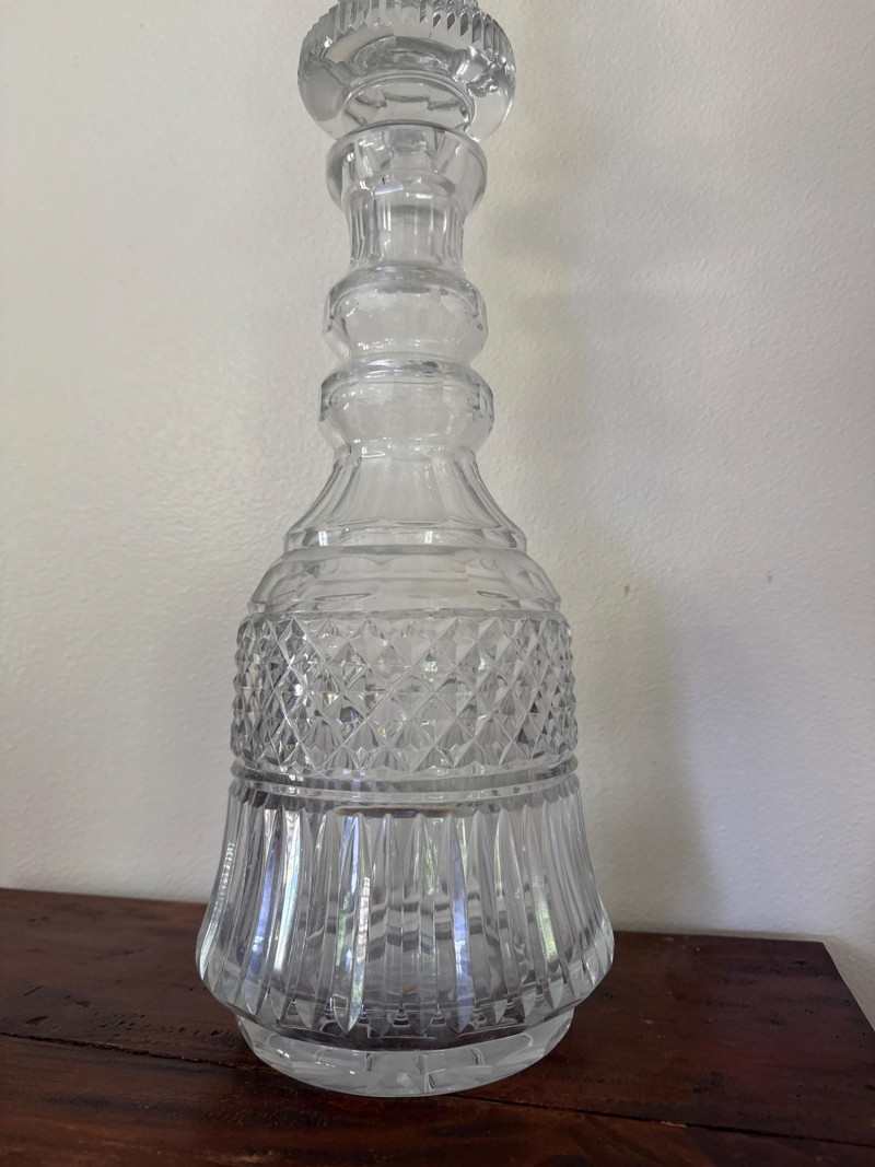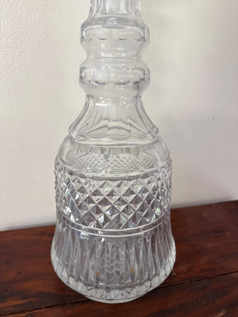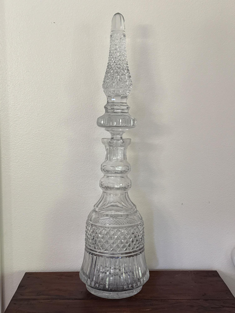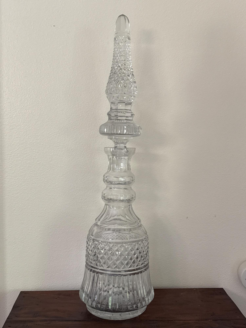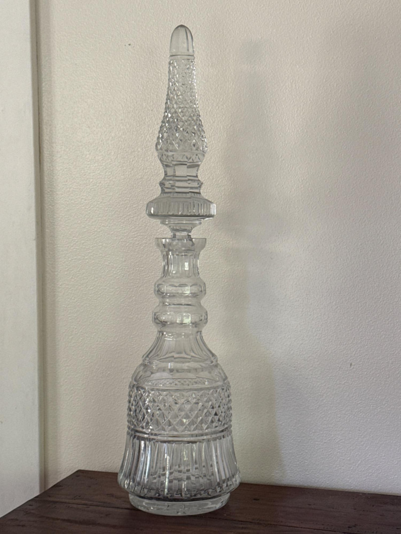 Bohemian Cut Crystal Decanter with Stopper This striking Bohemian cut crystal decanter showcases masterful craftsmanship and timeless elegance. Its tall, sculptural silhouette is accentuated by a dramatic, multi-faceted stopper that tapers to a fine point, catching and refracting light from every angle. The decanter’s body features a harmonious blend of design elements: a narrow, stepped neck flows gracefully into a broad, rounded base, richly adorned with deeply etched crosshatch and vertical fluting cuts that provide both texture and brilliance. The clear lead crystal construction gives it substantial weight and exceptional clarity, while the meticulously executed banded and geometric motifs are hallmarks of traditional Bohemian artistry. The stopper fits snugly into the neck, completing the piece with a sense of balance and refinement. Whether displayed as a centerpiece or used for serving, this decanter brings sophistication and a touch of old-world luxury to any bar or collection. Measurements: 7” W x 26” H (with stopper)
