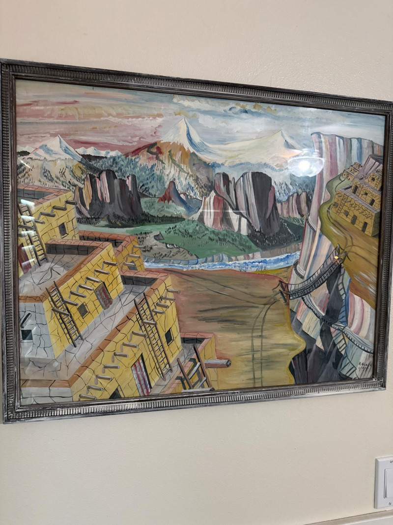 Vintage Southwestern Landscape Painting Signed R. Glaze Original 1944 painting depicting a stylized Western landscape featuring pueblo dwellings, canyon cliffs, and a winding river. The scene includes architectural and natural elements suggestive of the New Mexico or Four Corners region. Signed by the artist R. Glaze in the lower right corner with the date 11/23/44. Housed in a vintage metal frame with a framer's label from L. Soloman & Co., Chicago, IL on the reverse. Dimensions: