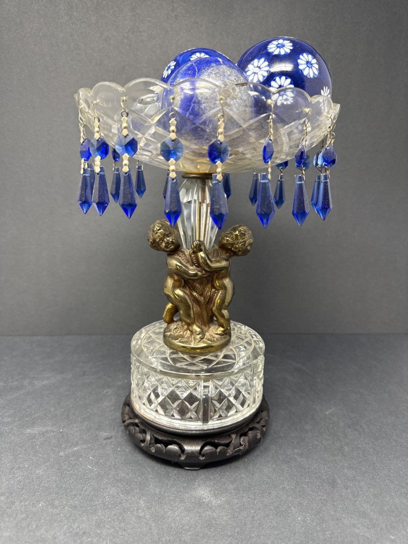 Vintage Brass Cherub Glass Bowl with Blue Glass Paperweights Vintage glass compote-style bowl supported by a brass cherub figurine on a cut-glass base, accented with blue prism-style hanging drops. Includes three blue-toned decorative glass spheres—two with white floral inlay and one with a marbled appearance. Note: one paperweight has a visible crack as shown. Minor rusting at the attachment point on the underside of the bowl. Dimensions:
