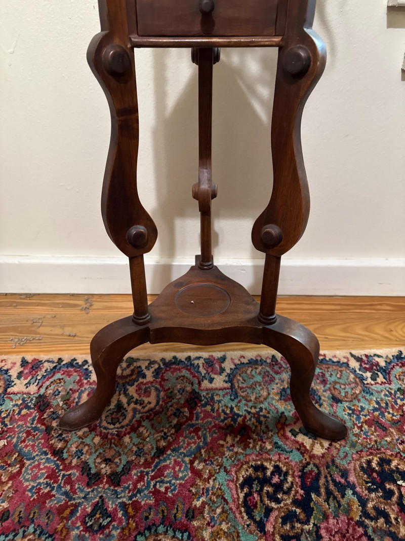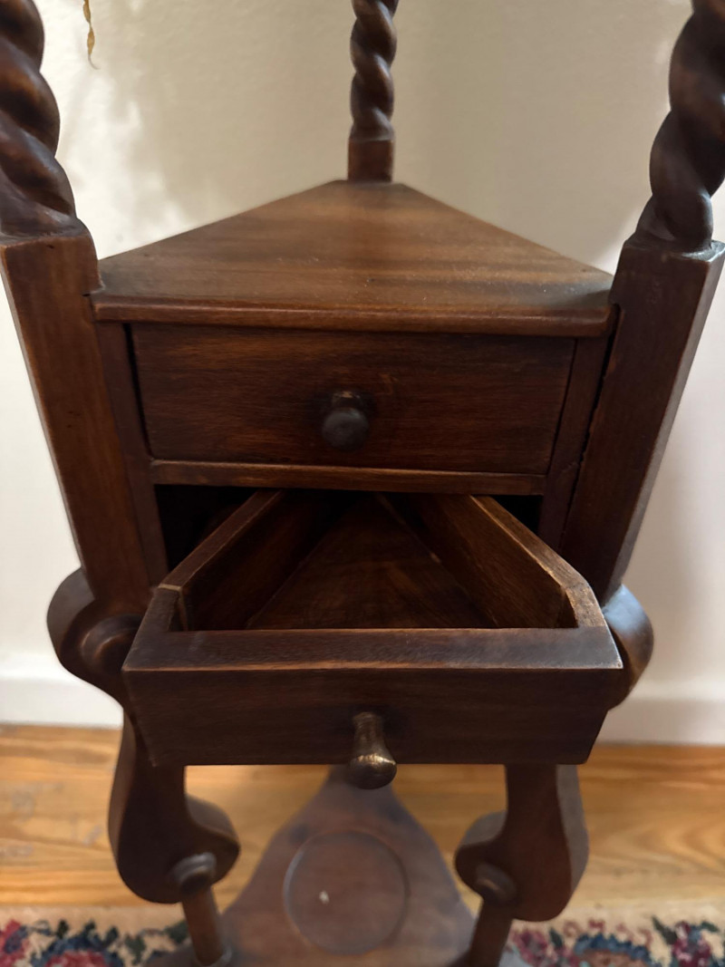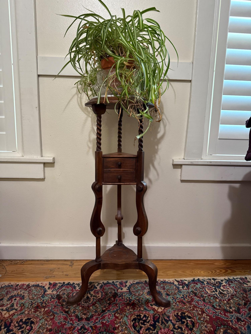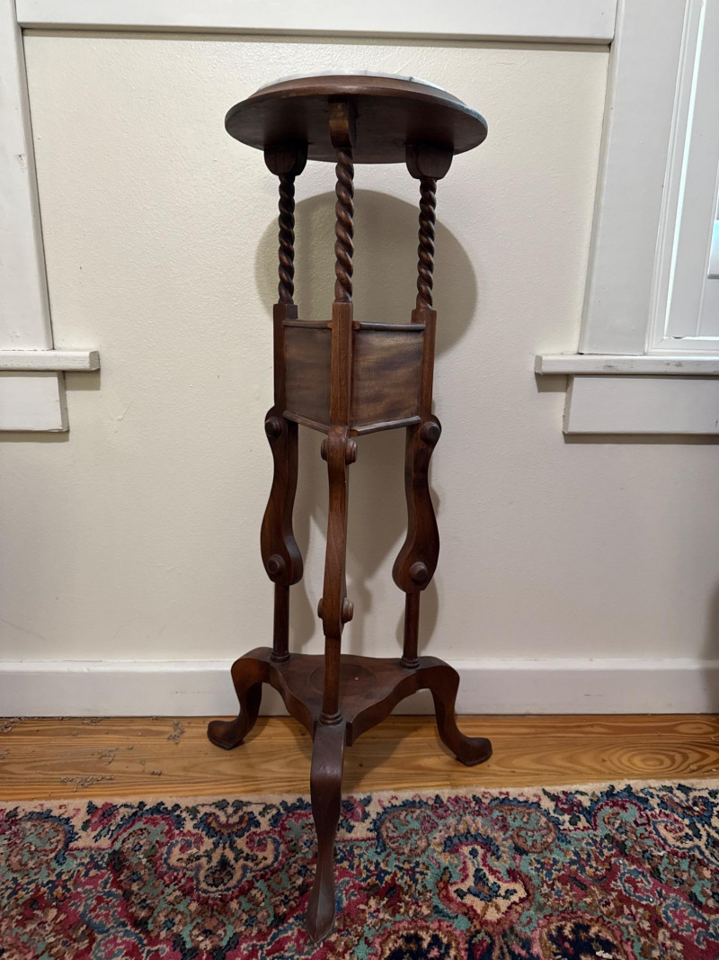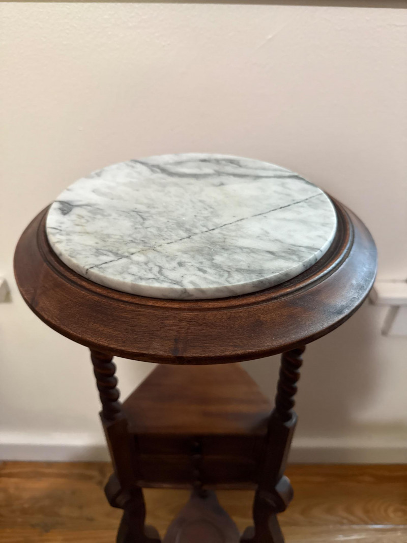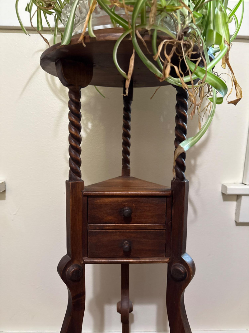 Vintage Barley Twist Mahogany Pedestal Stand with Marble Top and Drawer Mahogany pedestal stand with a round top fitted with a circular marble insert. Supported by three barley twist columns leading to a lower triangular platform that houses a single drawer with internal compartments and turned wooden knobs. The base consists of three cabriole legs joined by a central stretcher. A terracotta potted spider plant rests on top, with a glass saucer positioned beneath the pot. Terracotta potted spider plant included.