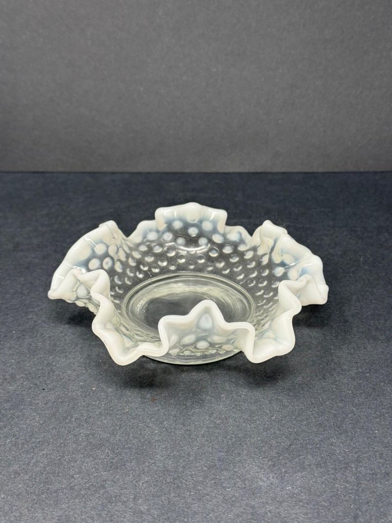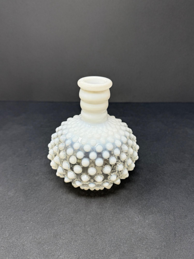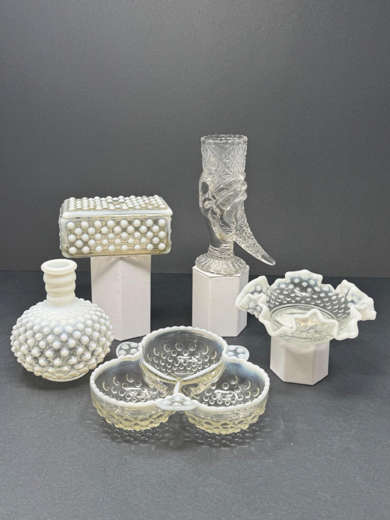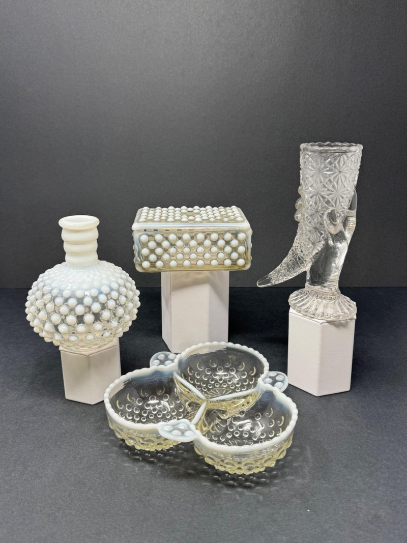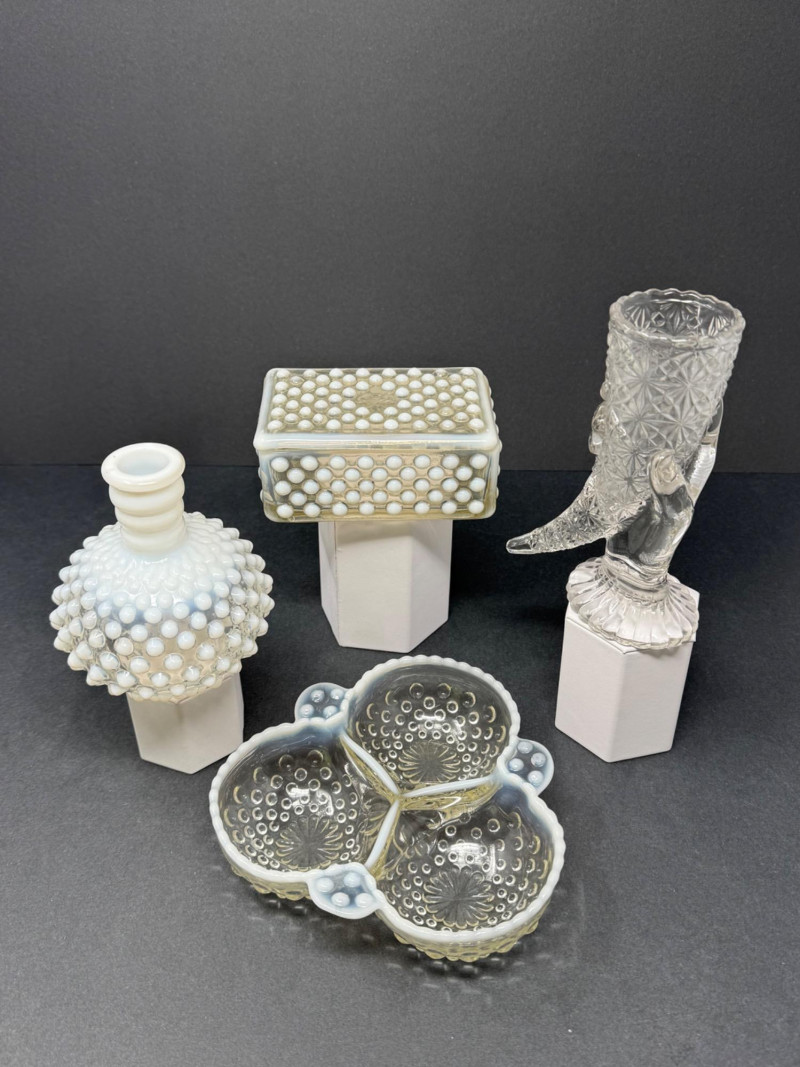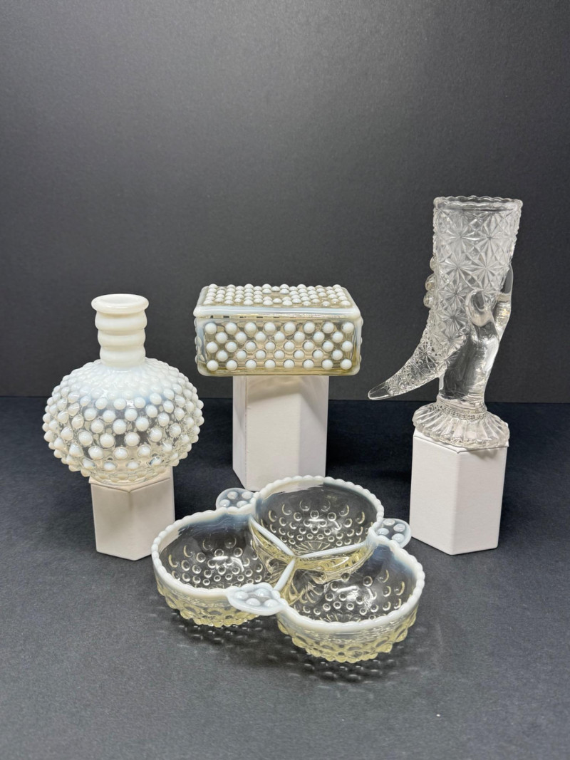 Antique Vintage Fenton Hobnail Opalescent and Pressed Glass Collection A curated collection of five antique and vintage glass pieces featuring hobnail opalescent and clear pressed designs. Based on form and style, these items are likely attributed to notable American makers, primarily Fenton and George Duncan & Sons: 1886 EAPG George Duncan & Sons Cornucopia Hand Vase – Clear pressed glass with flared rim, starburst pattern, and hand-shaped support. Fenton Moonstone Hobnail Trinket/Cigarette Box – Rectangular opalescent box with fitted lid and raised hobnail pattern. Fenton French Opalescent Hobnail Cologne Bottle – Bulbous hobnail form with ribbed neck in white opalescent glass. Fenton Moonstone Hobnail Clover Dish – Three-section divided candy dish with hobnail texture and scalloped edge. Fenton Opalescent Hobnail Ruffled Bowl, c.1940s – Crimped edge bowl with hobnail body and vaseline tint.