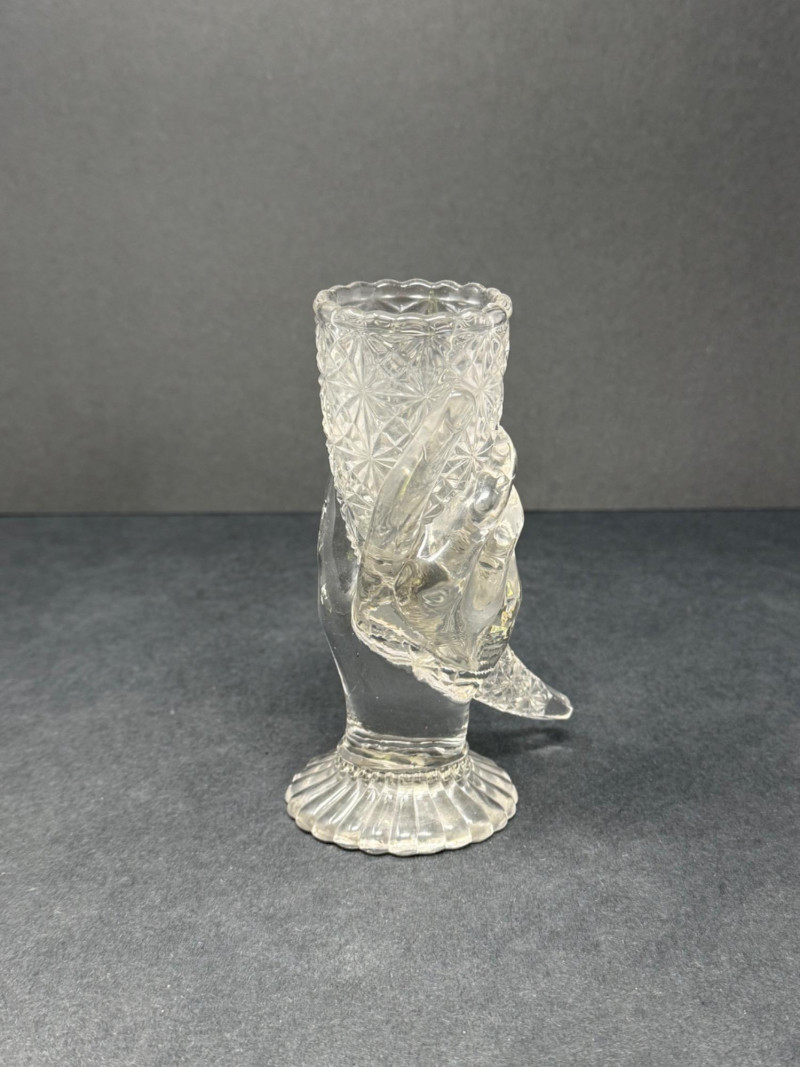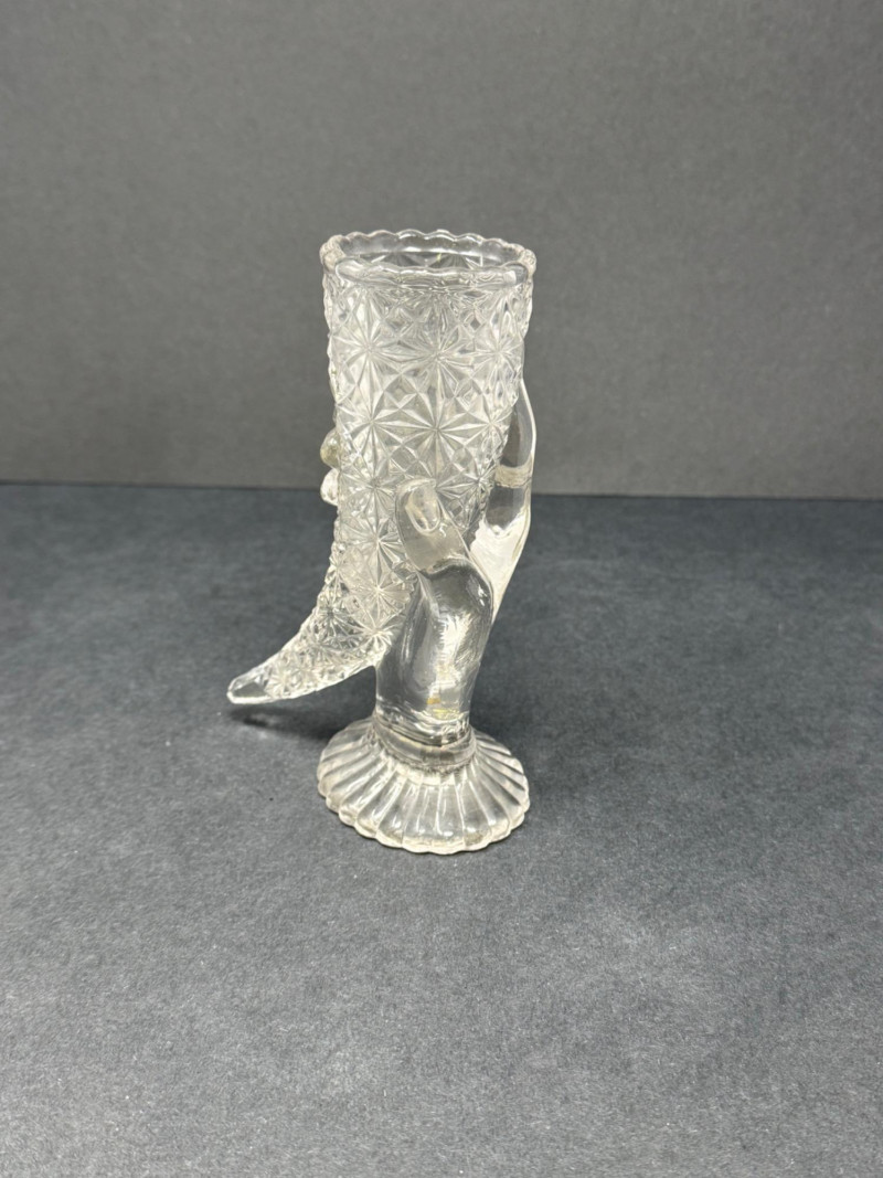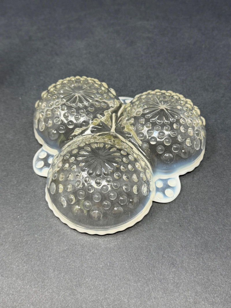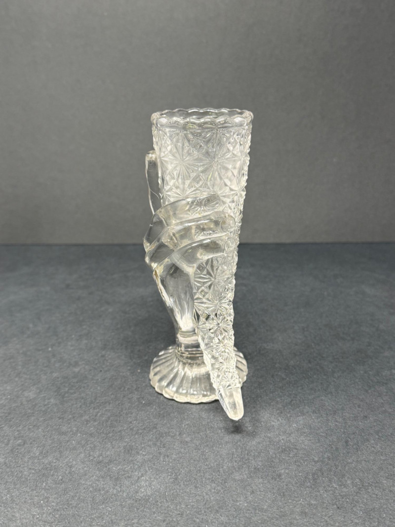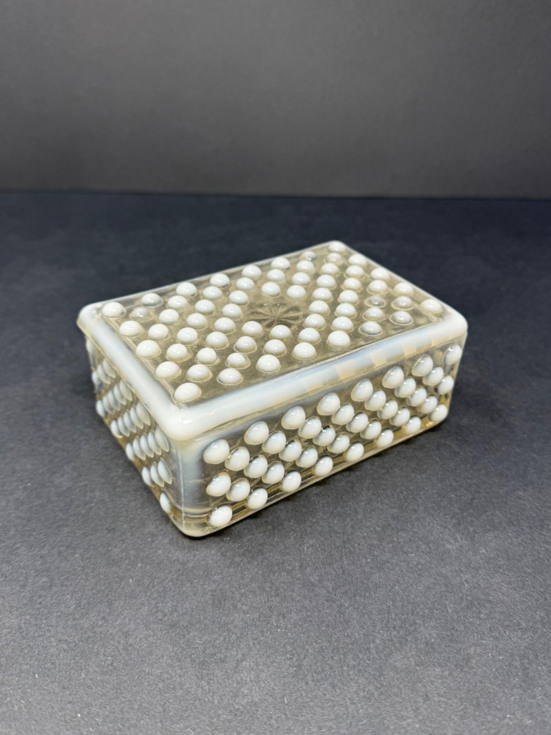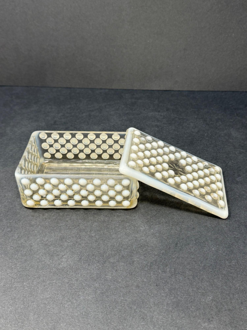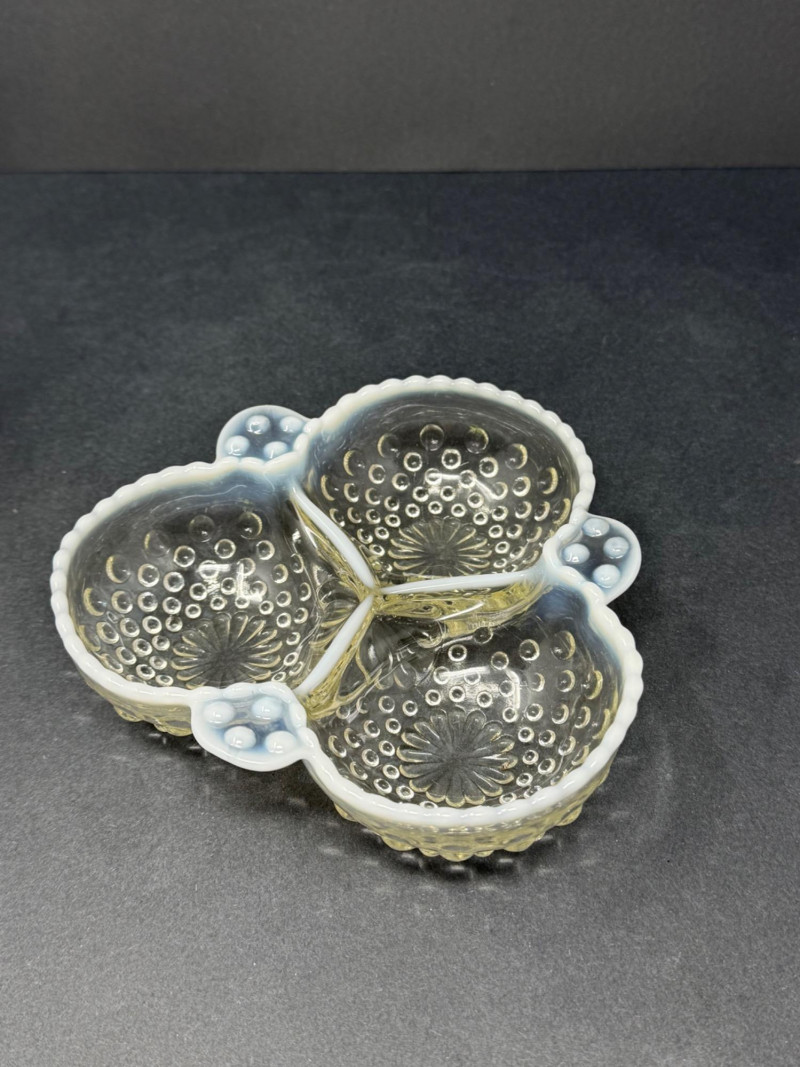 Antique Vintage Fenton Hobnail Opalescent and Pressed Glass Collection A curated collection of five antique and vintage glass pieces featuring hobnail opalescent and clear pressed designs. Based on form and style, these items are likely attributed to notable American makers, primarily Fenton and George Duncan & Sons: 1886 EAPG George Duncan & Sons Cornucopia Hand Vase – Clear pressed glass with flared rim, starburst pattern, and hand-shaped support. Fenton Moonstone Hobnail Trinket/Cigarette Box – Rectangular opalescent box with fitted lid and raised hobnail pattern. Fenton French Opalescent Hobnail Cologne Bottle – Bulbous hobnail form with ribbed neck in white opalescent glass. Fenton Moonstone Hobnail Clover Dish – Three-section divided candy dish with hobnail texture and scalloped edge. Fenton Opalescent Hobnail Ruffled Bowl, c.1940s – Crimped edge bowl with hobnail body and vaseline tint.