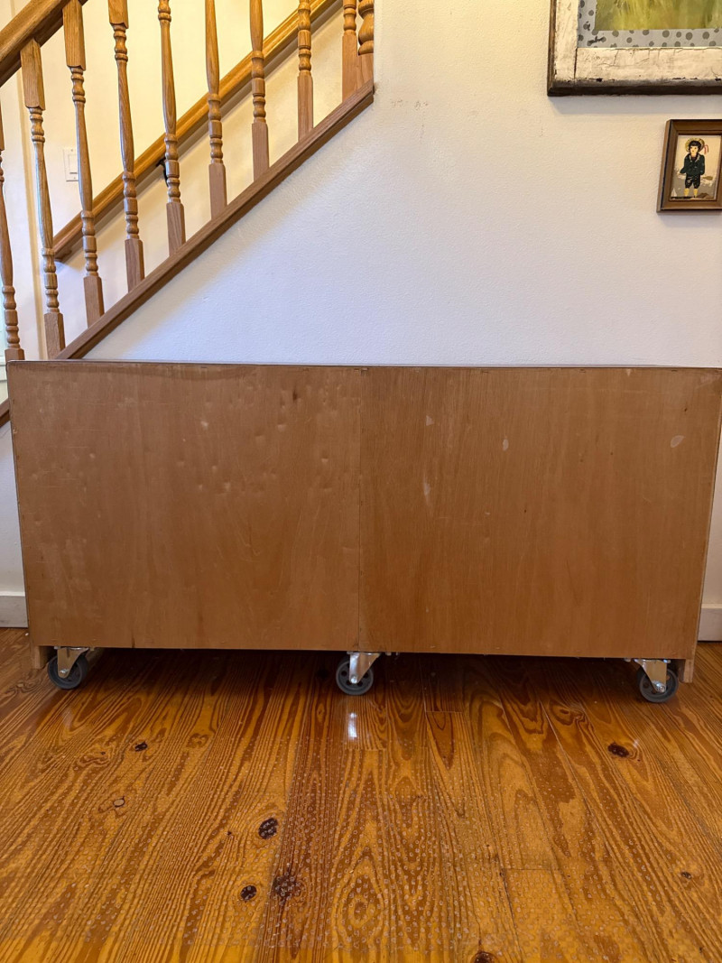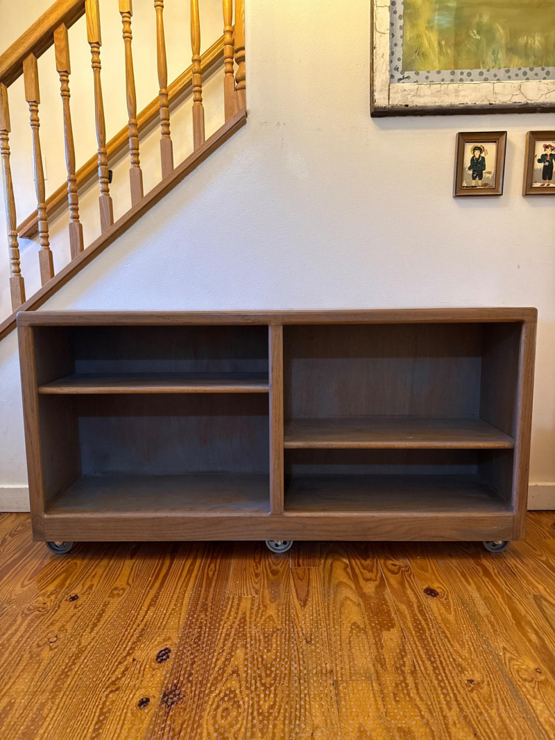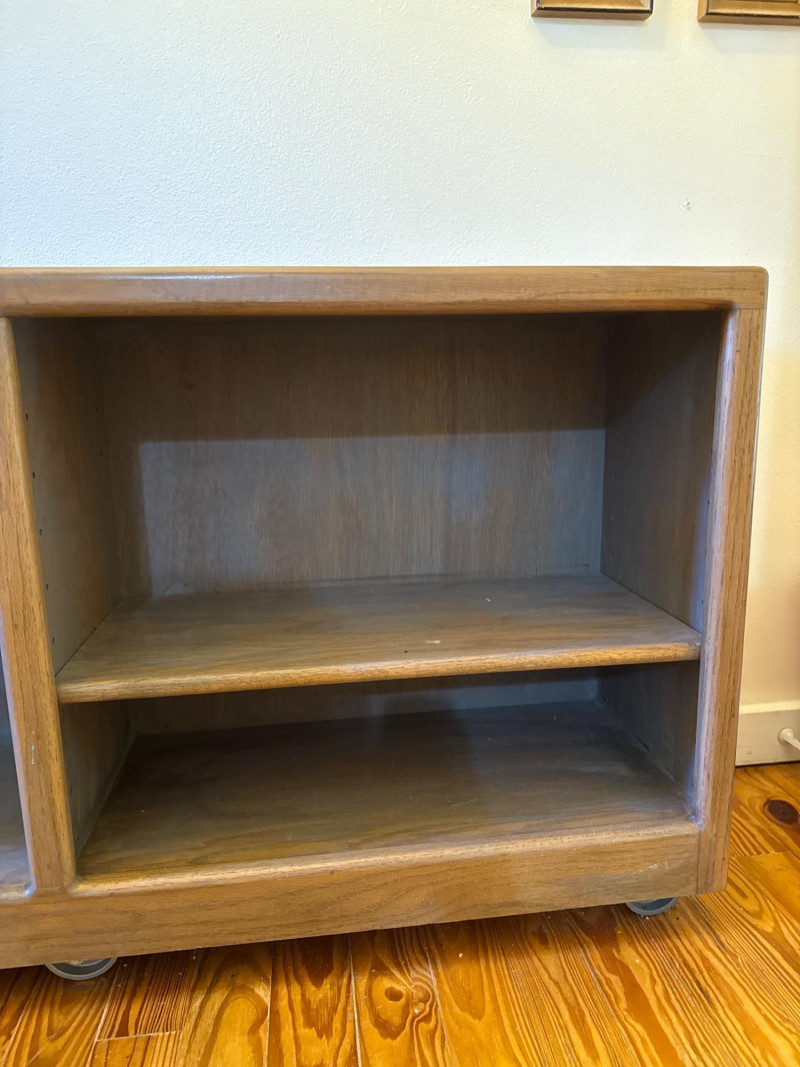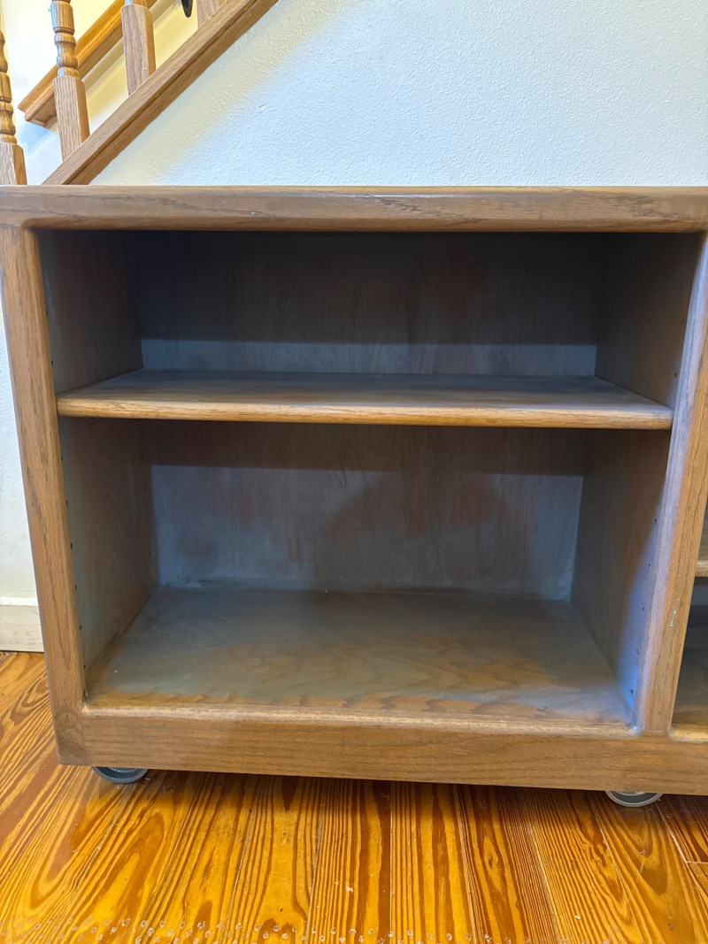 Rolling Wooden Storage Cabinet with Dual Shelves Wooden rolling cabinet with two open compartments, each with an adjustable shelf supported by side-mounted pegs. The unit is set on six caster wheels—four on the corners and two underneath the center—for easy movement and added stability. The back is finished with a flat plywood panel. The wood grain is visible throughout. Note: There are visible water stains and surface damage on the top panel, as shown in the photos.