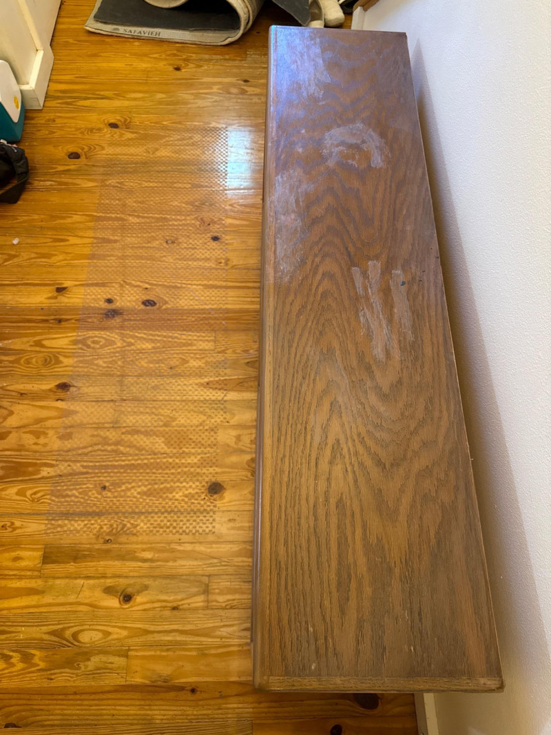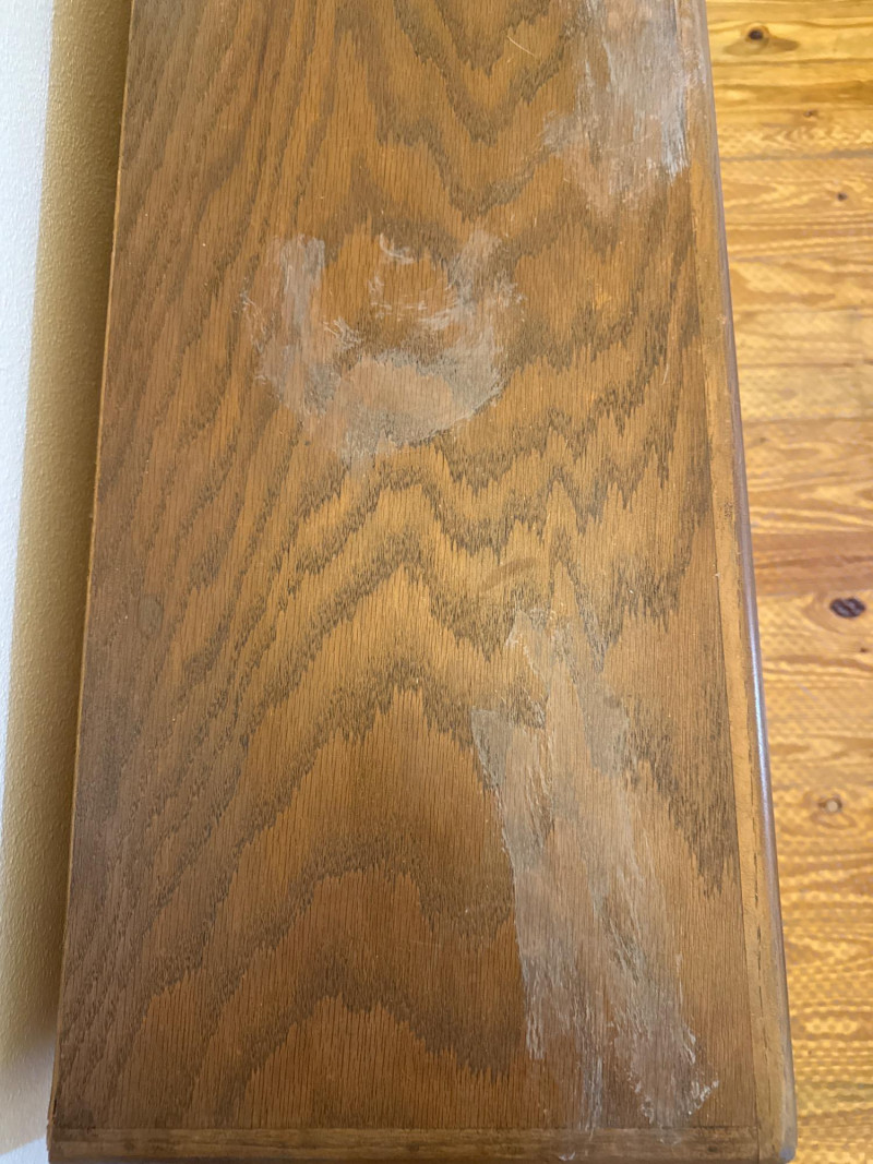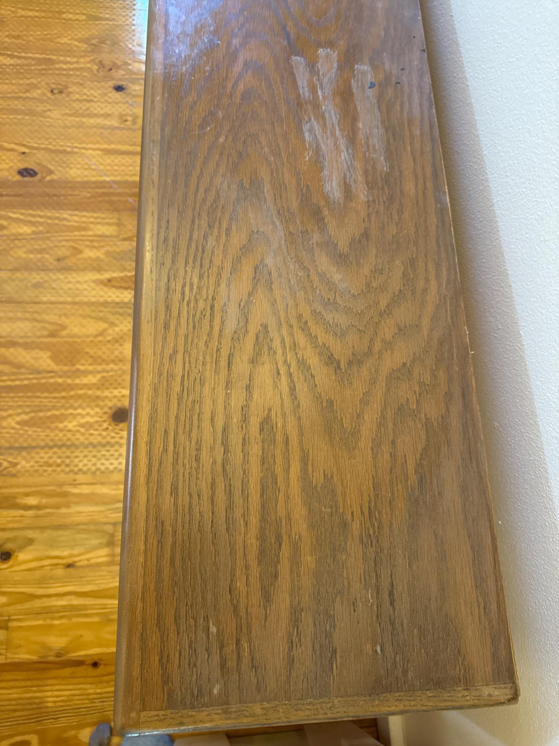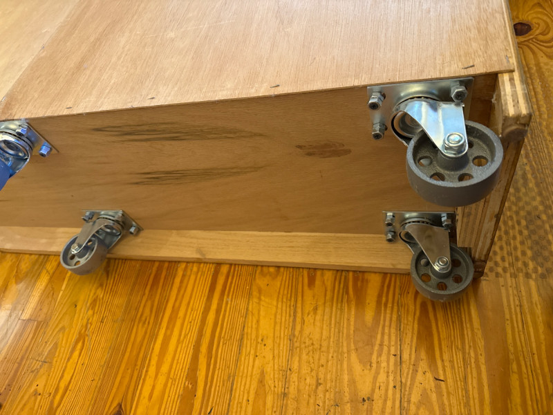 Rolling Wooden Storage Cabinet with Dual Shelves Wooden rolling cabinet with two open compartments, each with an adjustable shelf supported by side-mounted pegs. The unit is set on six caster wheels—four on the corners and two underneath the center—for easy movement and added stability. The back is finished with a flat plywood panel. The wood grain is visible throughout. Note: There are visible water stains and surface damage on the top panel, as shown in the photos.