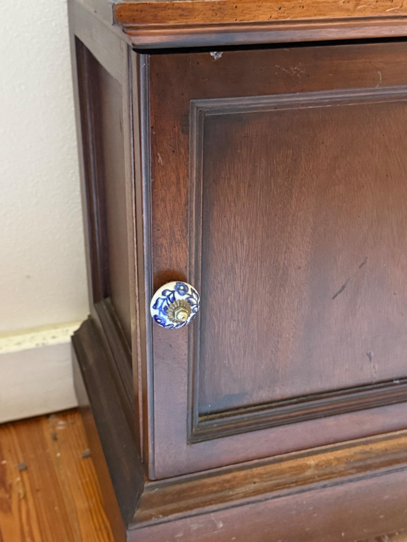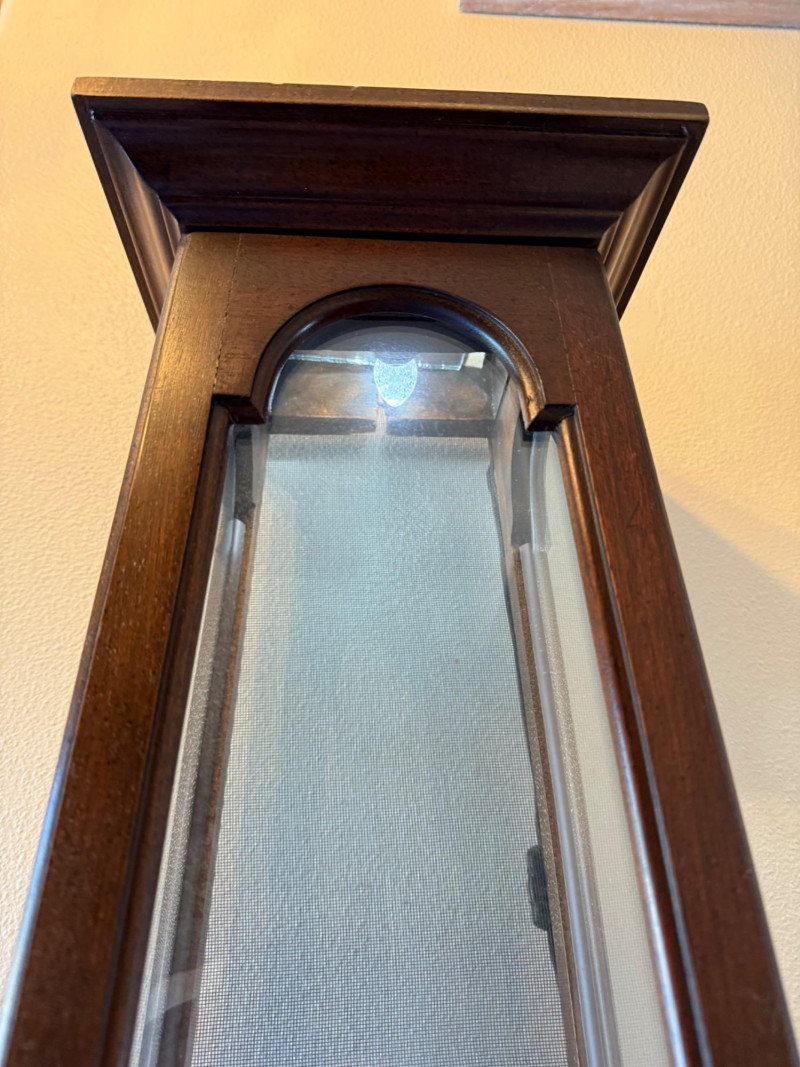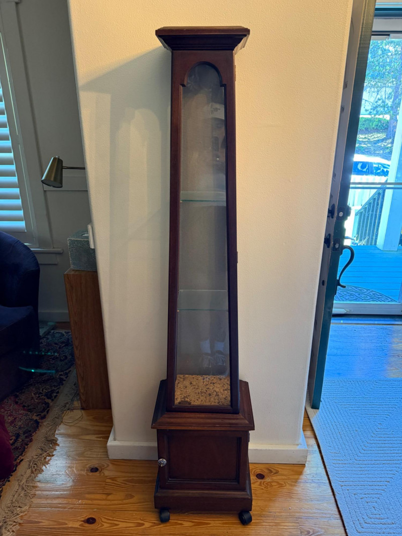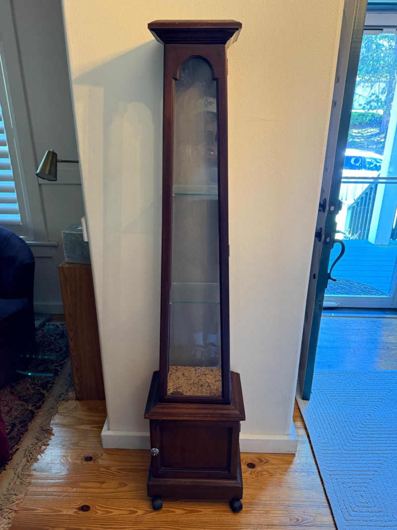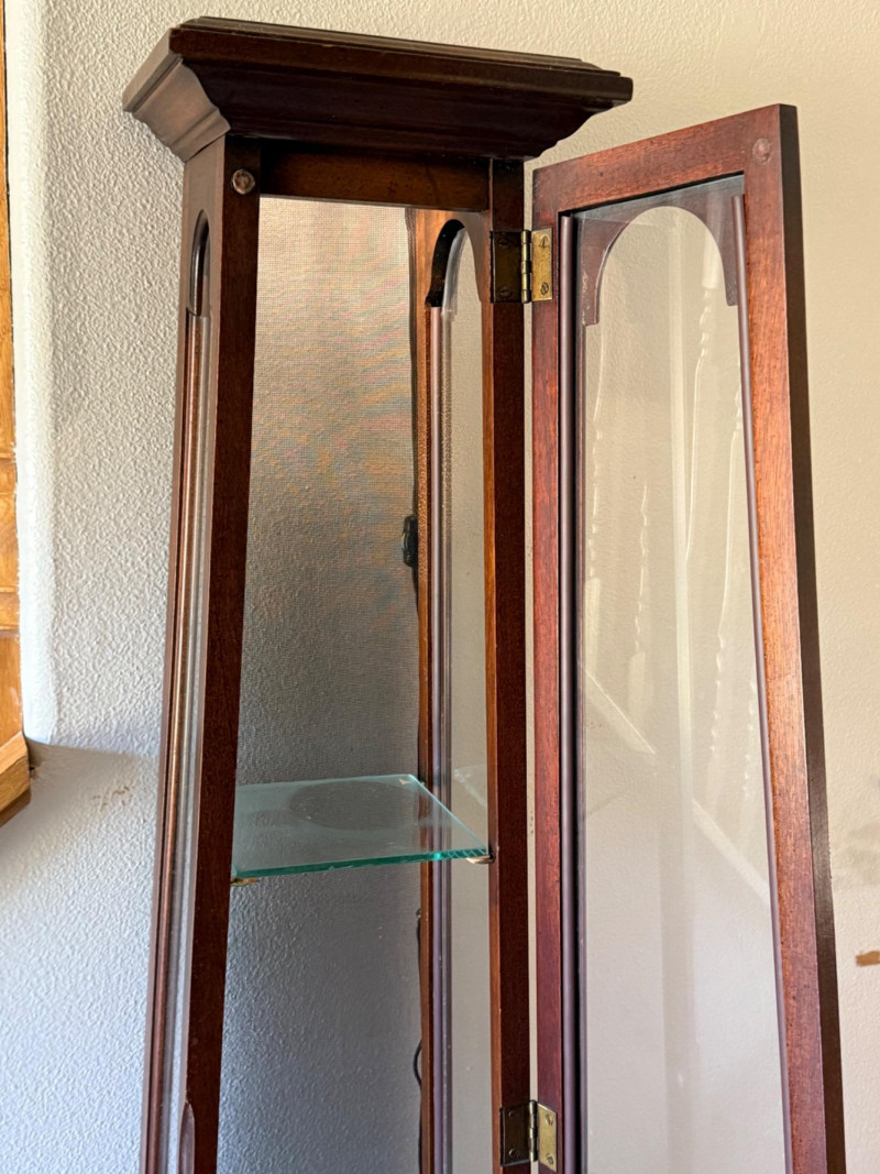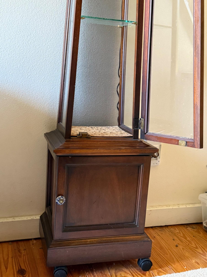 Vintage Tall Wooden Display Cabinet with Lighting and Storage Tall wood-framed display cabinet with a single arched glass door and tapered silhouette. The upper display area includes one glass shelf and a mirrored back panel. A light fixture is mounted at the top to illuminate the interior. The base of the display section is lined with a textured fabric surface. Below, a hinged cabinet door opens to a concealed storage compartment. The door is fitted with a round ceramic knob. The unit rests on four caster wheels for mobility. Dimensions: