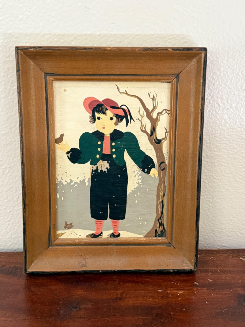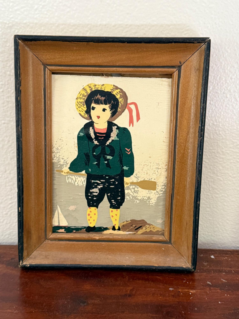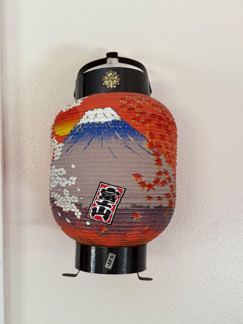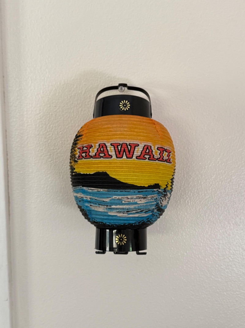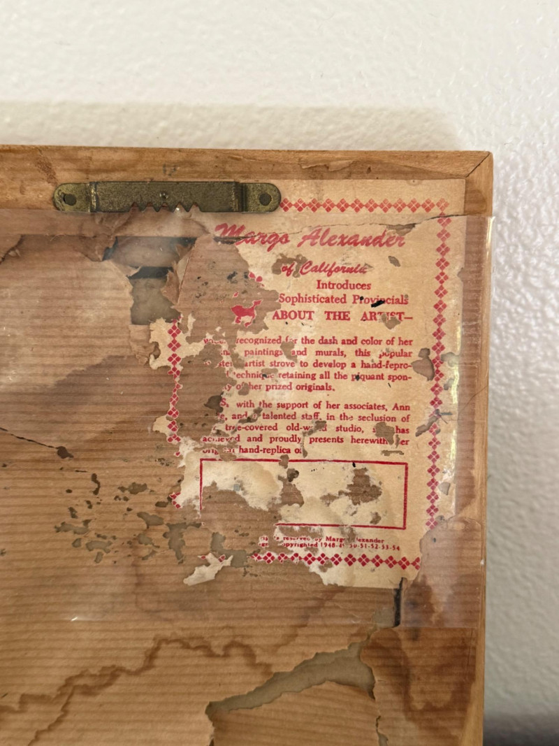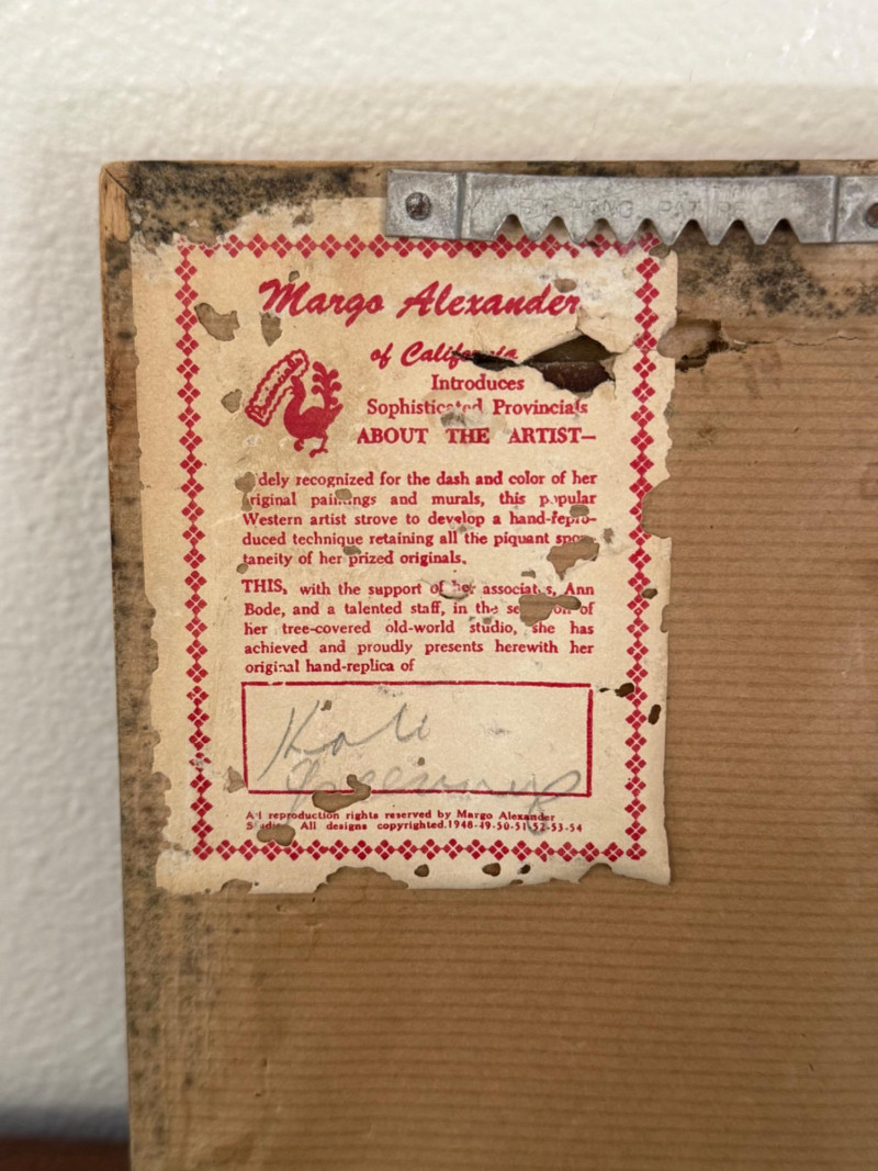 Vintage Japanese Lanterns & Vintage Signed Margo Alexander Frames Assortment includes six vintage Japanese paper lanterns in various sizes, featuring traditional kanji characters, family crests, and designs such as Mt. Fuji and "Hawaii." Constructed with paper, bamboo, and painted wood. Visible wear on some pieces consistent with age. Also includes two framed hand-replica prints by California artist Margo Alexander, known for her mid-20th century “Sophisticated Provincials” series. Alexander developed a technique to reproduce her original paintings while preserving their character and charm. Labels on the reverse note the works were created in collaboration with her studio staff between 1948 and 1954. Both frames are signed. Frame Dimensions: 5.5” W x 7” H