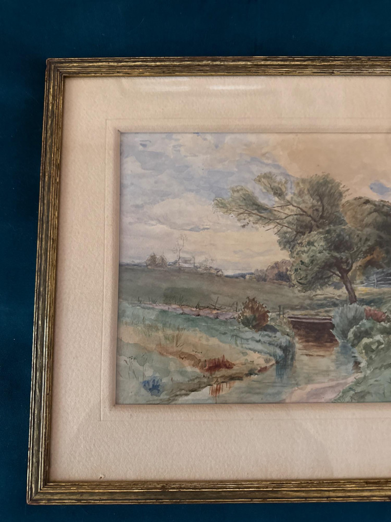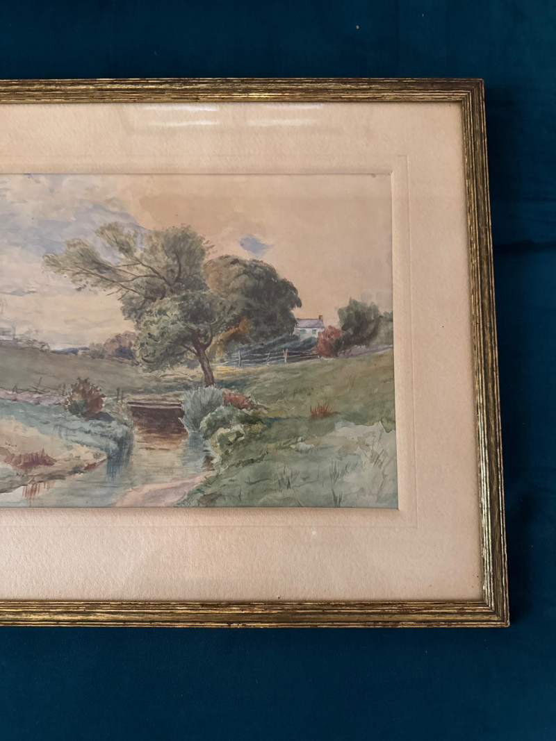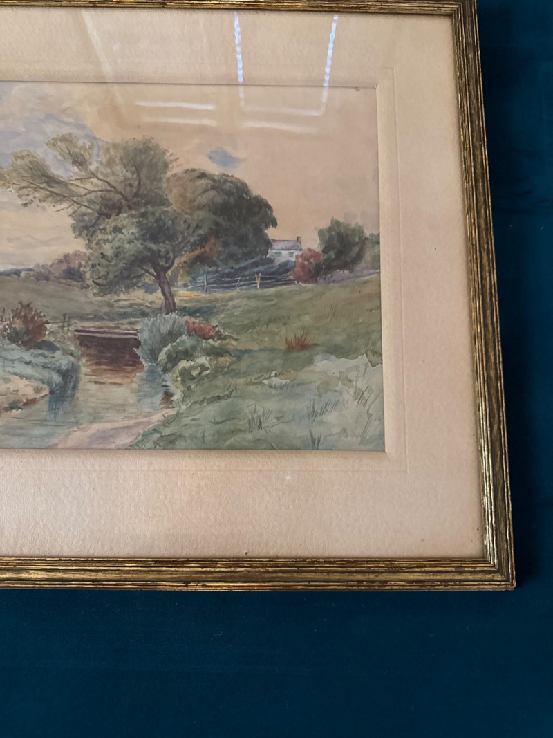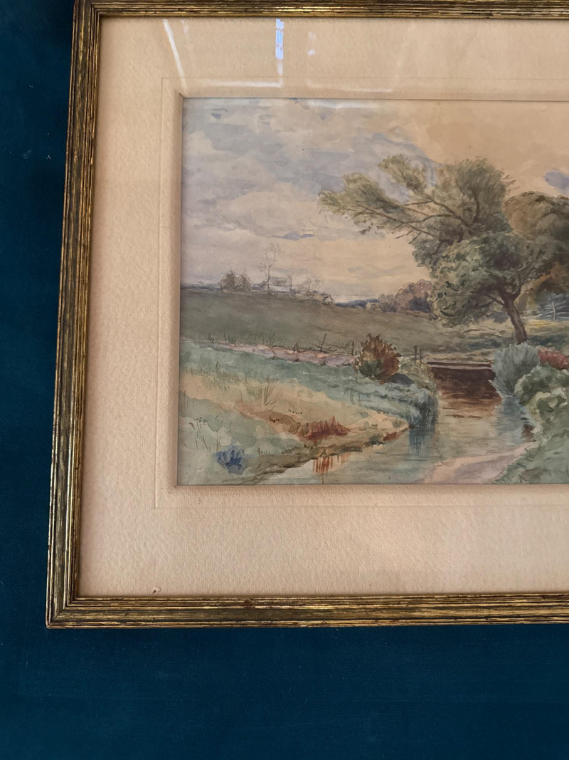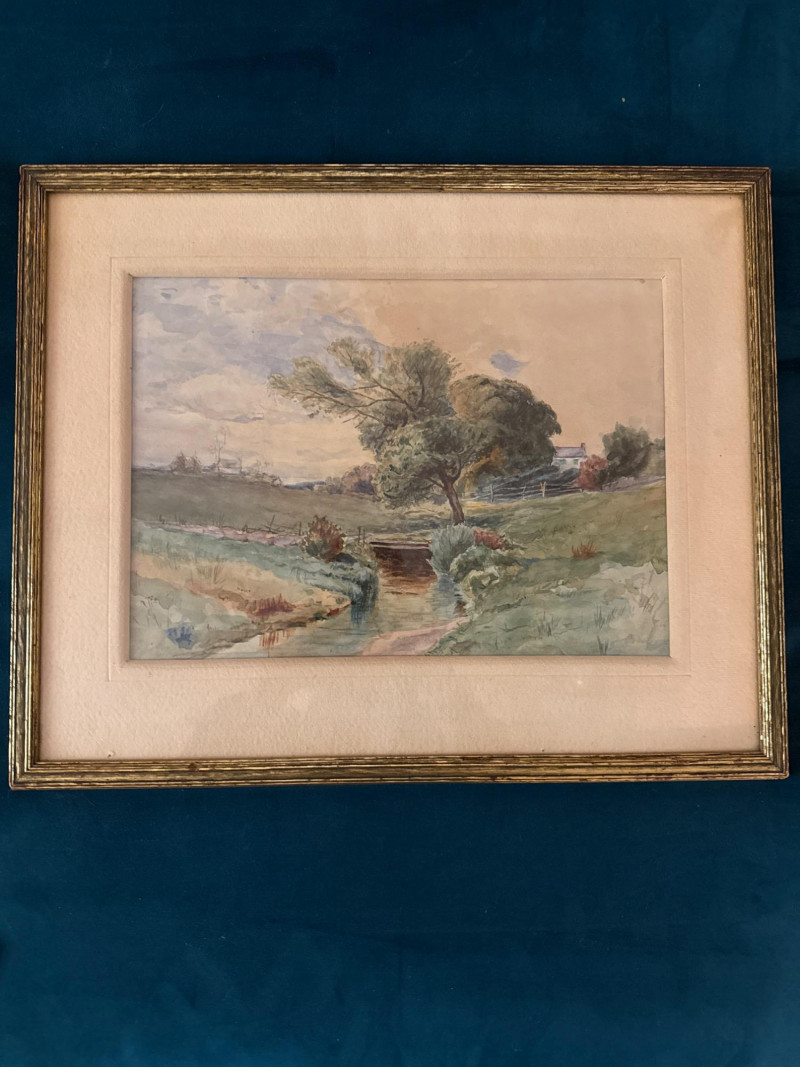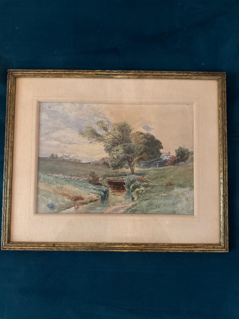 Vintage Framed Watercolor Landscape Vintage watercolor painting featuring a pastoral landscape with a winding stream, a central tree, and distant structures on the horizon. The scene is housed in a gold-toned wooden frame with a double mat. The artwork is unsigned. Condition: Minor wear on the back of the frame.