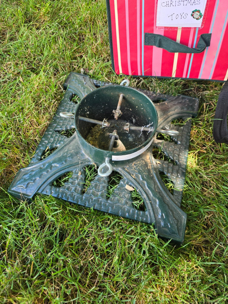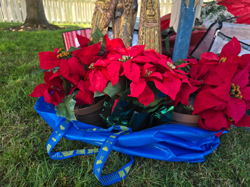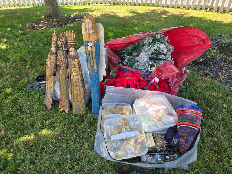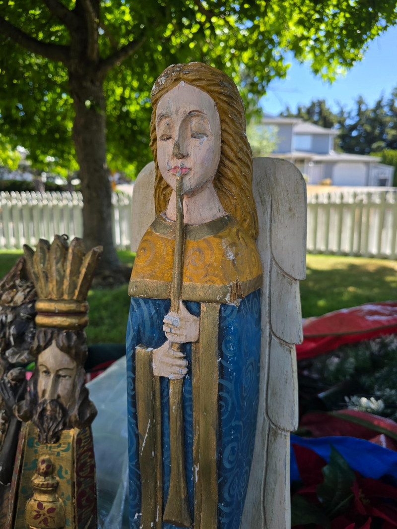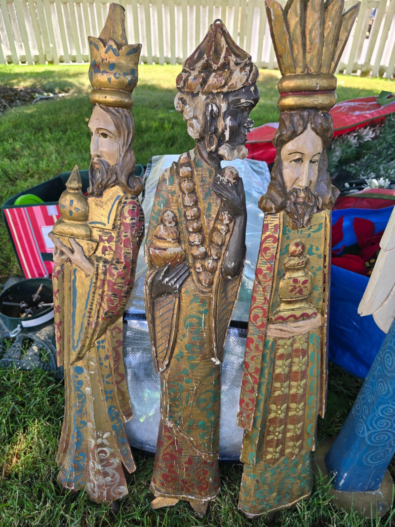 Christmas Lot #3 – Carved Angel, Wise Men, Ornaments & Tree Stand Antique hand-carved and painted angel and three wise men statues. Snow-frosted Christmas tree, various ornaments and lights. Heavy-duty vintage tree stand made of cast iron and four potted artificial poinsettias. Includes: Hand-carved and painted angel statue Hand-carved and painted statues of the three wise men Snow-frosted artificial Christmas tree Assorted ornaments and holiday lights Heavy-duty vintage cast iron tree stand Four potted artificial poinsettia plants