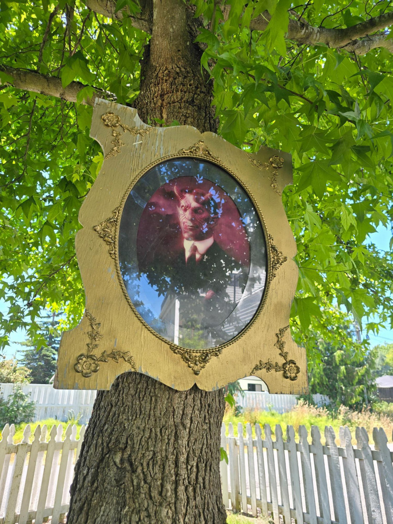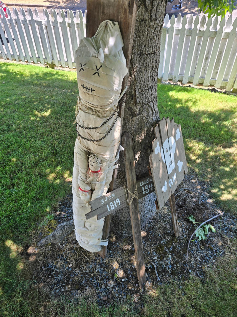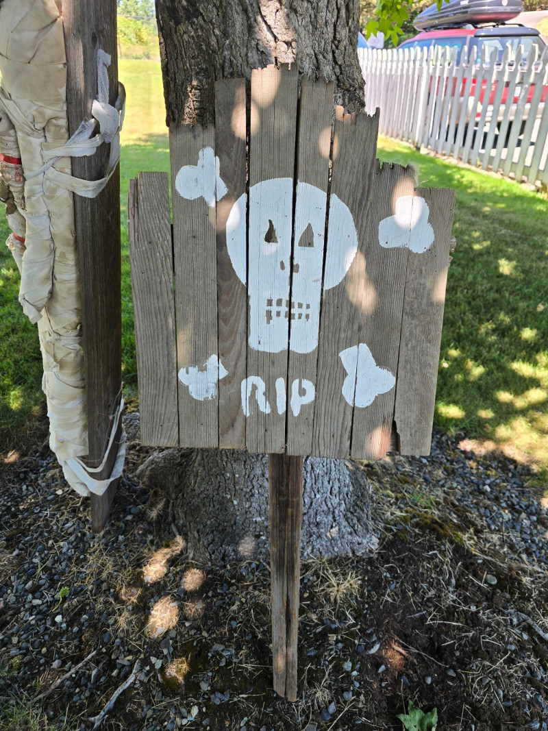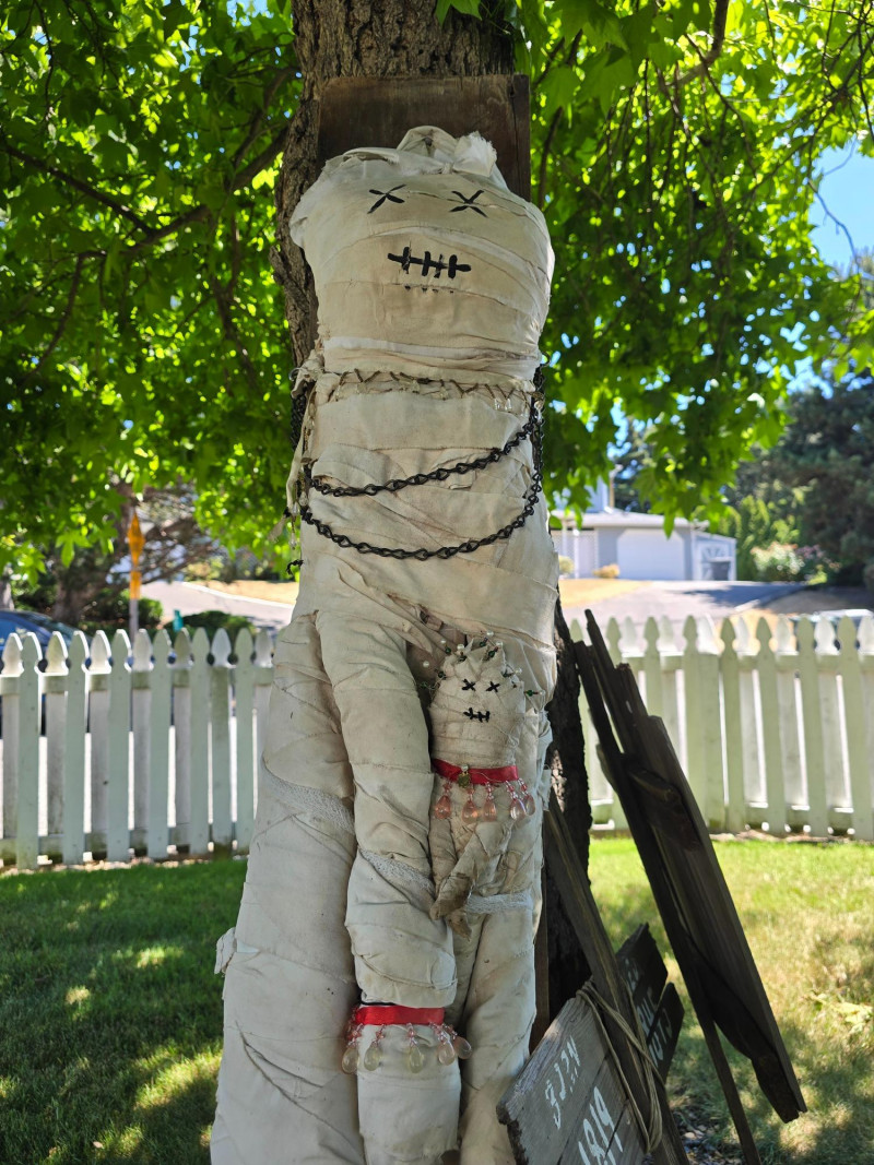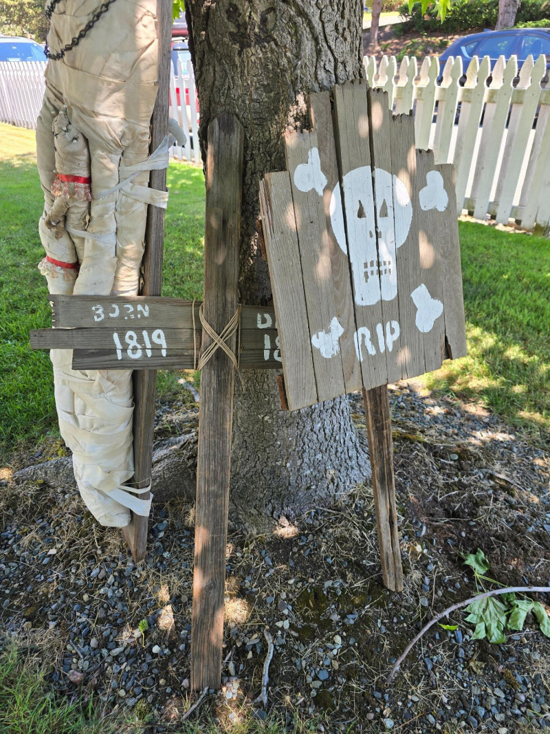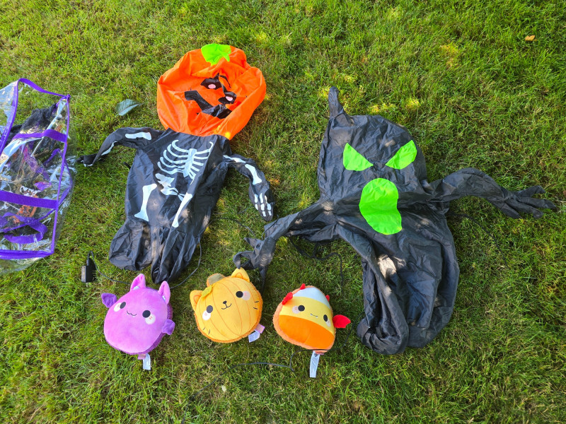 Halloween Lot #1 – Mummy Yard Decor, Grave Markers, Blow-Ups & More Spooky and cute collection of Halloween decorations. Includes: Mother and child mummy figures, homemade-style with gauze and mounted on 1/8" plank Wooden grave markers with hand-painted details including “RIP” and crossbones Holographic portrait in antiqued frame, transforming from gentleman to demon Assorted electric motorized and inflatable Halloween yard figures Halloween-themed plush pillows shaped like animals in costume