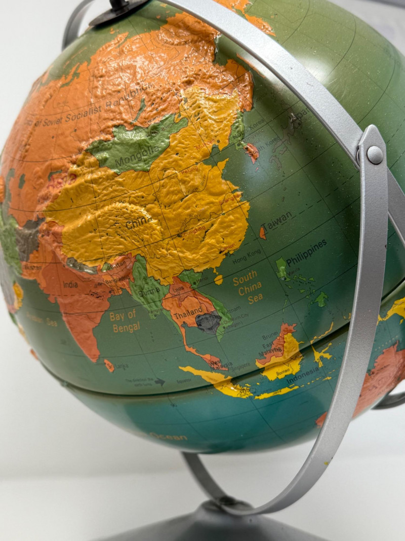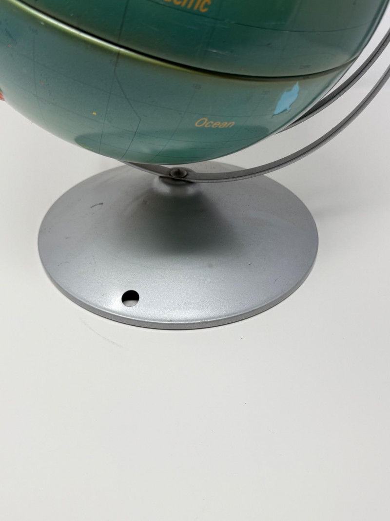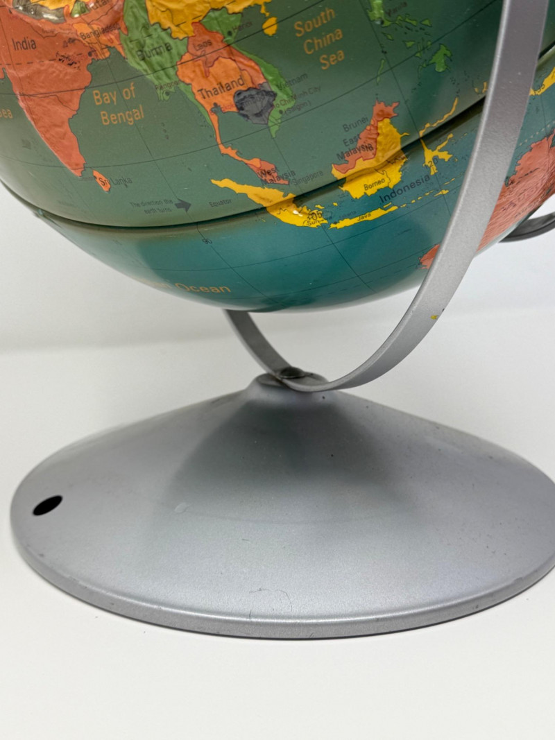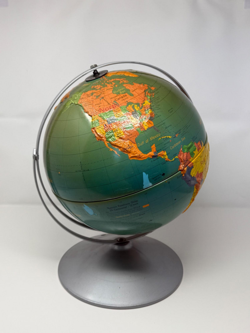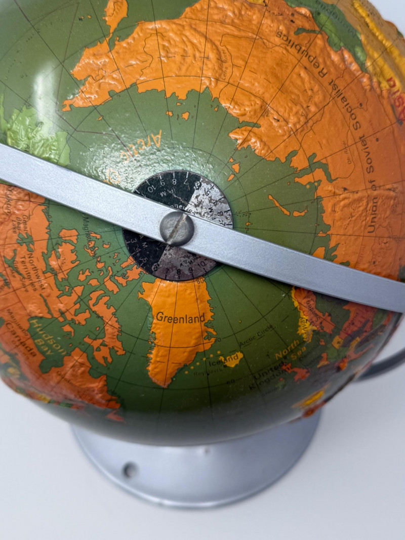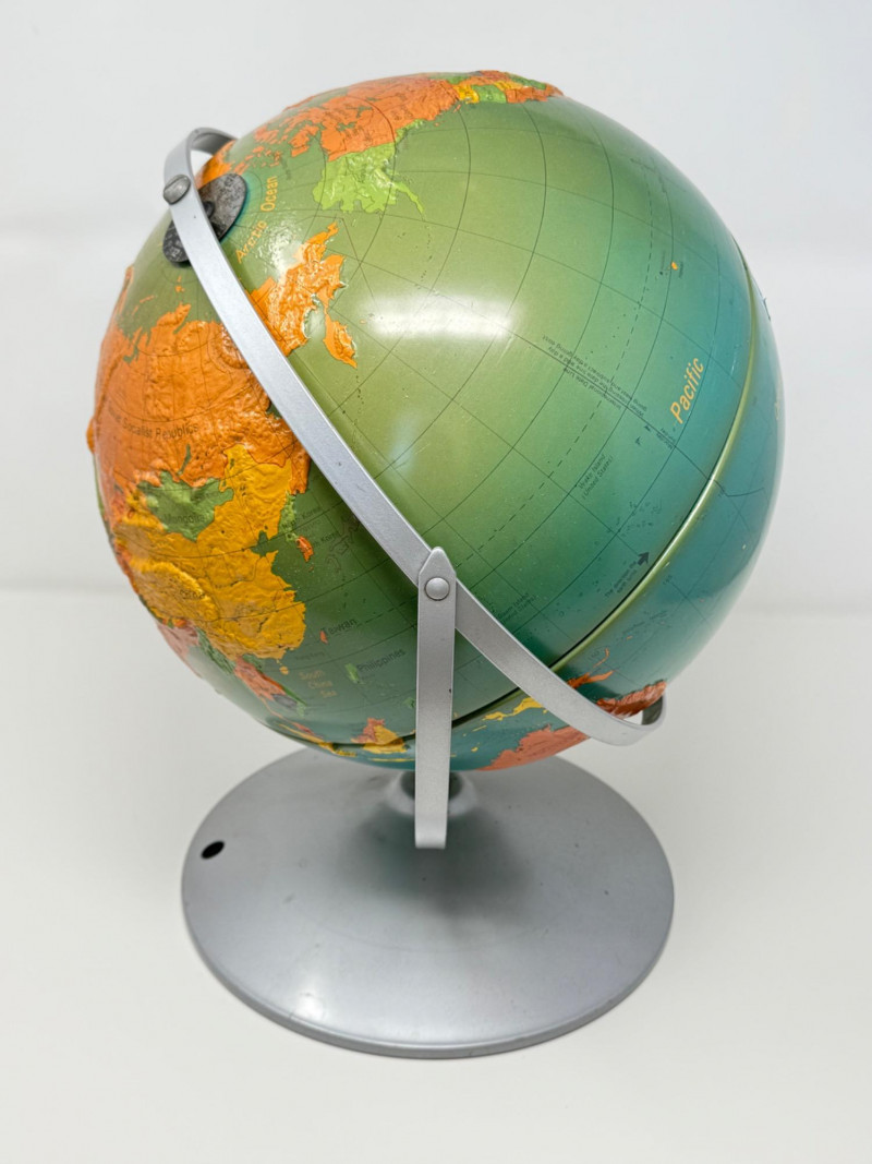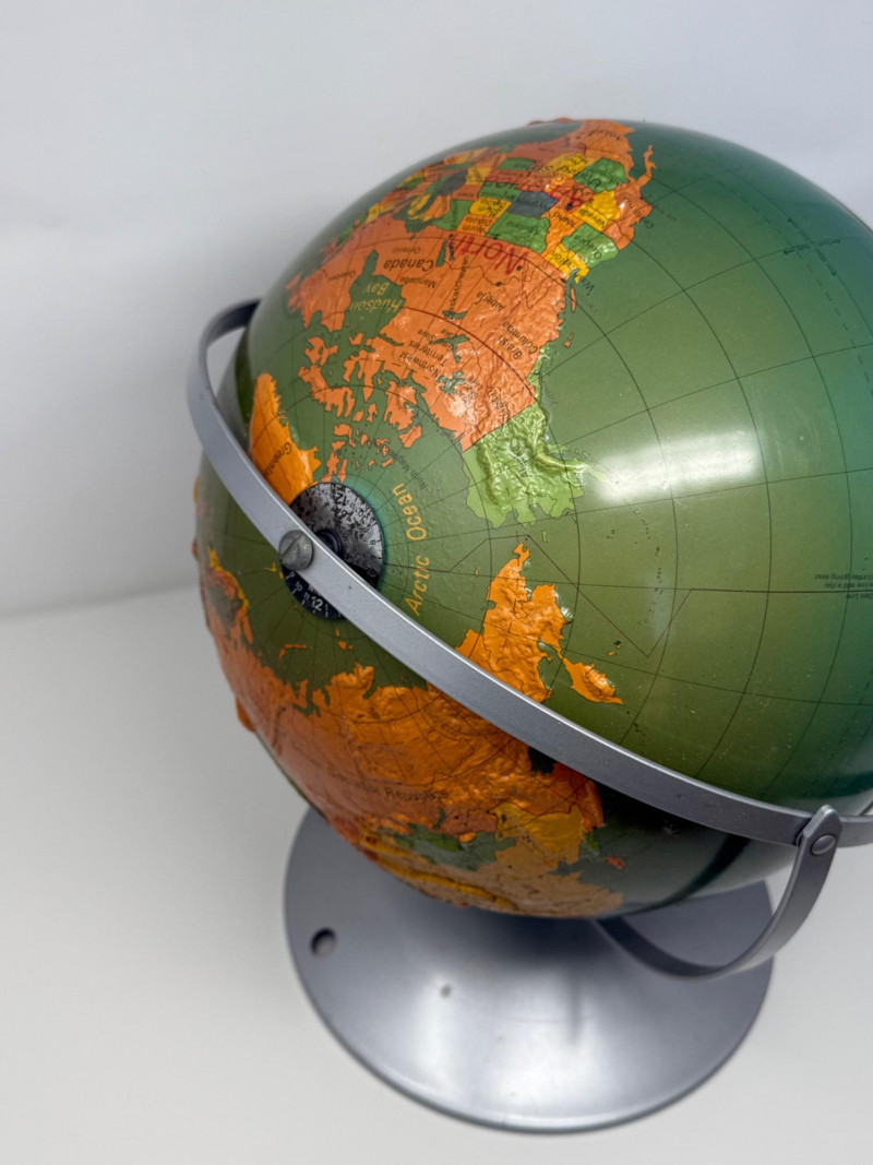 Vintage 1960s Nystrom Readiness Globe – 21" Tall Freestanding 1960s Nystrom Readiness Globe with raised contoured relief and color-coded topography. The globe measures 16 inches in diameter and features a fixed metal meridian and a sturdy silver-tone metal base. Some areas of the base show visible rust and wear consistent with age. All labels and countries are intact and legible. Dimensions: