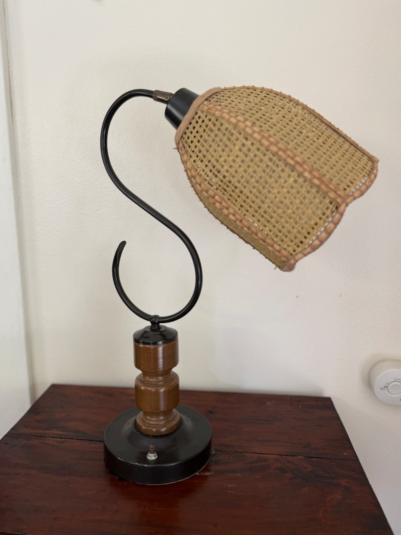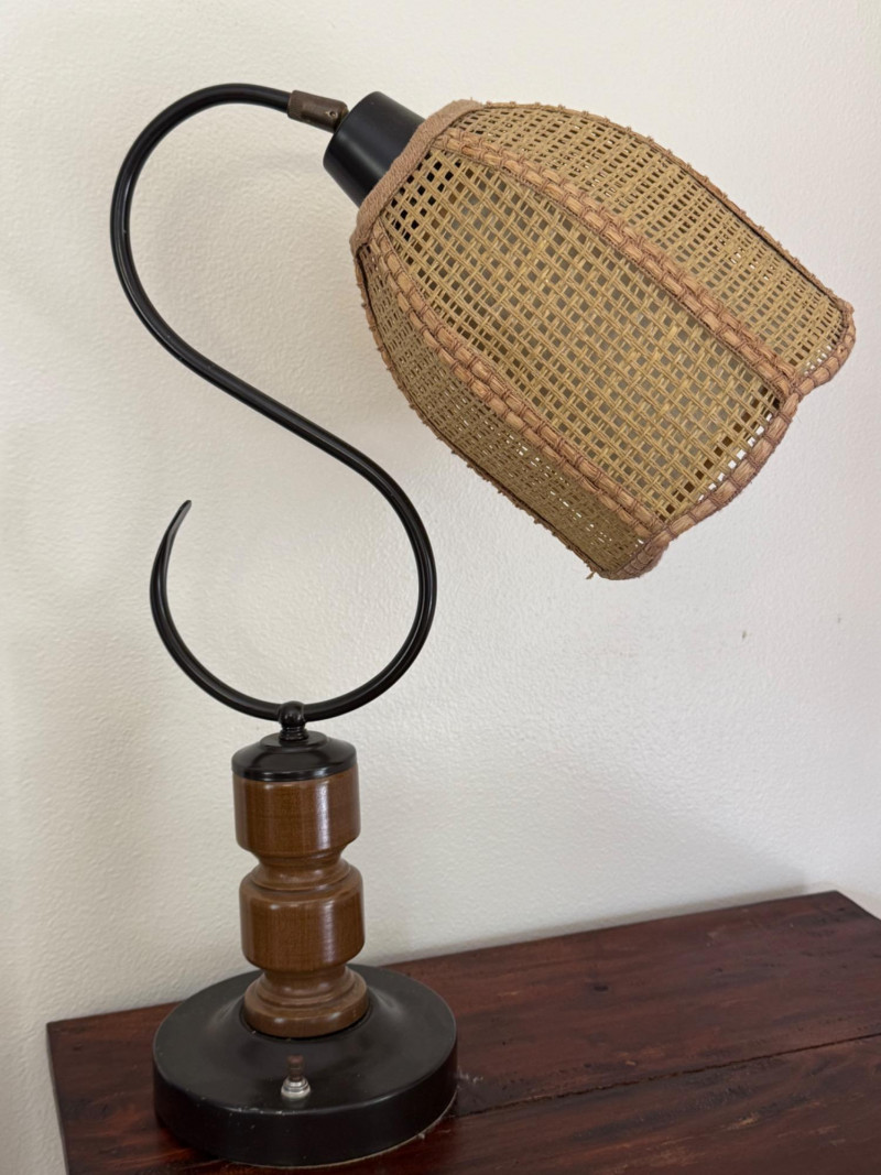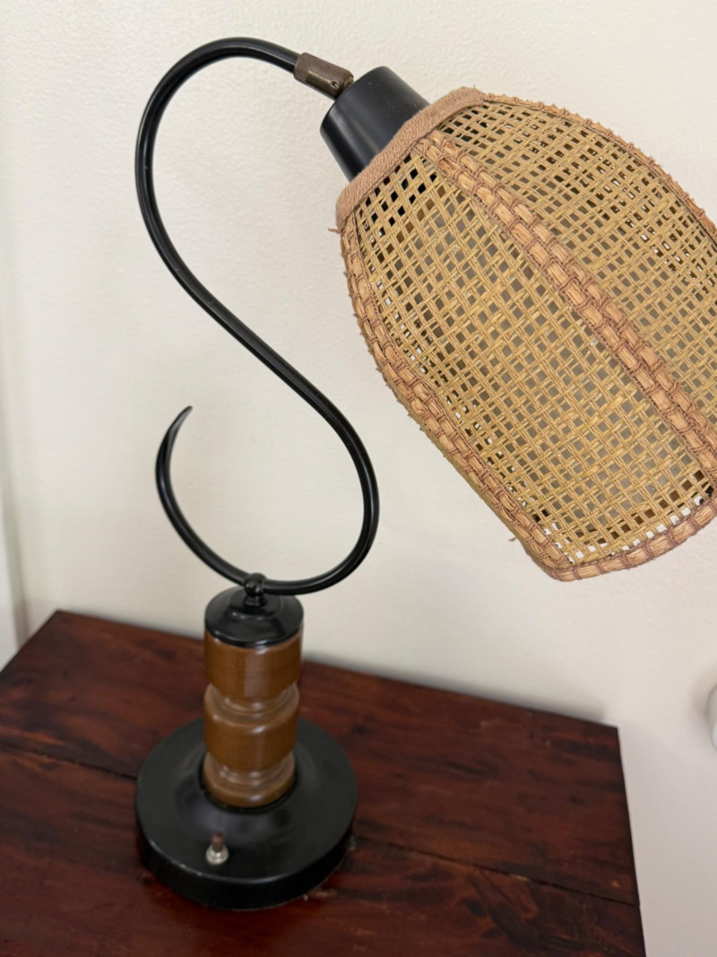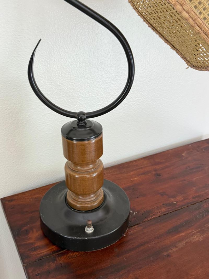 Vintage Wicker, Wood and Metal Table Lamp Table lamp featuring a curved black metal stem, turned wood center, and woven wicker shade. The lamp sits on a round black base with a built-in switch. Wicker shade is open-ended and lined for diffusion. Bulb socket and wiring appear to be modern. Dimensions: