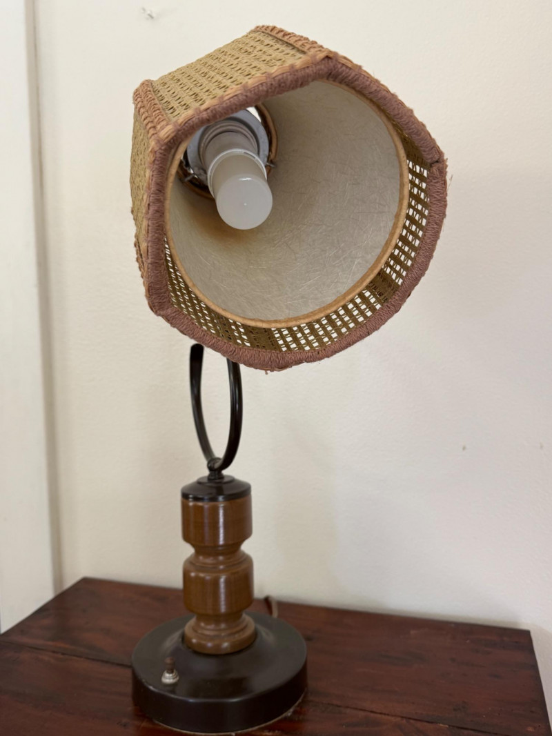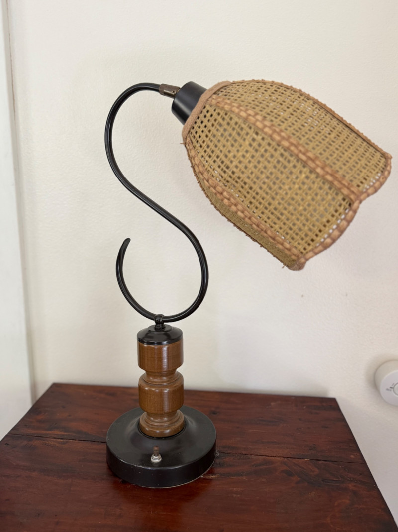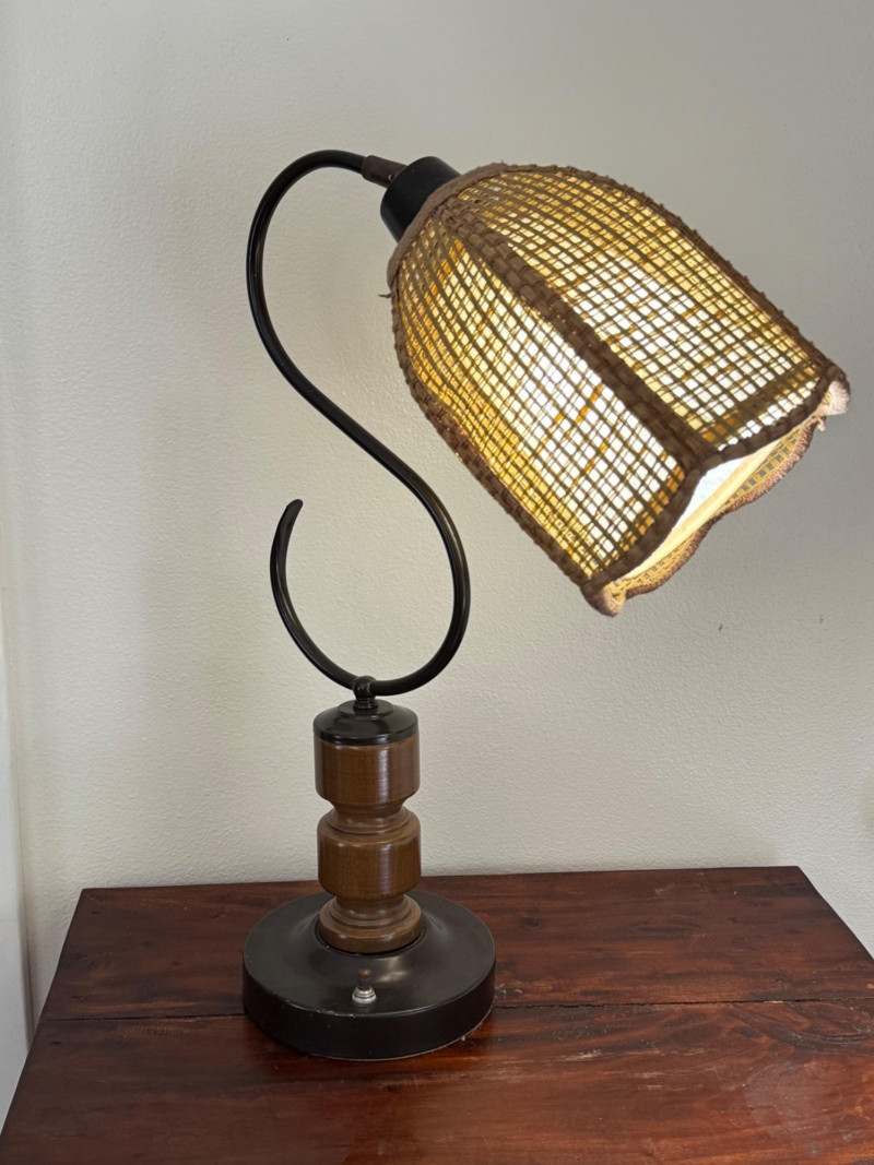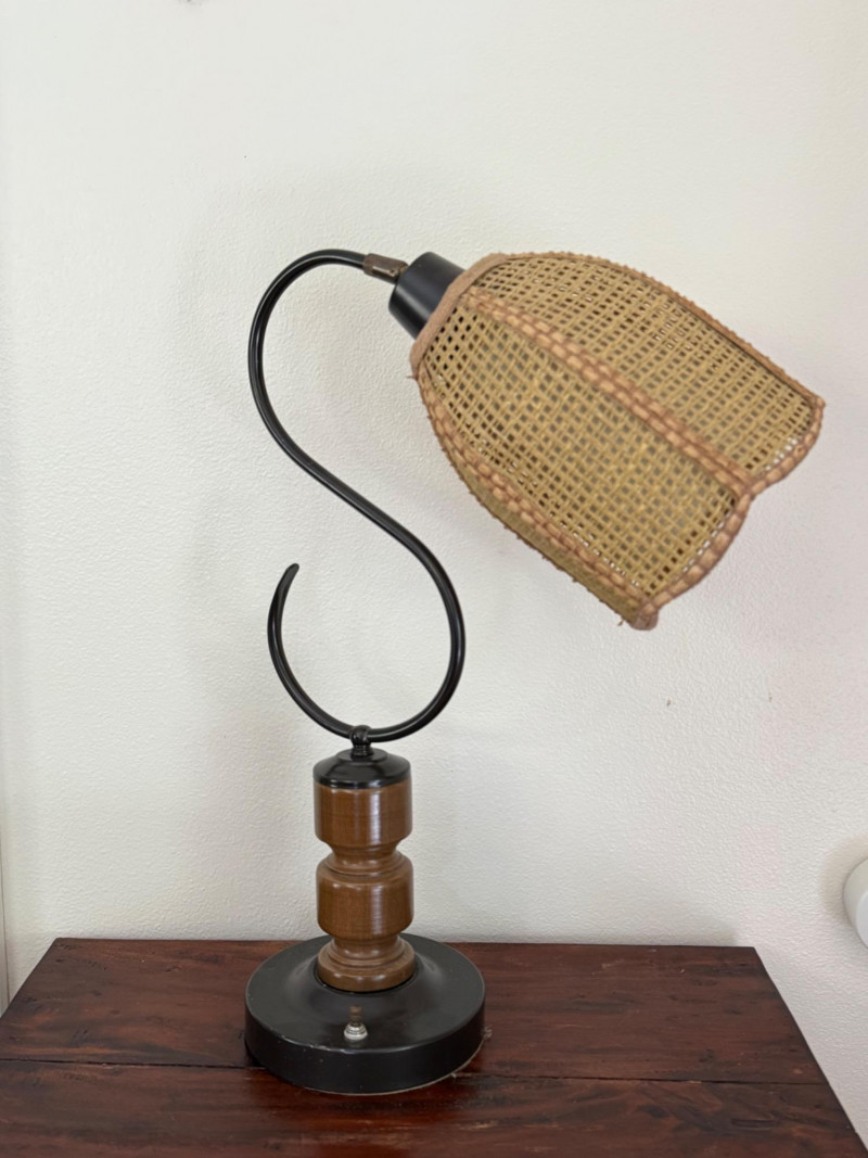 Vintage Wicker, Wood and Metal Table Lamp Table lamp featuring a curved black metal stem, turned wood center, and woven wicker shade. The lamp sits on a round black base with a built-in switch. Wicker shade is open-ended and lined for diffusion. Bulb socket and wiring appear to be modern. Dimensions: