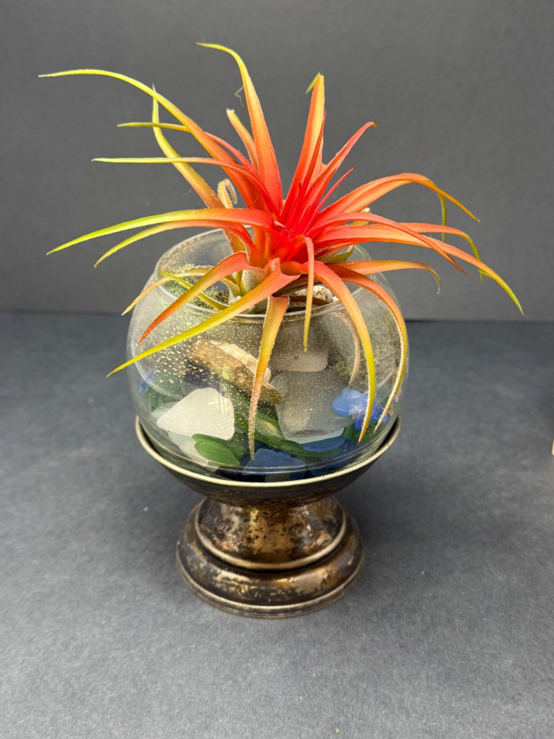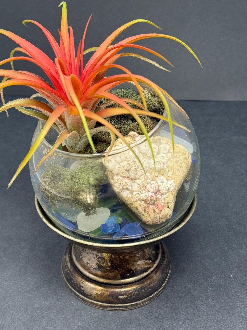 Planetarium Decor – Faux Succulents, Shells, Stones & Paperweights A curated tabletop decor set featuring: Faux succulent terrarium in a glass bowl with real coral stone, blue glass chips, and moss, set on a bronze-tone pedestal Mini faux air plant with real seashell on a gray and white marble geometric stone base Glass flower-shaped paperweight or candle holder with 7 rounded depressions and central dome Textured natural rock specimen displayed on a wooden block