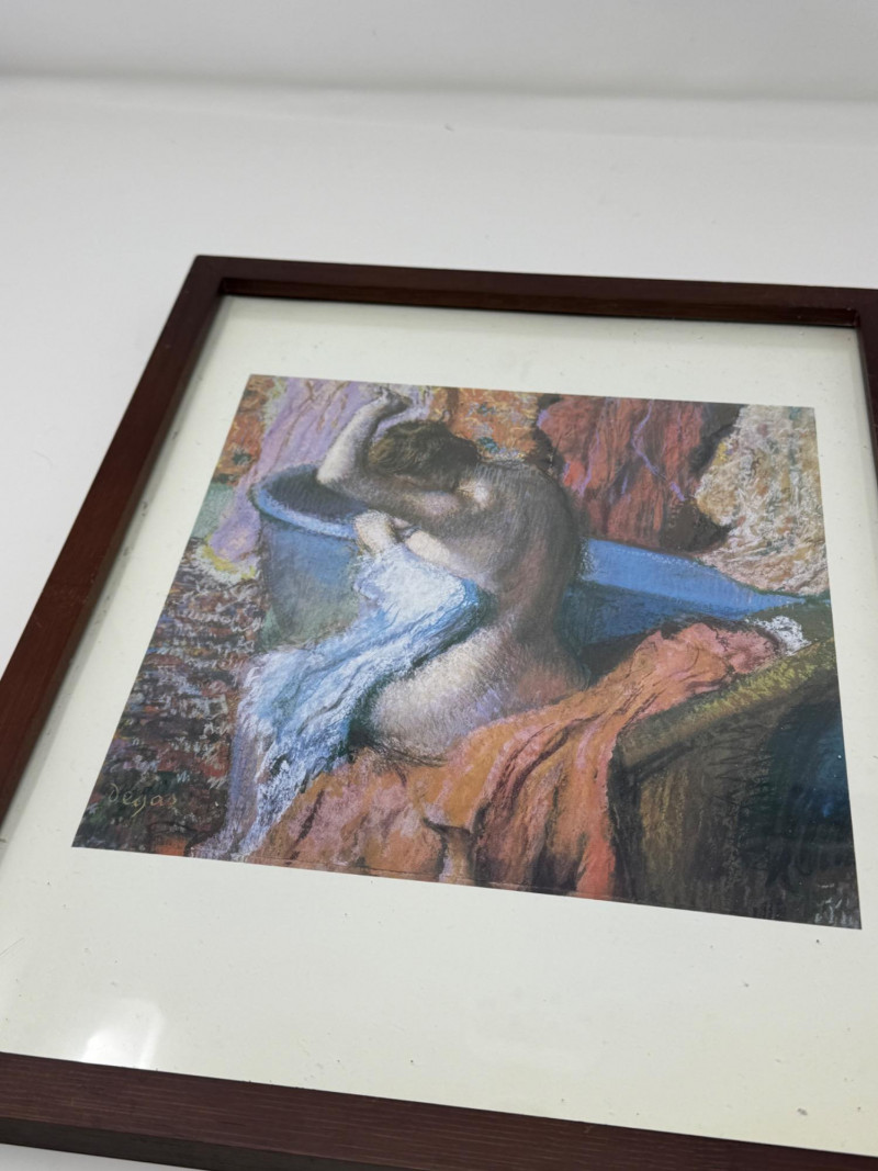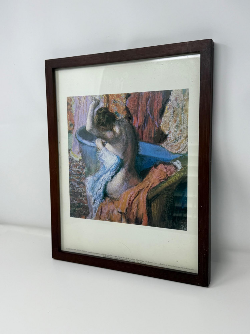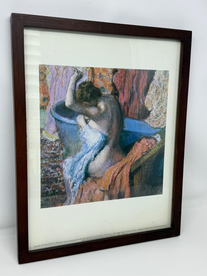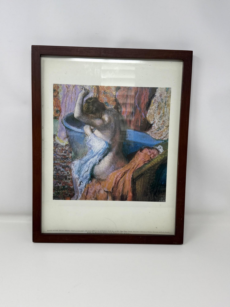 Edgar Degas “Seated Bather, 1899” Framed Print Framed reproduction print of Edgar Degas’ pastel work titled Seated Bather, originally created in 1899. The image features a woman seated in a bathtub, rendered in rich textures and layered colors typical of Degas' late work. The print is displayed under glass in a simple wooden frame with backing and hanging hardware. Dimensions: