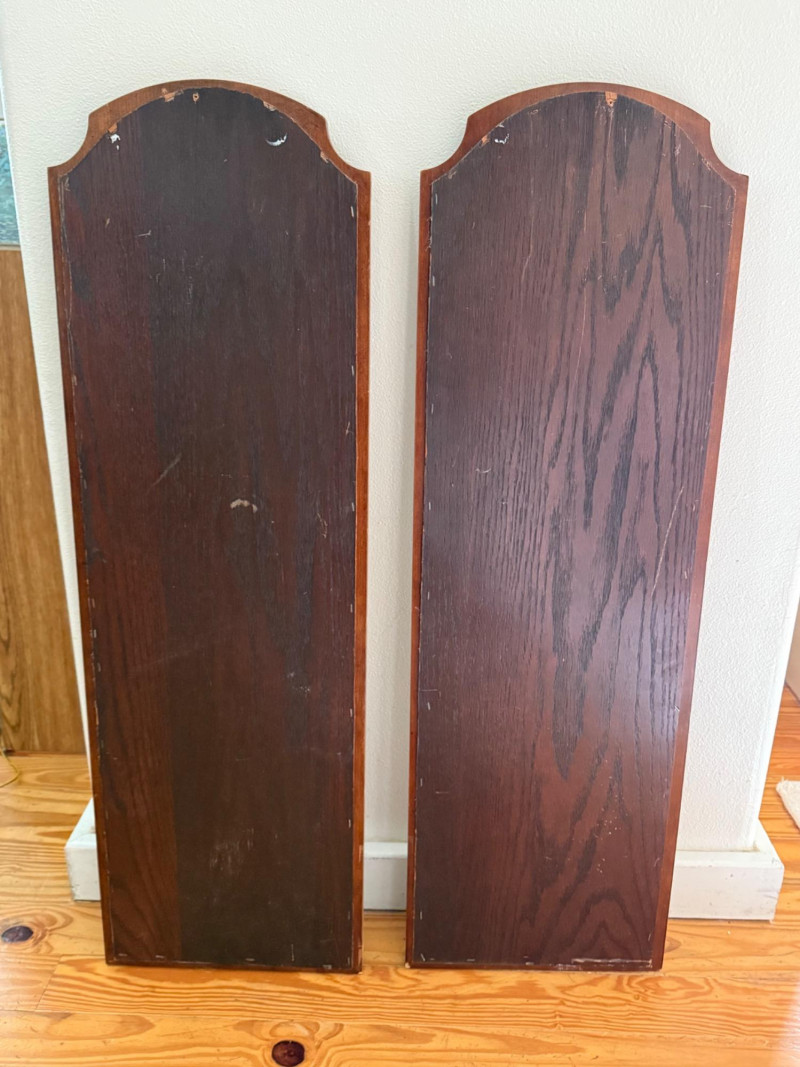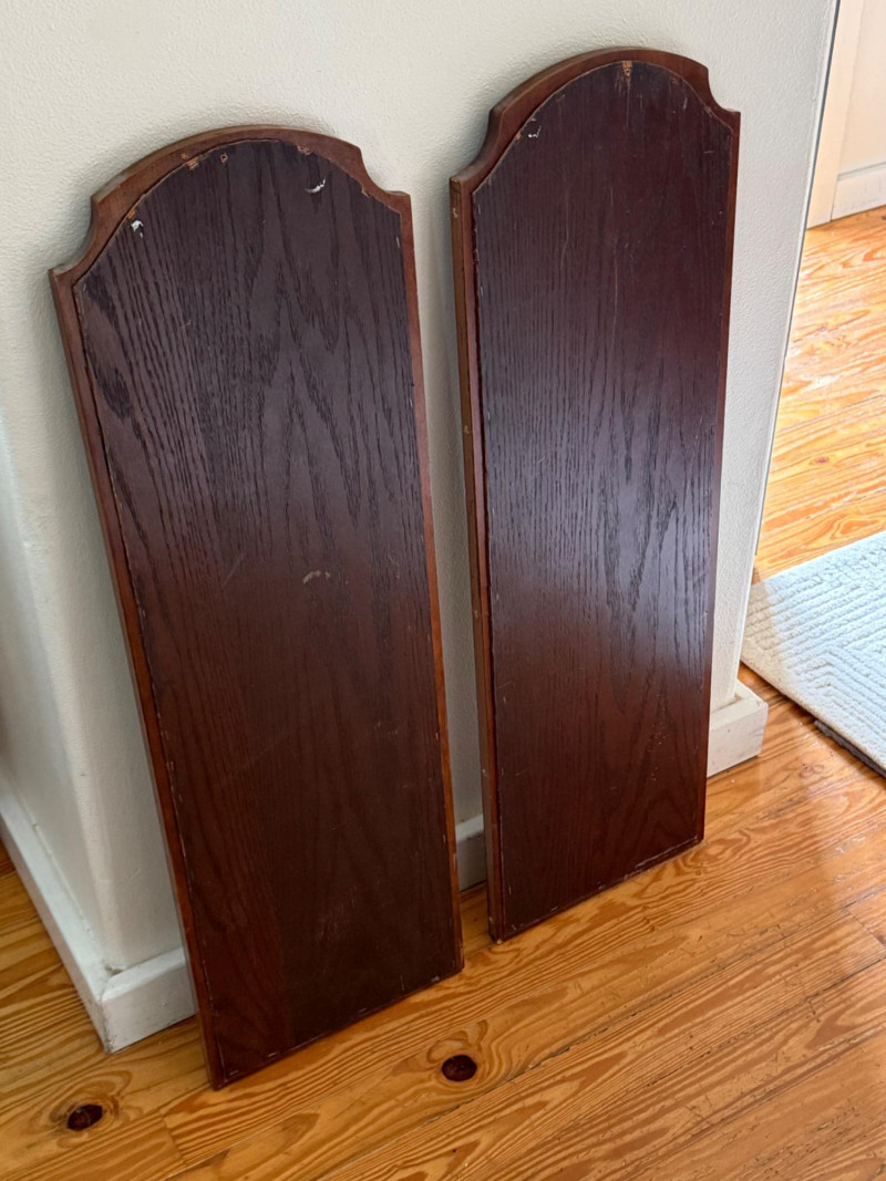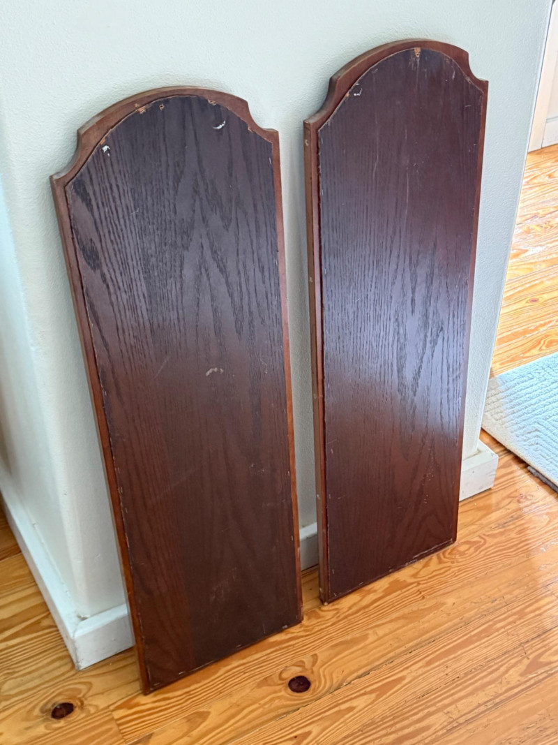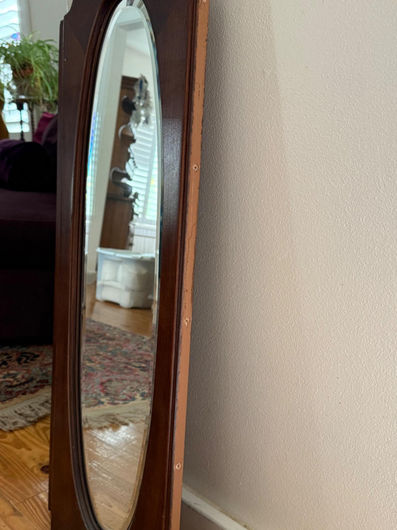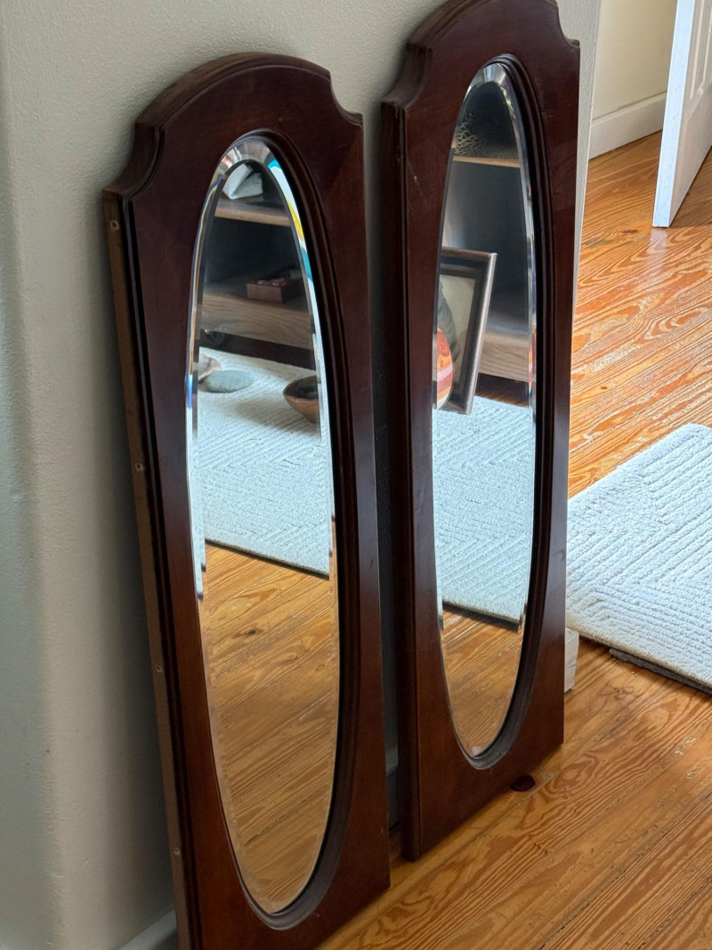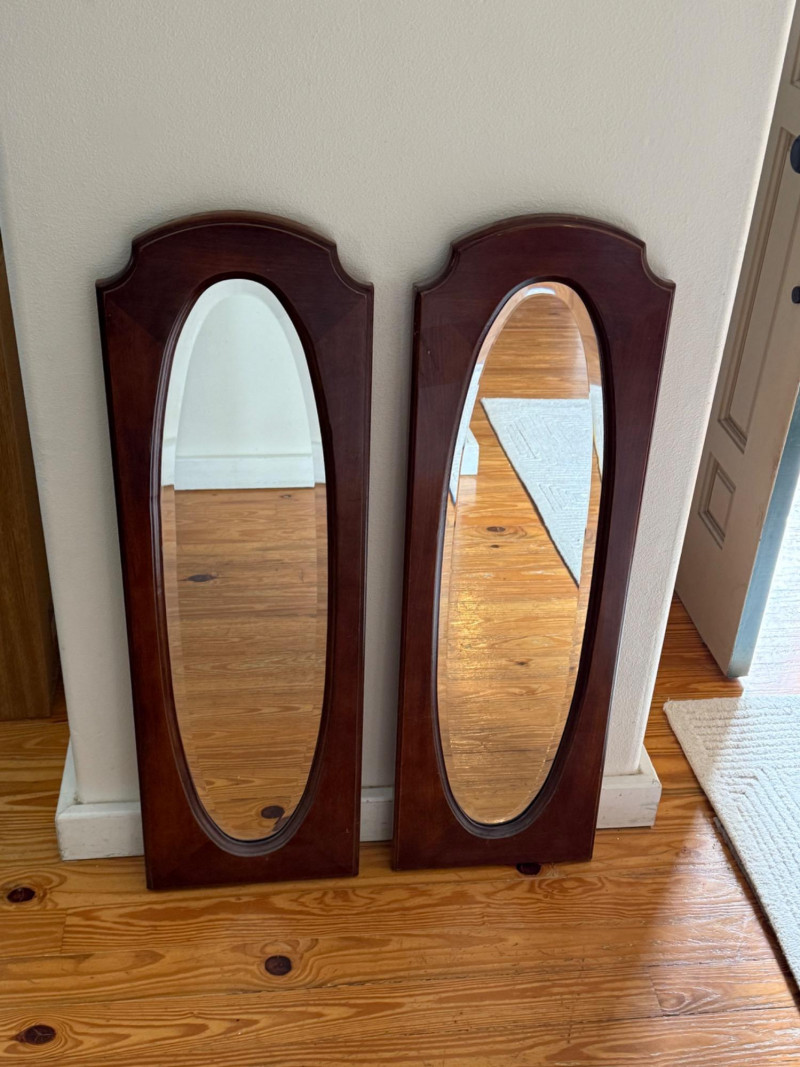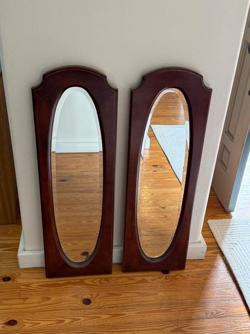 Pair of Vintage Wall Mirrors with Arched Wood Frames Set of two vintage wall mirrors featuring tall oval mirror glass inset in solid wood frames with arched tops and beveled detailing. The back panels are flat with pre-drilled holes for wall mounting. Dimensions (Each Mirror): 38" H x 12" W x 1" D