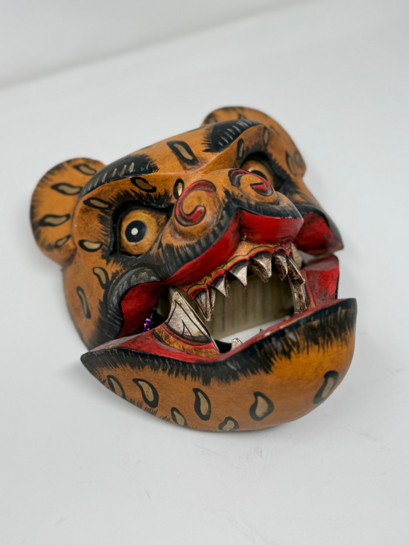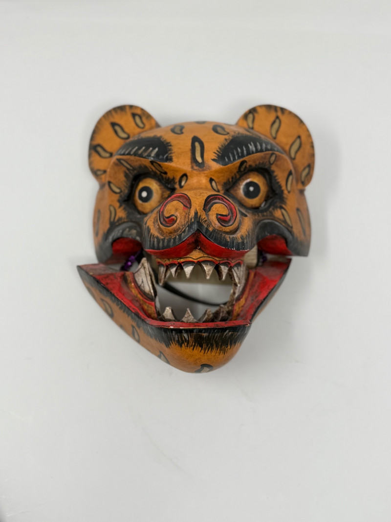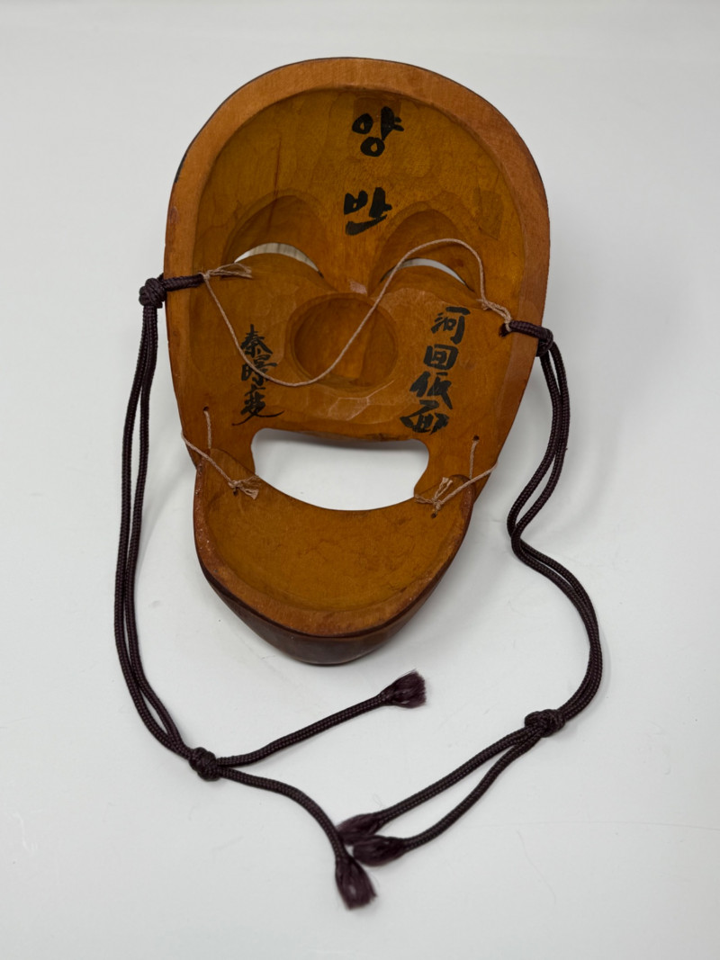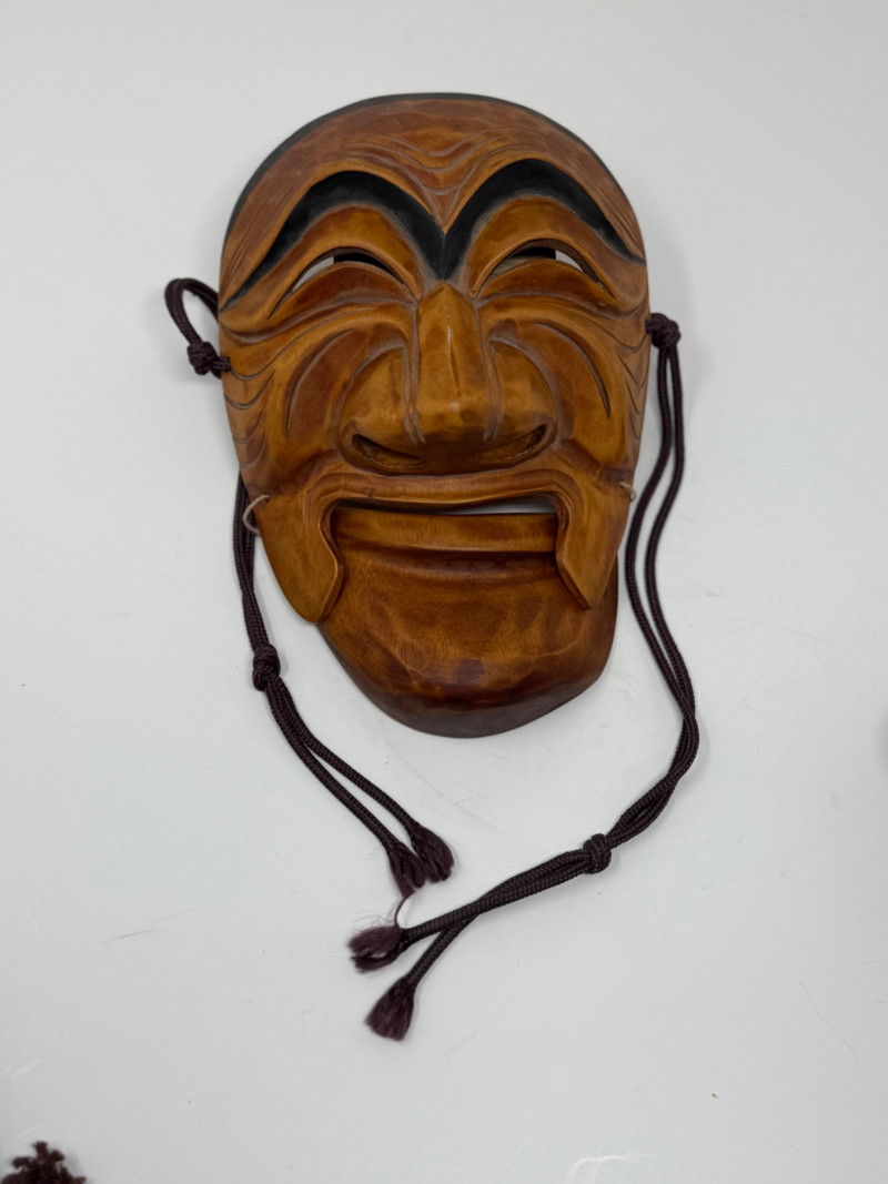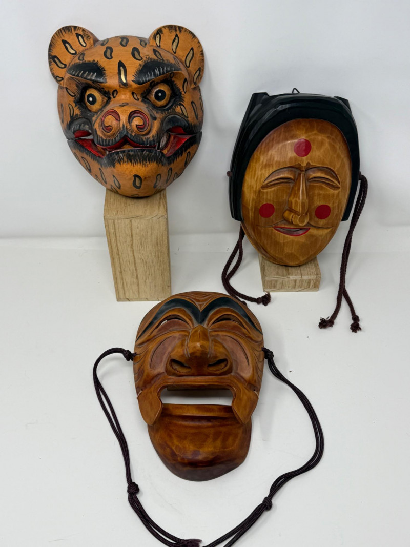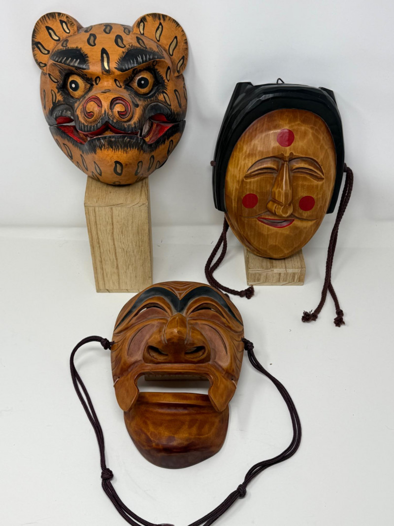 Three Vintage Korean Hahoetal Theater Masks with Movable Mouth Group of three vintage Korean Hahoetal-style theater masks carved from wood. These traditional masks represent characters from Korean folk plays. One features a movable jaw. Set includes: Tiger mask with painted details and carved teeth Female character mask with red facial markings and black headdress Male mask with prominent brows and movable lower jaw Measurements (each):