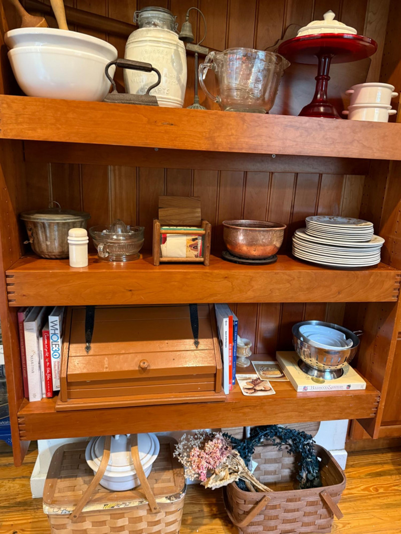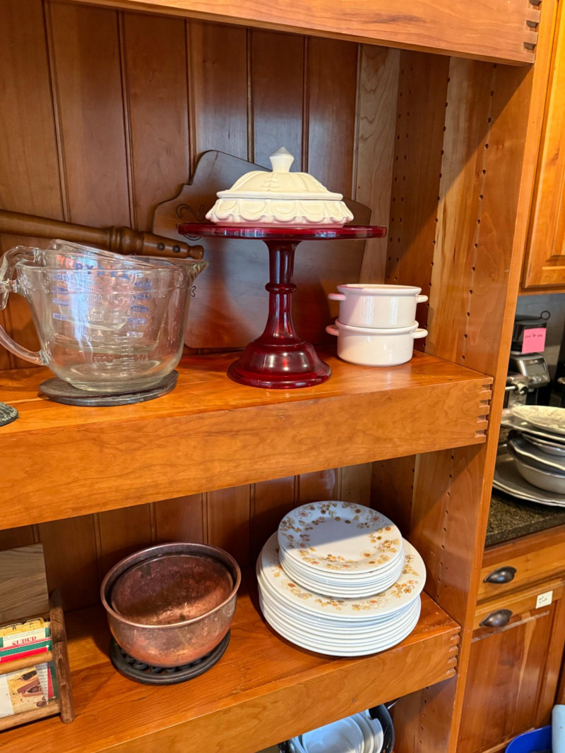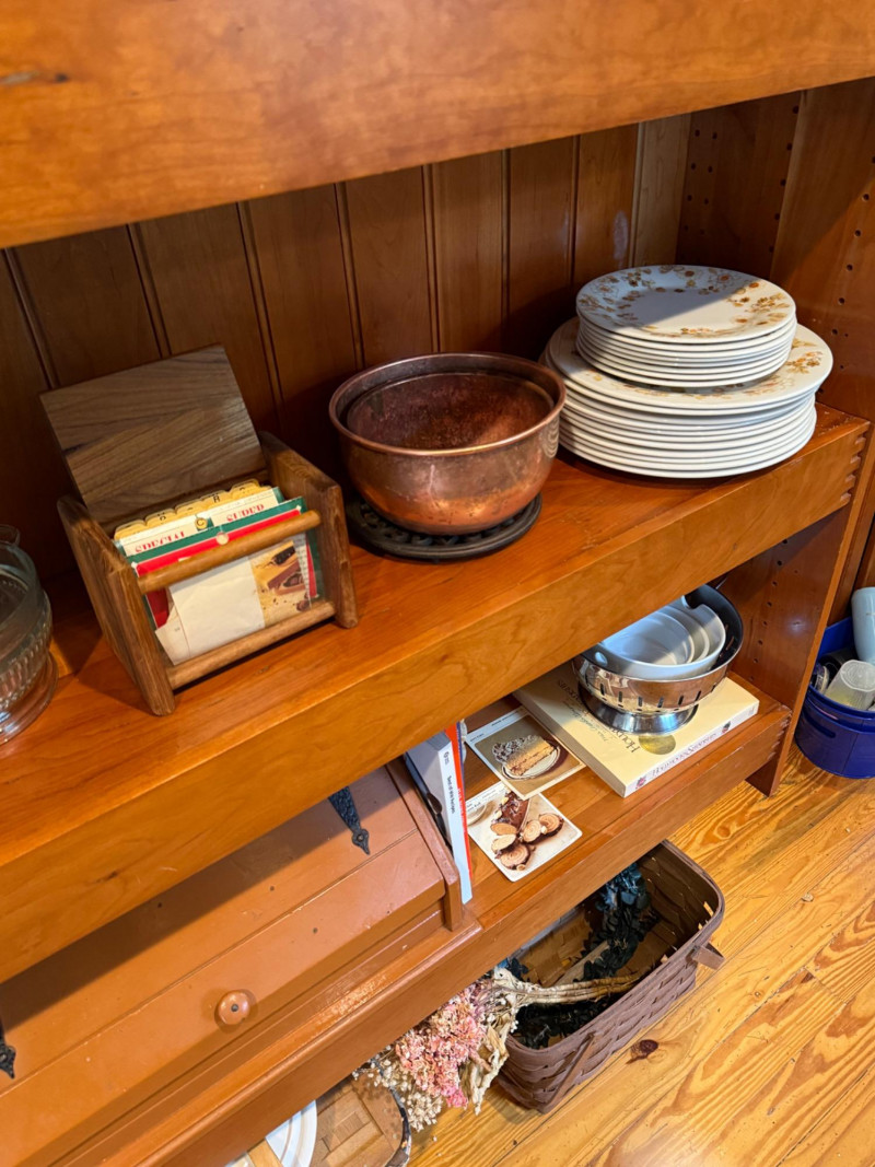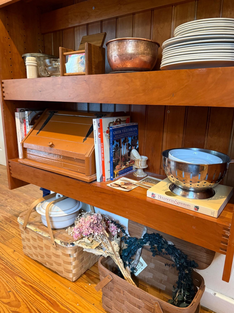 Full Country Kitchen Setup – Vintage Cookware, Decor & Books A complete, styled collection of vintage kitchenware and homey accents—suited for completing a warm country kitchen. This lot features a wide variety of functional and decorative items. includes: Vintage Pyrex mixing bowls and measuring cups Red pedestal cake stand with dome Copper mixing bowls Antique irons and rolling pins Recipe card box with vintage recipe cards Wooden drop-front bread box Stainless steel mixing bowls Cookbooks including “WHOLE30” and more Woven baskets and dried floral decor Note: Shelving is not included. Only the displayed contents are part of this lot.