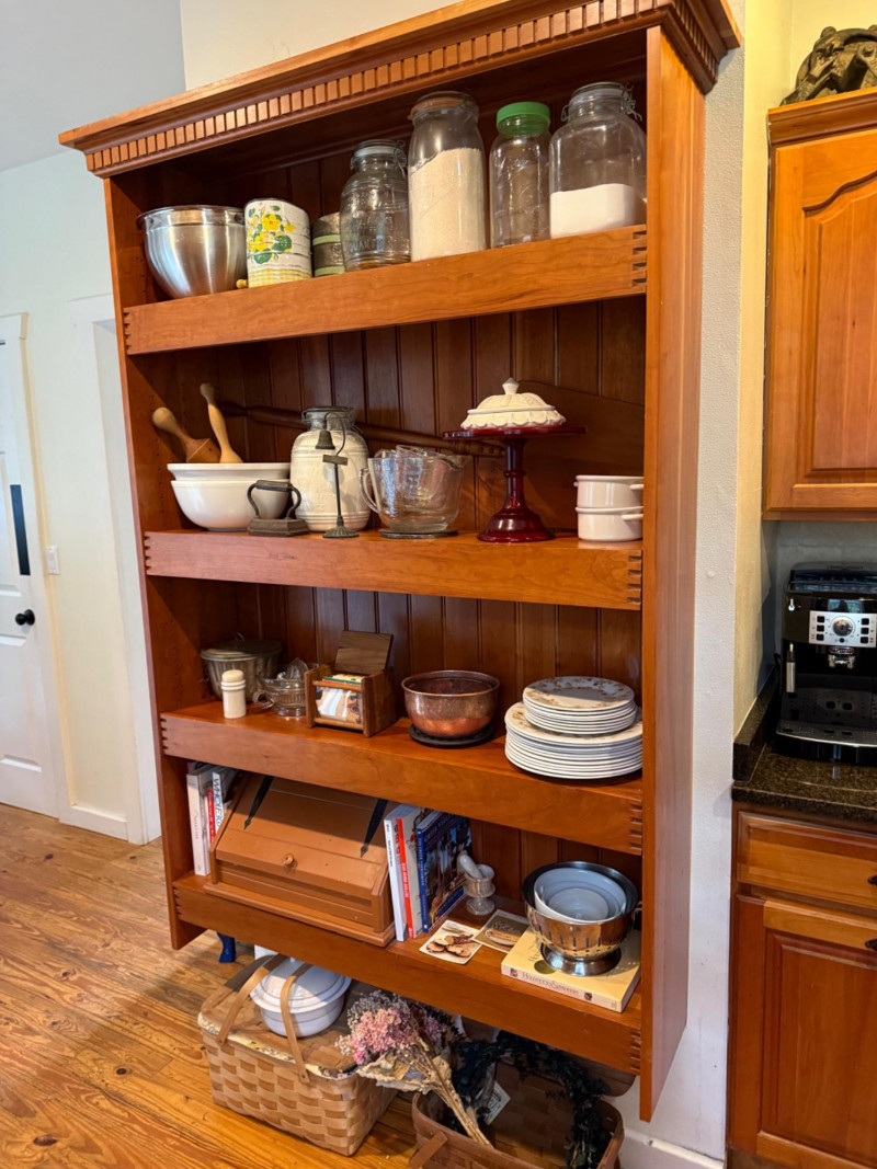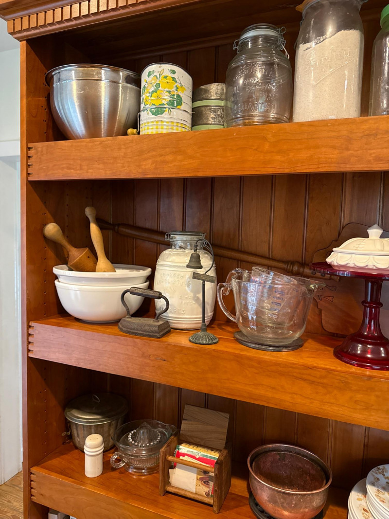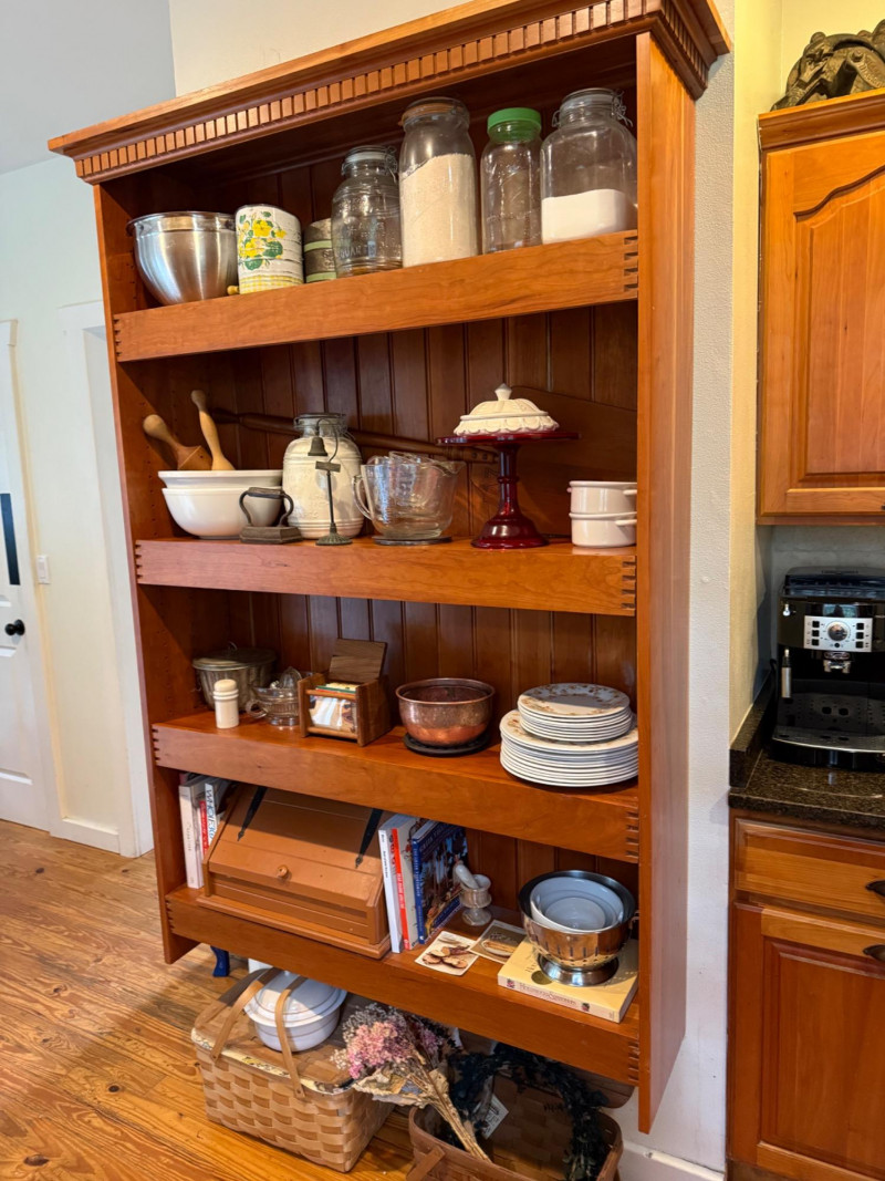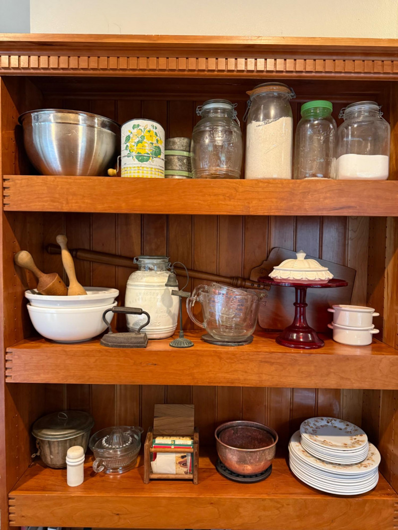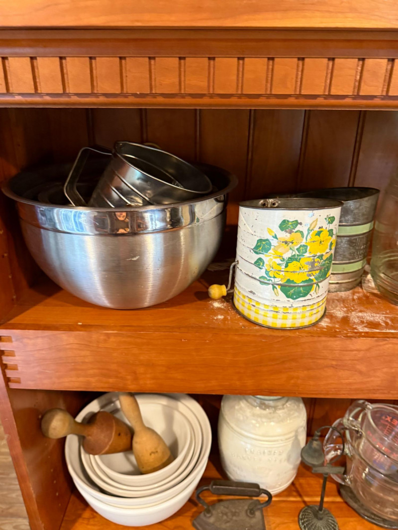 Full Country Kitchen Setup – Vintage Cookware, Decor & Books A complete, styled collection of vintage kitchenware and homey accents—suited for completing a warm country kitchen. This lot features a wide variety of functional and decorative items. includes: Vintage Pyrex mixing bowls and measuring cups Red pedestal cake stand with dome Copper mixing bowls Antique irons and rolling pins Recipe card box with vintage recipe cards Wooden drop-front bread box Stainless steel mixing bowls Cookbooks including “WHOLE30” and more Woven baskets and dried floral decor Note: Shelving is not included. Only the displayed contents are part of this lot.