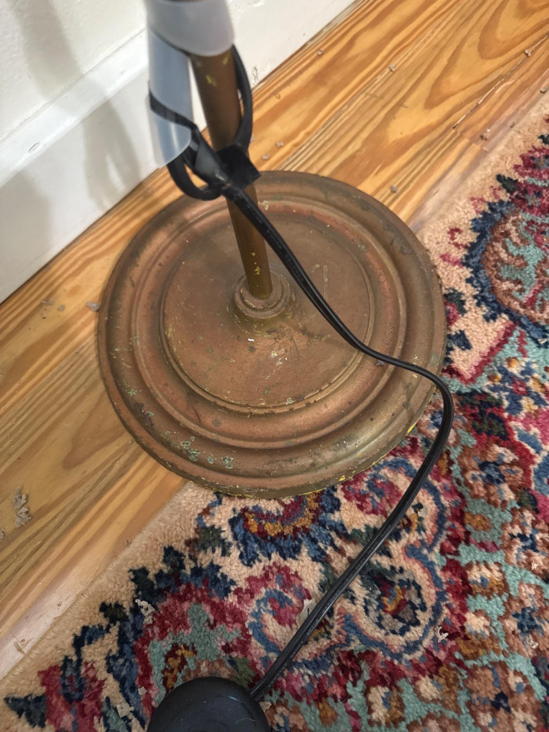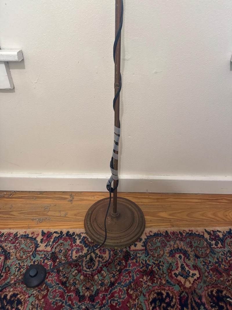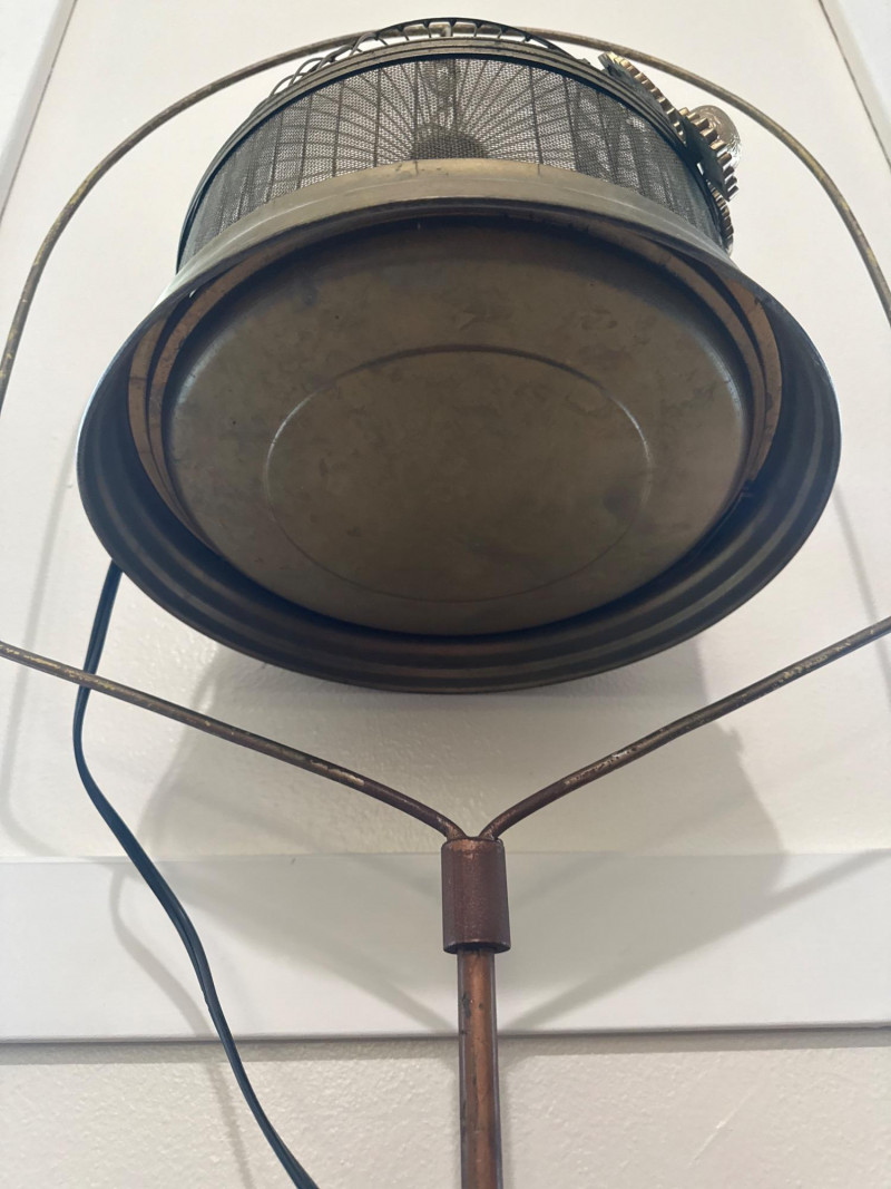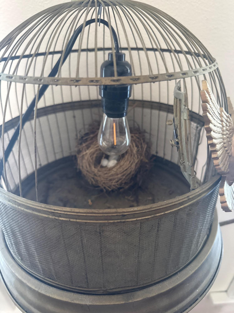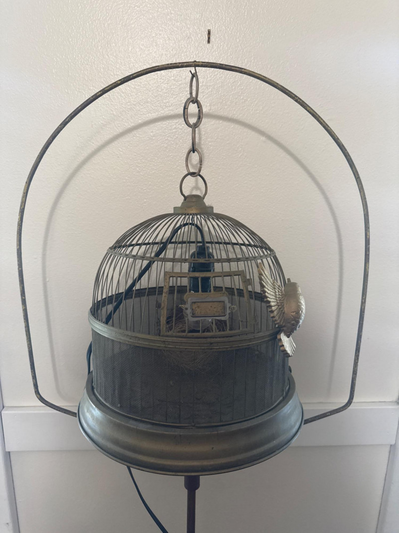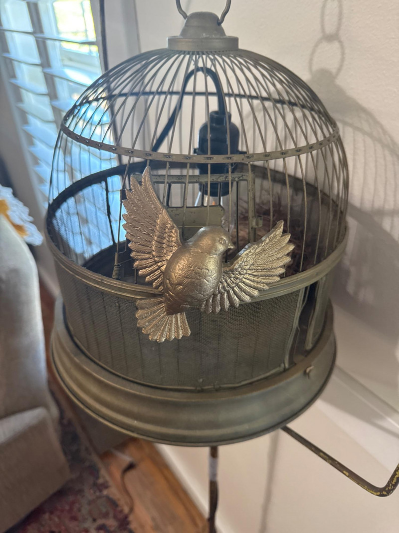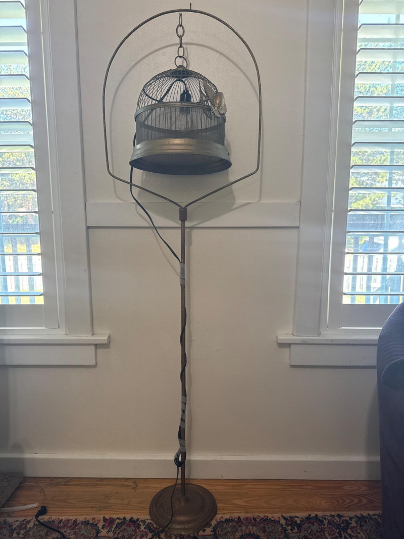 Vintage Repurposed Bird Cage Converted Floor Lamp Floor lamp made from a repurposed vintage bird cage. The cage houses a central light socket with a decorative bird nest and faux bird detail. The fixture is supported by a curved metal stand and weighted base. Power cord extends from the stand and includes a standard plug. Note: Light socket and plug are functional. Decorative bird and nest are included.