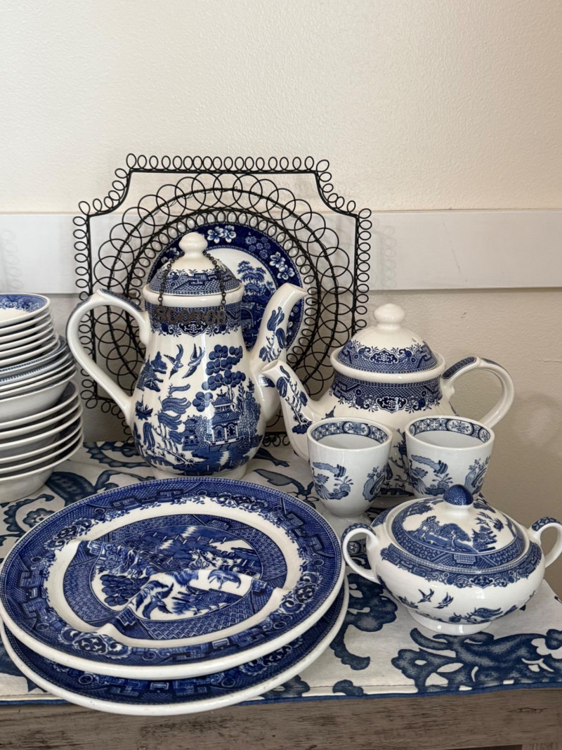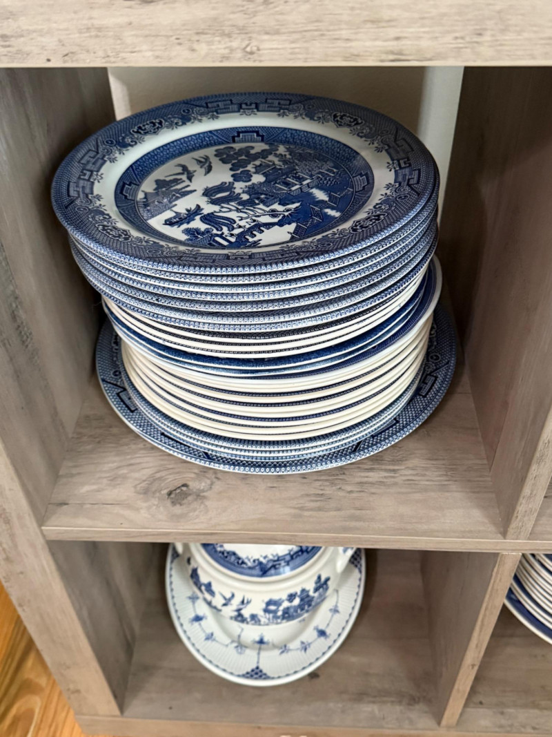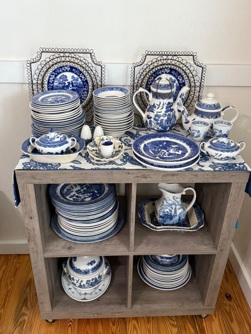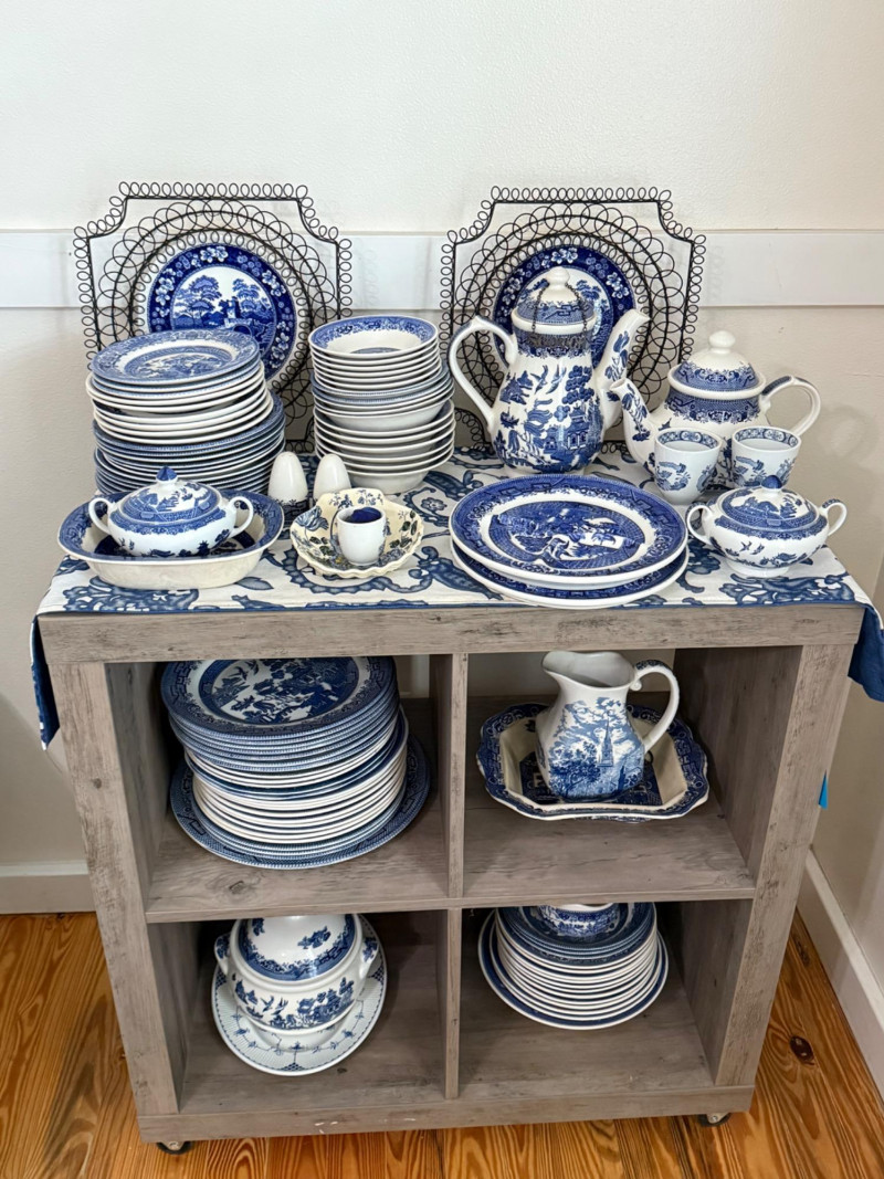 Very Large Group of Blue Willow China with Cabinet on Wheels Extensive collection of Blue Willow patterned china in a traditional blue-and-white design. The set includes a variety of dinnerware and serveware such as dinner plates, salad plates, bread plates, bowls, teacups, saucers, serving platters, pitchers, teapots, sugar bowls, creamers, and lidded soup tureens. All items are arranged on and inside a wooden storage cabinet with four cubbies and caster wheels for mobility. Cabinet Dimensions:
