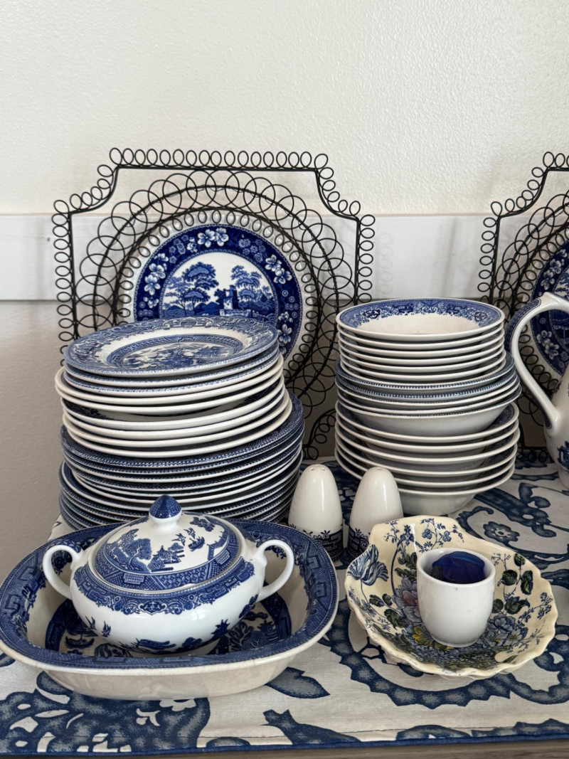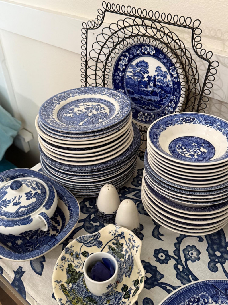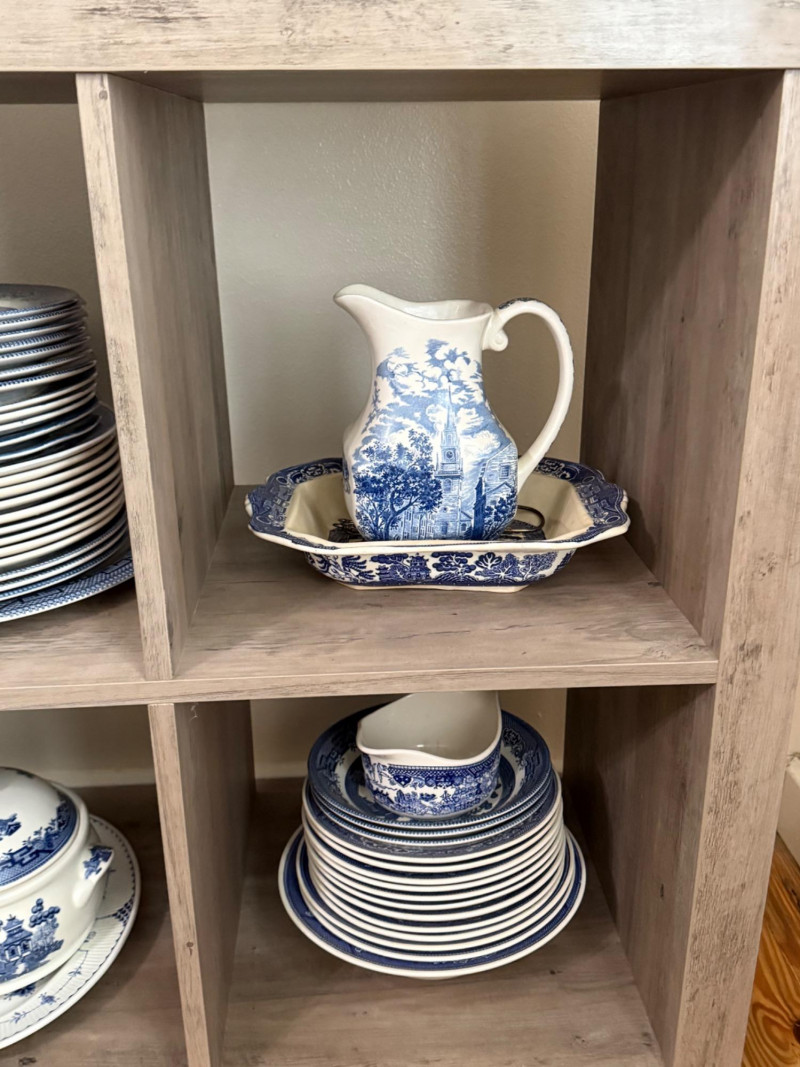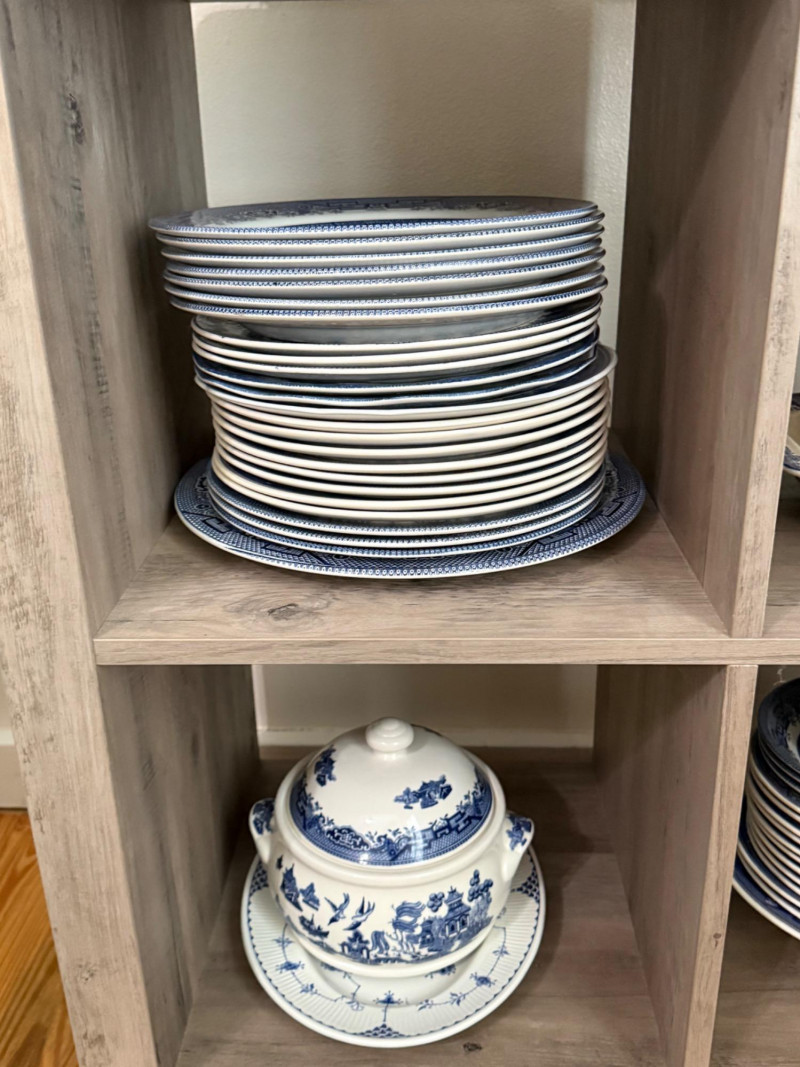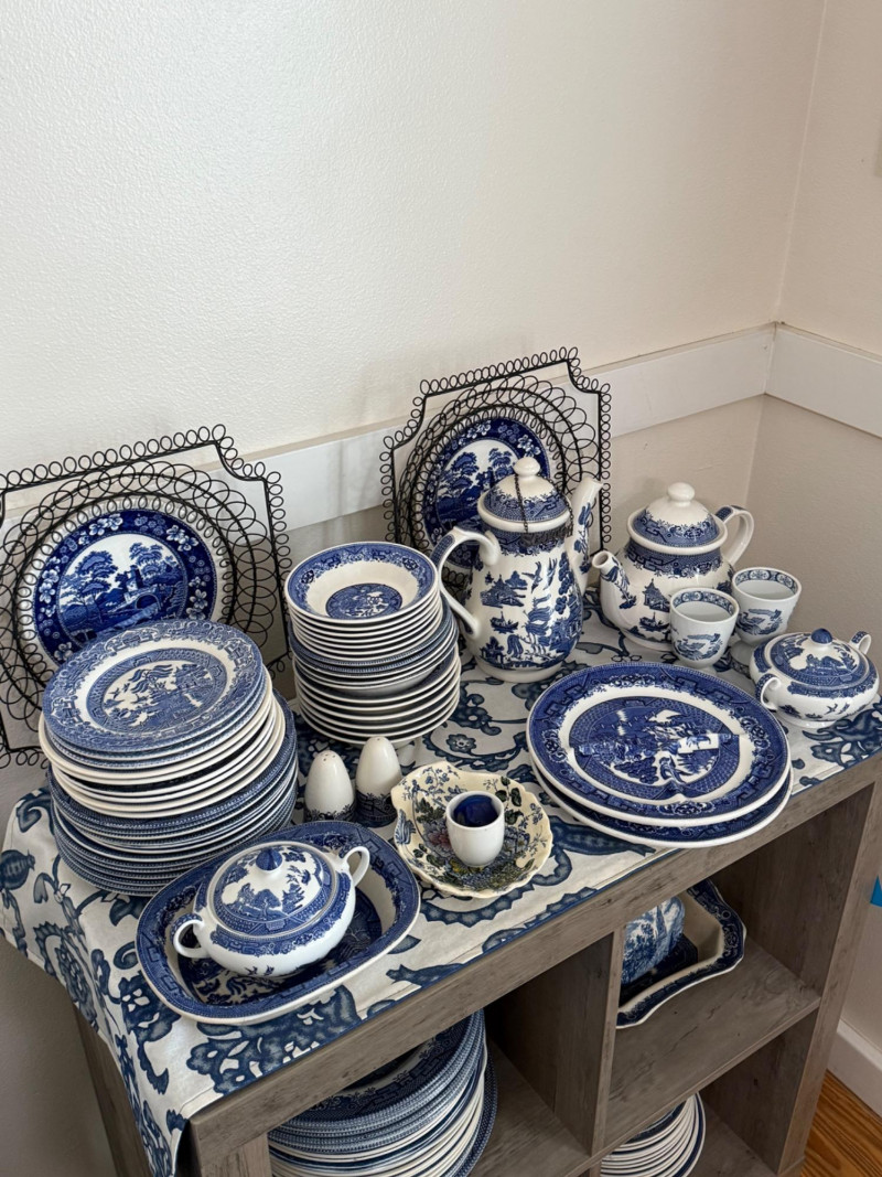 Very Large Group of Blue Willow China with Cabinet on Wheels Extensive collection of Blue Willow patterned china in a traditional blue-and-white design. The set includes a variety of dinnerware and serveware such as dinner plates, salad plates, bread plates, bowls, teacups, saucers, serving platters, pitchers, teapots, sugar bowls, creamers, and lidded soup tureens. All items are arranged on and inside a wooden storage cabinet with four cubbies and caster wheels for mobility. Cabinet Dimensions: