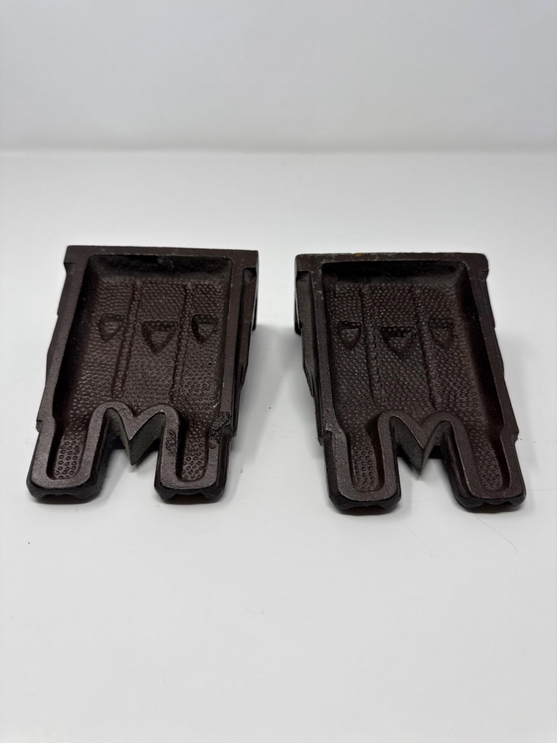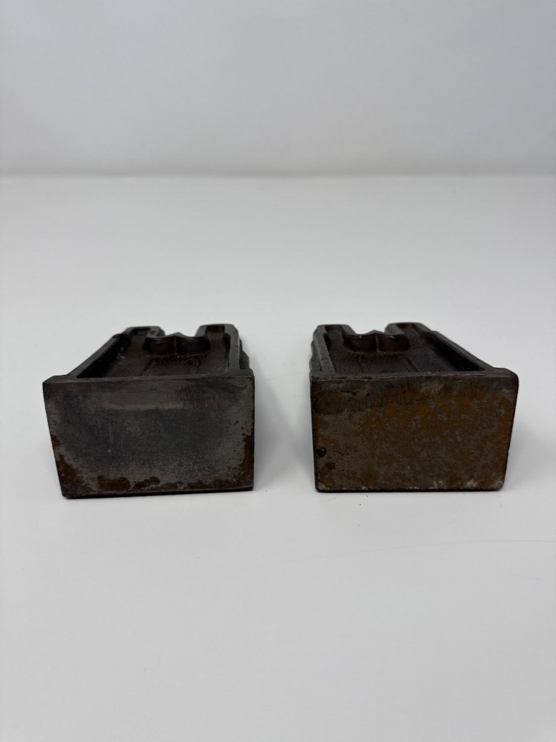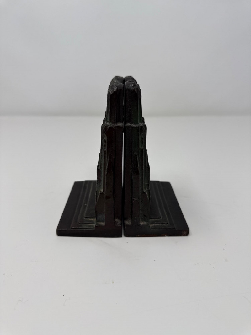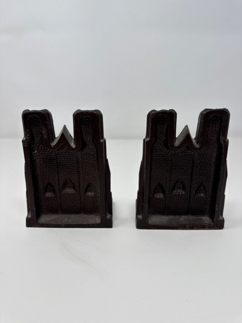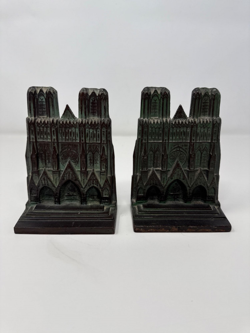 Two Vintage Notre-Dame Cathedral Doorstops Set of two vintage doorstops depicting the façade of the Notre-Dame Cathedral in Paris. Each piece features detailed Gothic architectural elements including twin towers, rose windows, and pointed arches. Constructed from cast metal—likely iron or spelter—with a dark bronze finish and areas of green patina. Hollow backs with flat stepped bases.